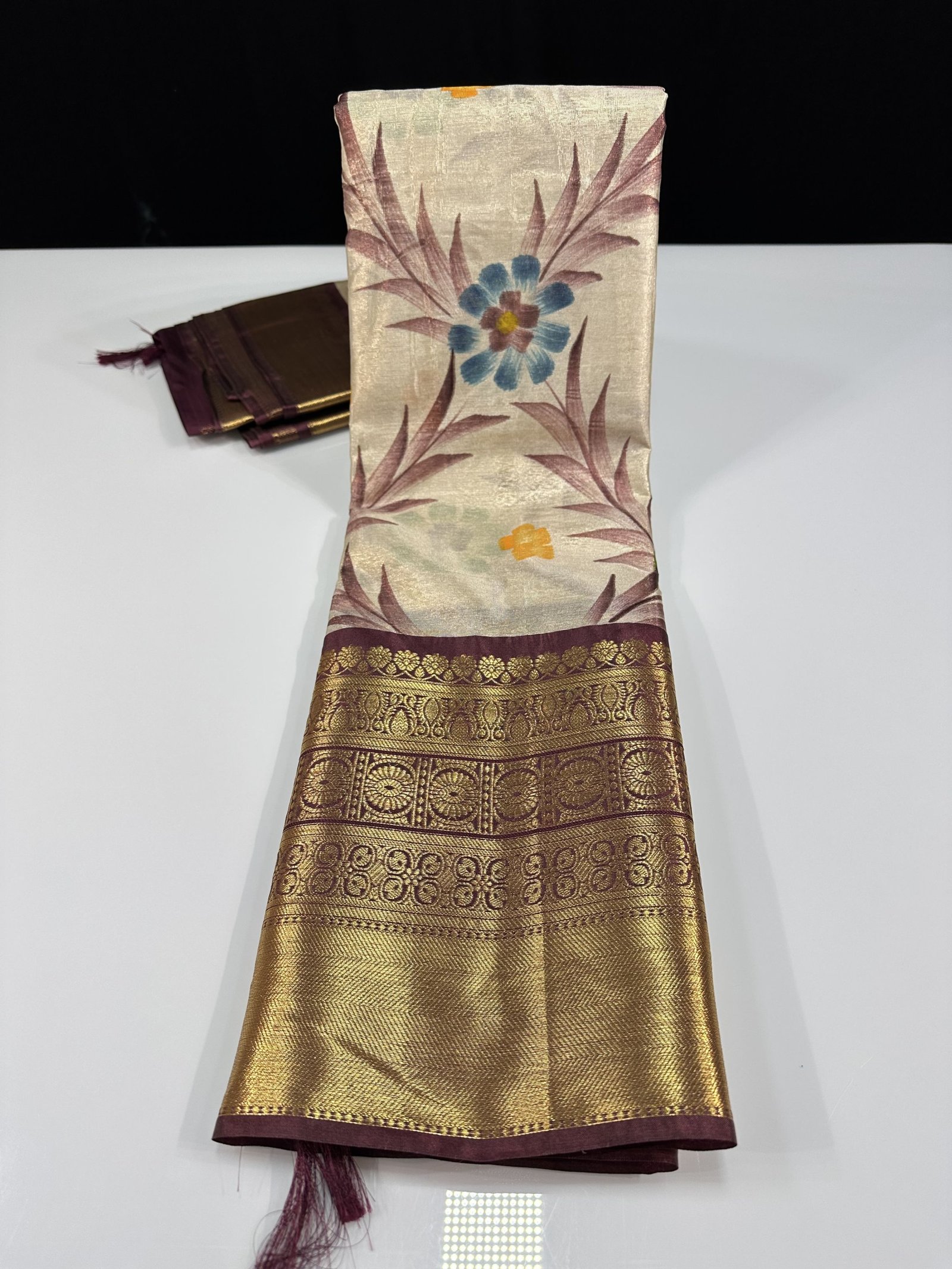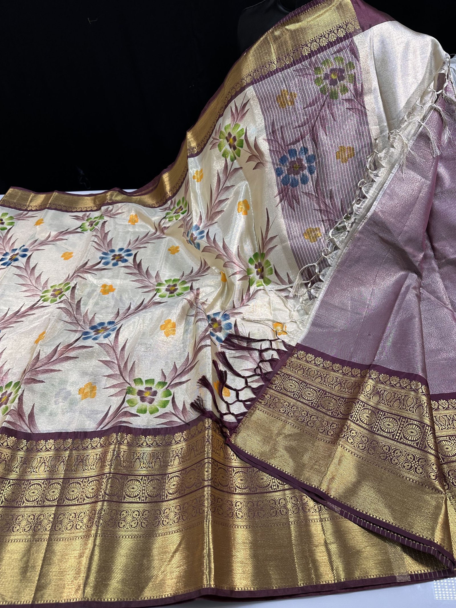 A soft and lightweight Banarasi tissue silk saree featuring an elegant hand-painted jaal pattern flowing across the body. The delicate artwork is beautifully complemented by a contrast border inspired by classic Kanchi designs, adding a refined traditional touch. Easy to drape and graceful in appeal, this saree is perfect for effortless elegance with artistic charm.