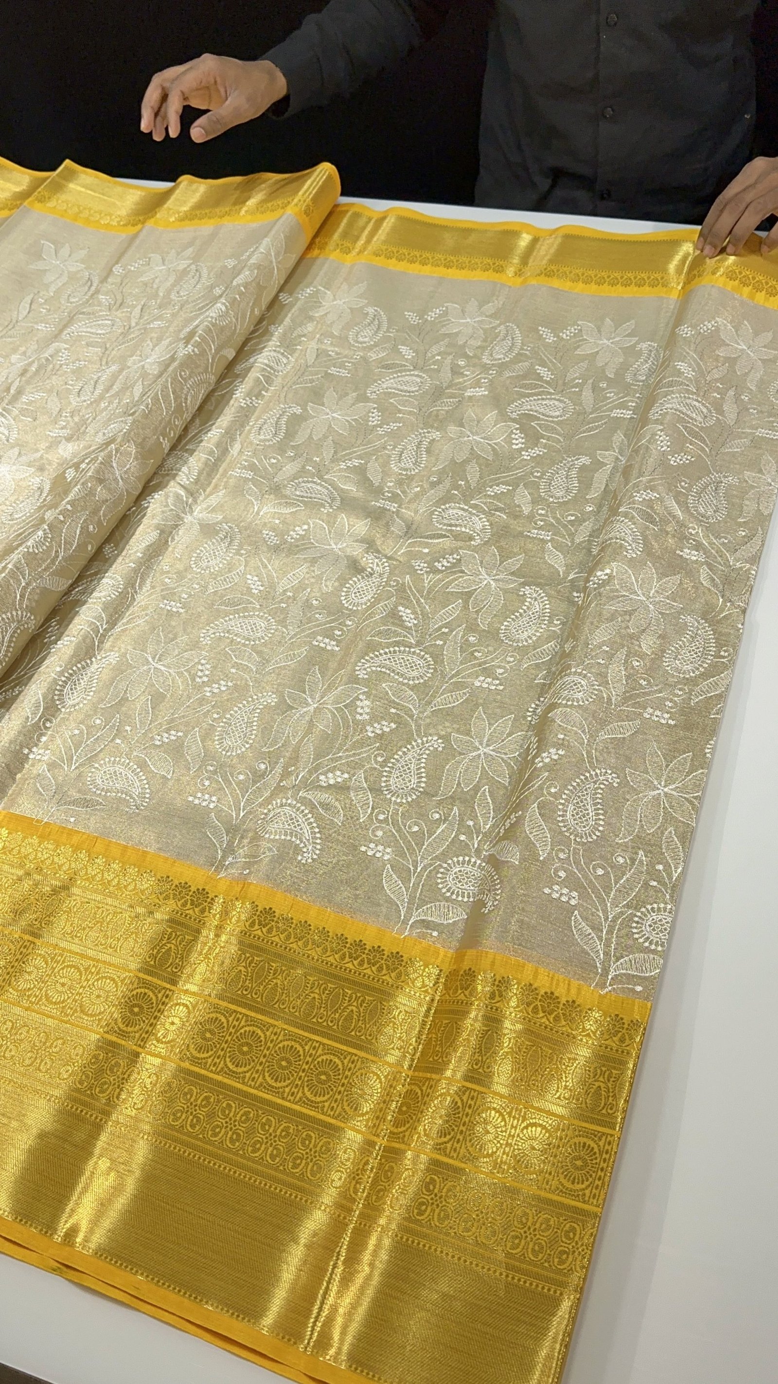 Grace meets artistry in this Soft Banarasi Semi-Tissue Silk Saree, exquisitely enhanced with Chikankari–inspired embroidery jaal crafted in elegant off-white thread. The lightweight semi-tissue silk fabric offers a soft, fluid drape with a gentle sheen, making it comfortable yet striking. The intricate jaal embroidery spread across the body adds depth and texture, drawing inspiration from classic motifs while maintaining a refined, contemporary appeal. Perfect for festive occasions, weddings, and elegant gatherings, this saree is a beautiful blend of tradition, craftsmanship, and modern sophistication.
