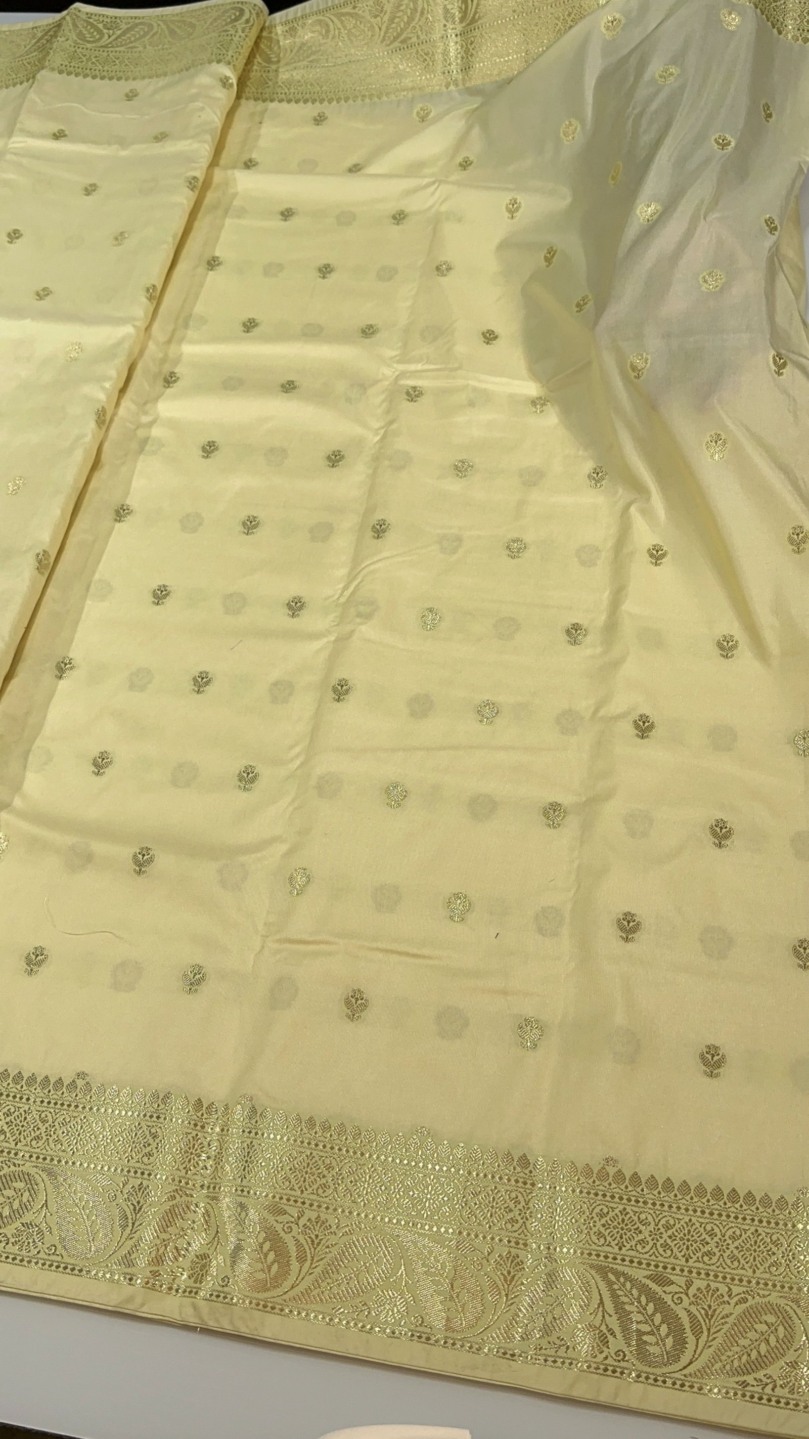 The body is adorned with khadi-inspired small zari boti weaving, lending a subtle handcrafted appeal and timeless texture to the drape. Each boti is delicately placed, enhancing the saree’s elegance without overpowering its simplicity.