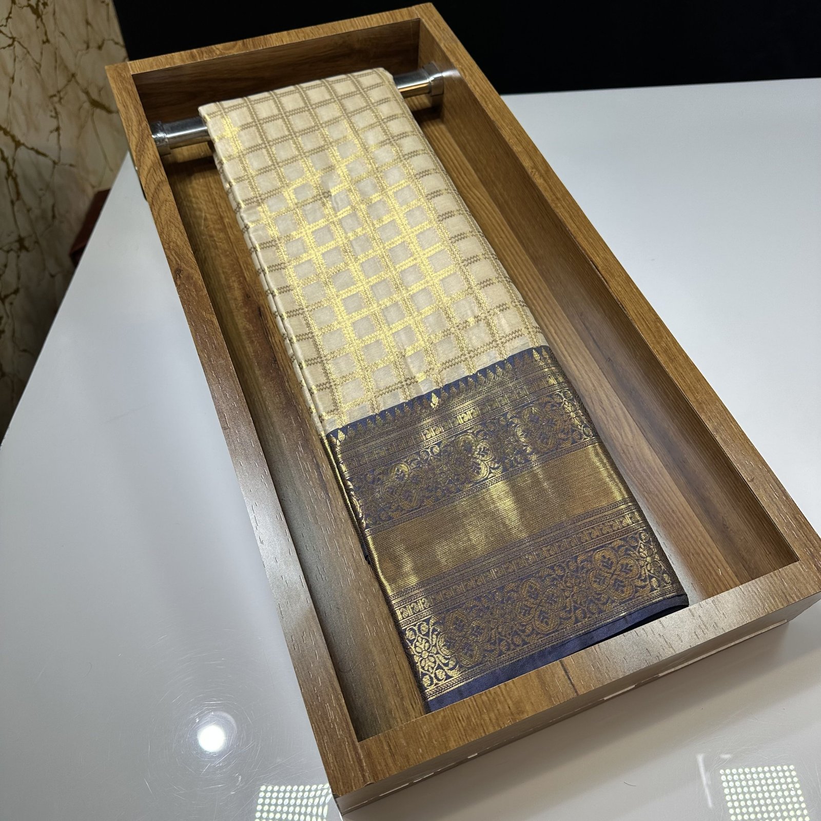Enhancing its beauty is the striking contrast weaving border, inspired by traditional Banji patterns, adding depth and a bold visual appeal to the overall look. The softness of the fabric ensures a smooth, body-hugging fall, making it lightweight, breathable, and effortlessly graceful to carry for long hours.