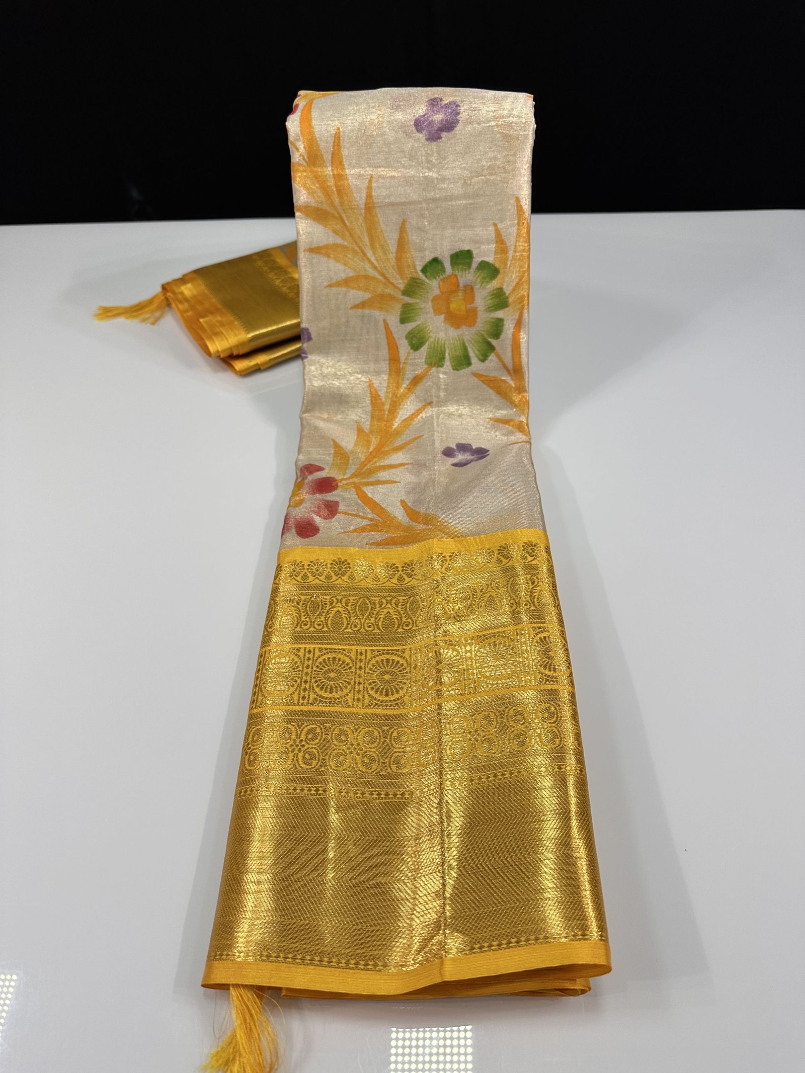 SOFT BANARASI TISSUE SILK SAREE WITH HAND PAINTED FLORAL JAAL ALLOVER SAREE