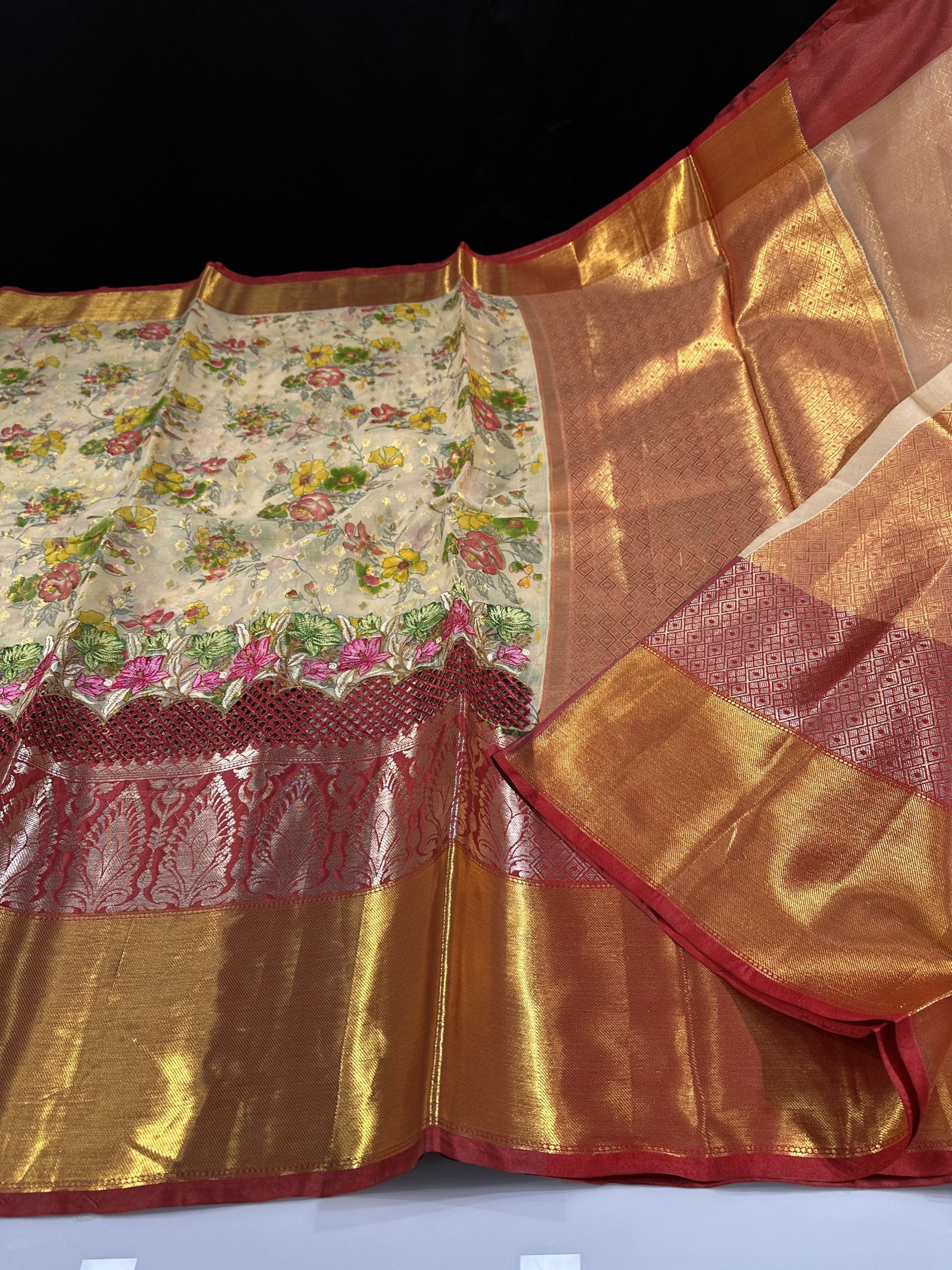 SOFT SEMI-KANCHI KORA SAREE WITH EMBROIDERY AND CUTWORK OVER WEAVING KANCHI BORDER