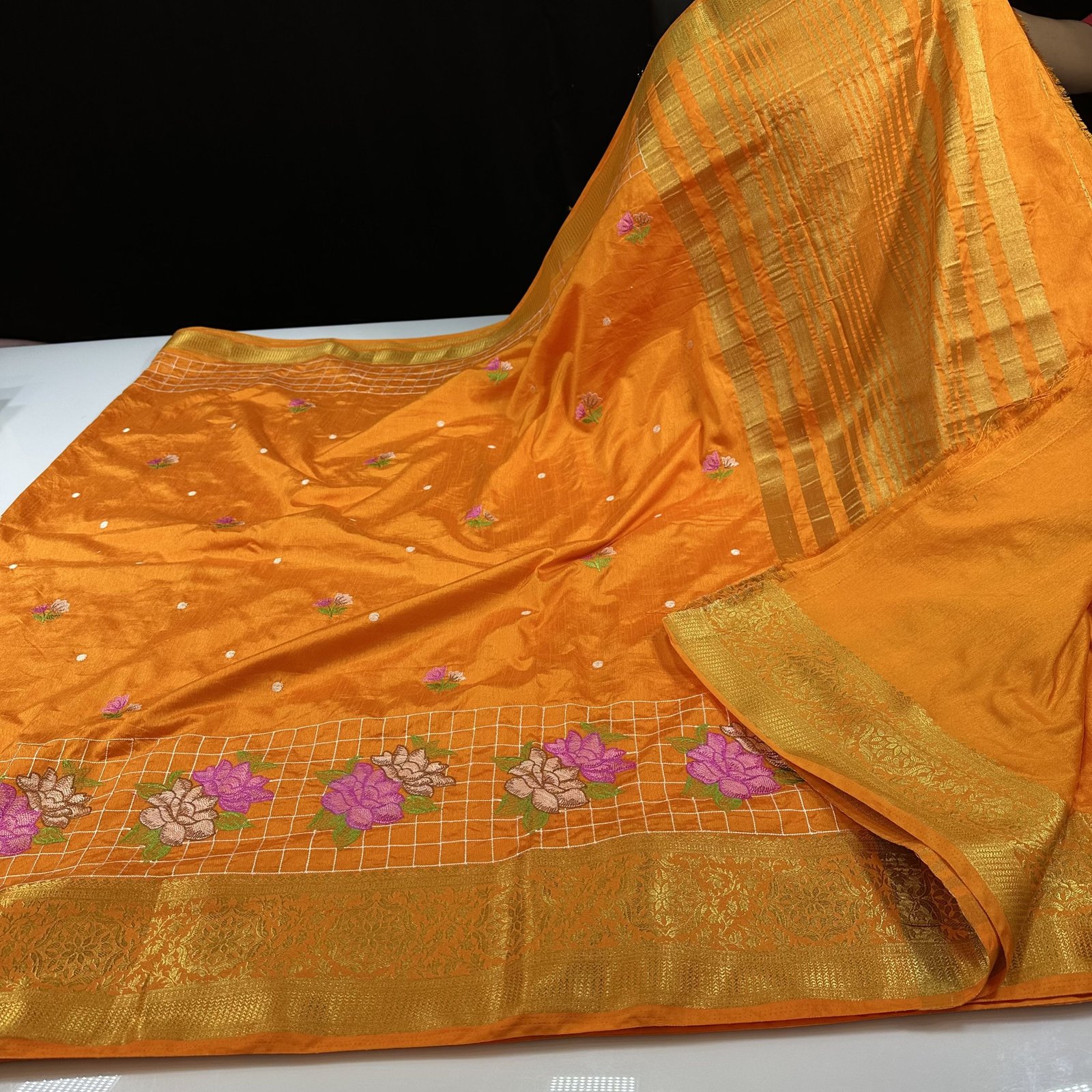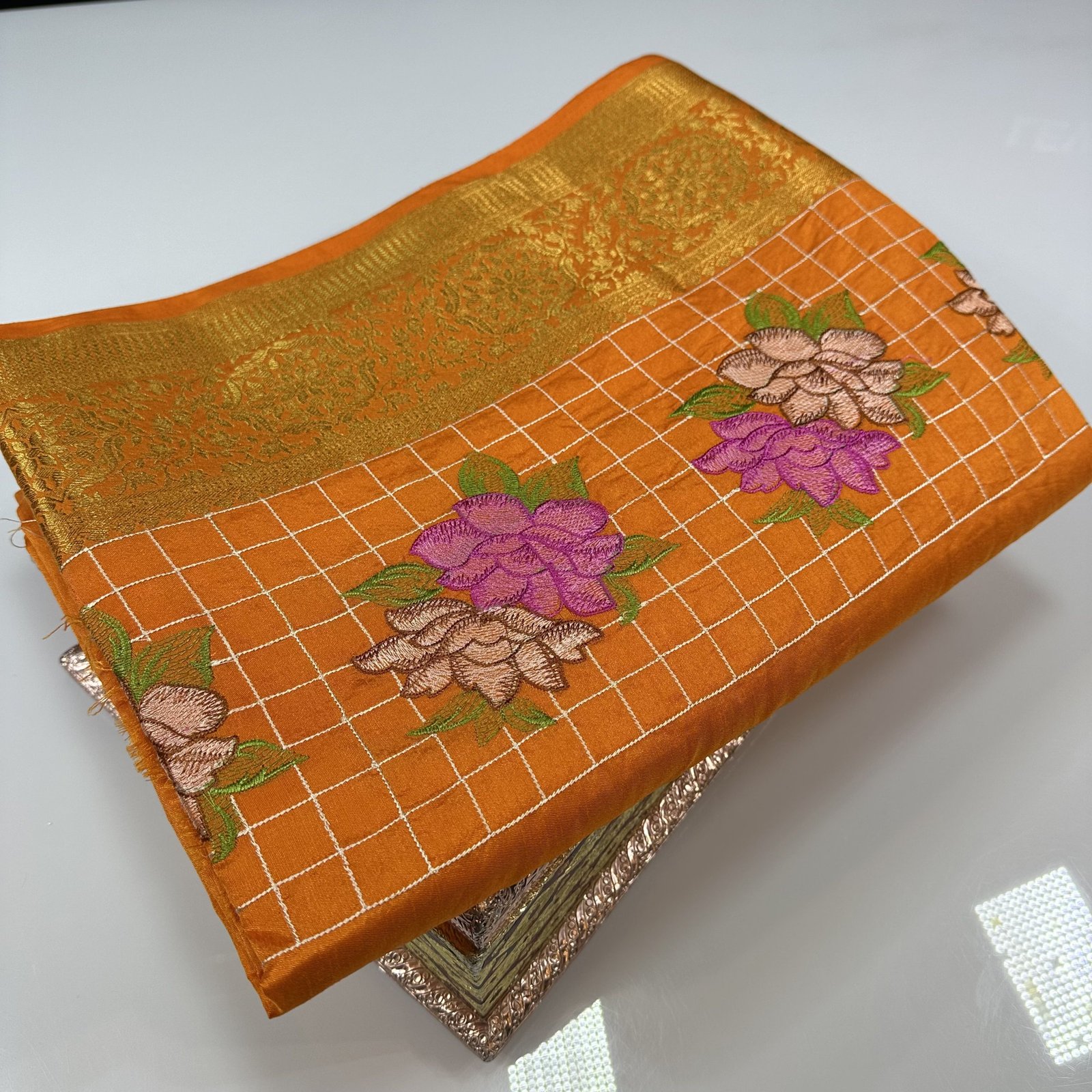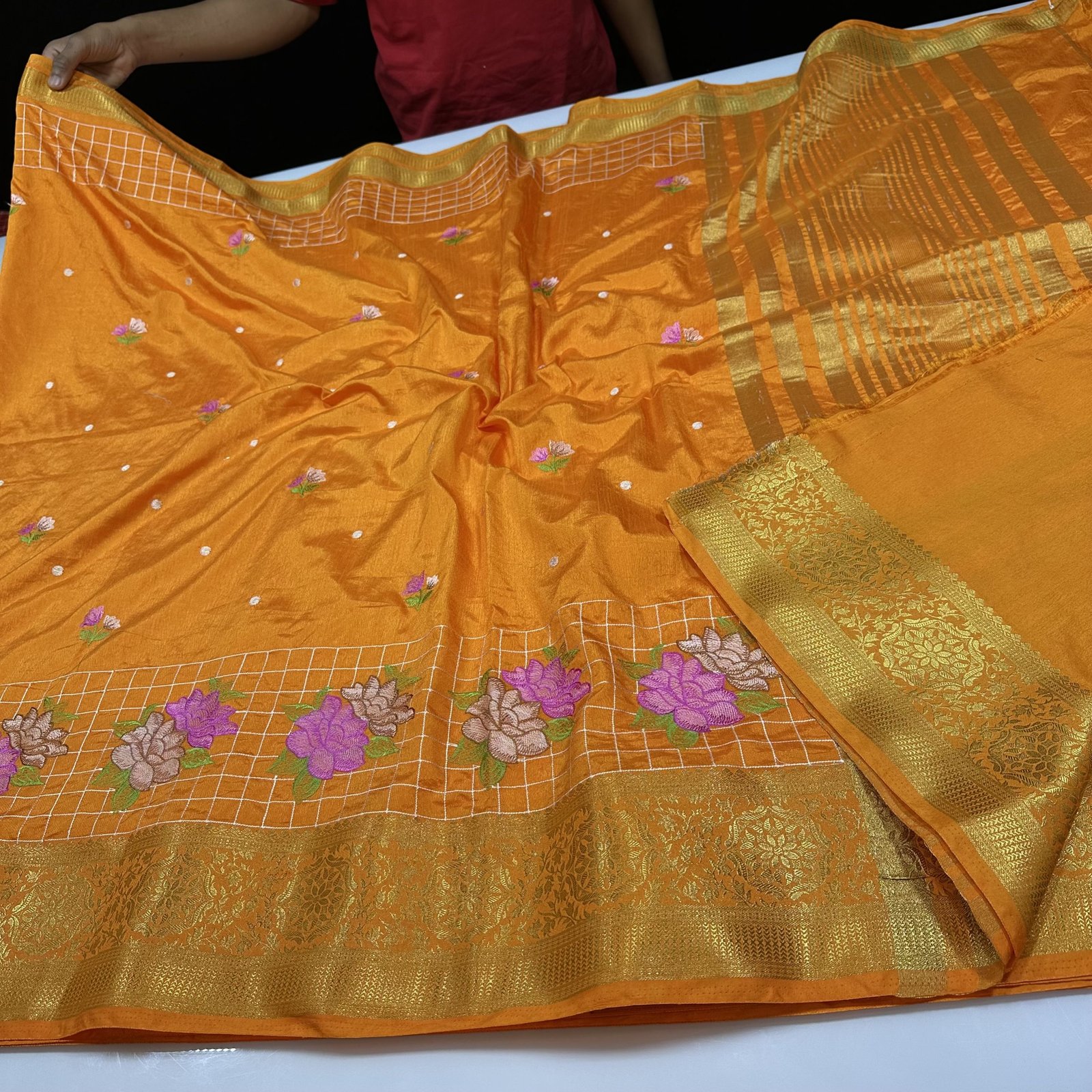 A graceful expression of tradition and artistry, this soft Dola silk saree is designed to drape like a dream with its smooth, fluid texture and lightweight feel. The saree features exquisite embroidery work adorning the upper border, adding a touch of regal charm and intricate detailing. What truly sets this piece apart is the delicate embroidery scattered beautifully across the body, creating a subtle yet captivating visual rhythm. The harmonious placement of these motifs enhances the overall elegance, making it perfect for both festive occasions and intimate celebrations.