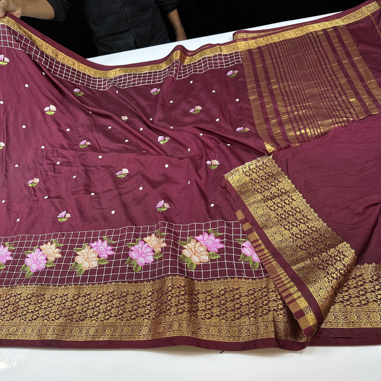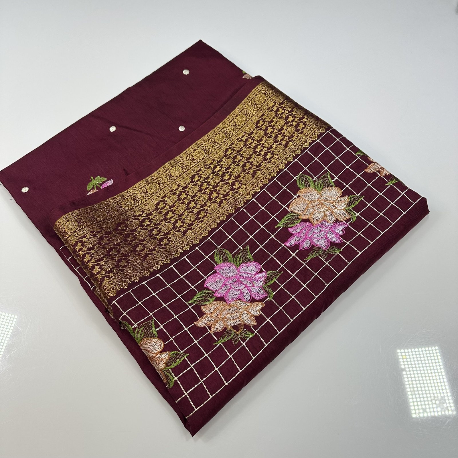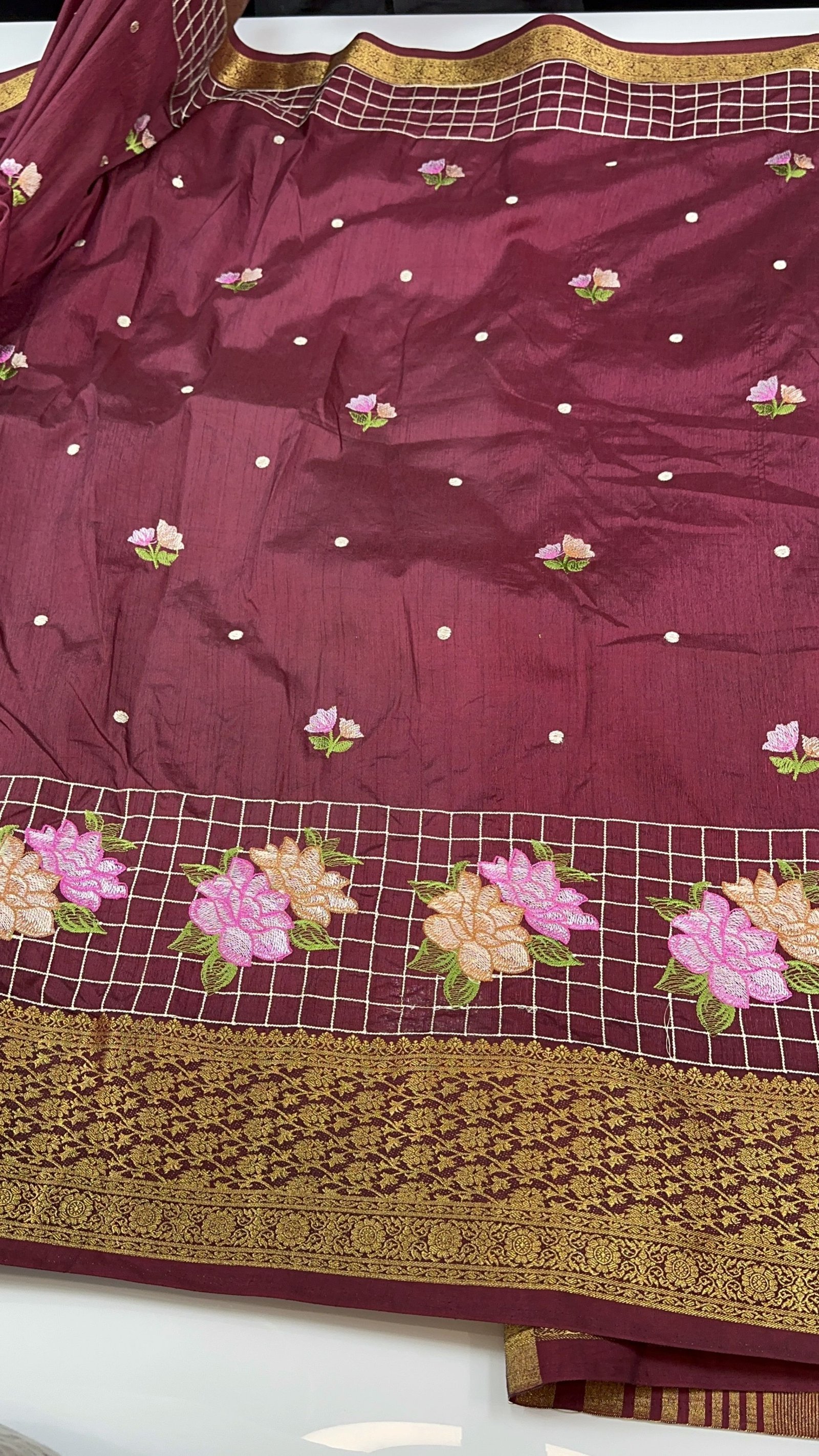 A graceful expression of tradition and artistry, this soft Dola silk saree is designed to drape like a dream with its smooth, fluid texture and lightweight feel. The saree features exquisite embroidery work adorning the upper border, adding a touch of regal charm and intricate detailing. What truly sets this piece apart is the delicate embroidery scattered beautifully across the body, creating a subtle yet captivating visual rhythm. The harmonious placement of these motifs enhances the overall elegance, making it perfect for both festive occasions and intimate celebrations.