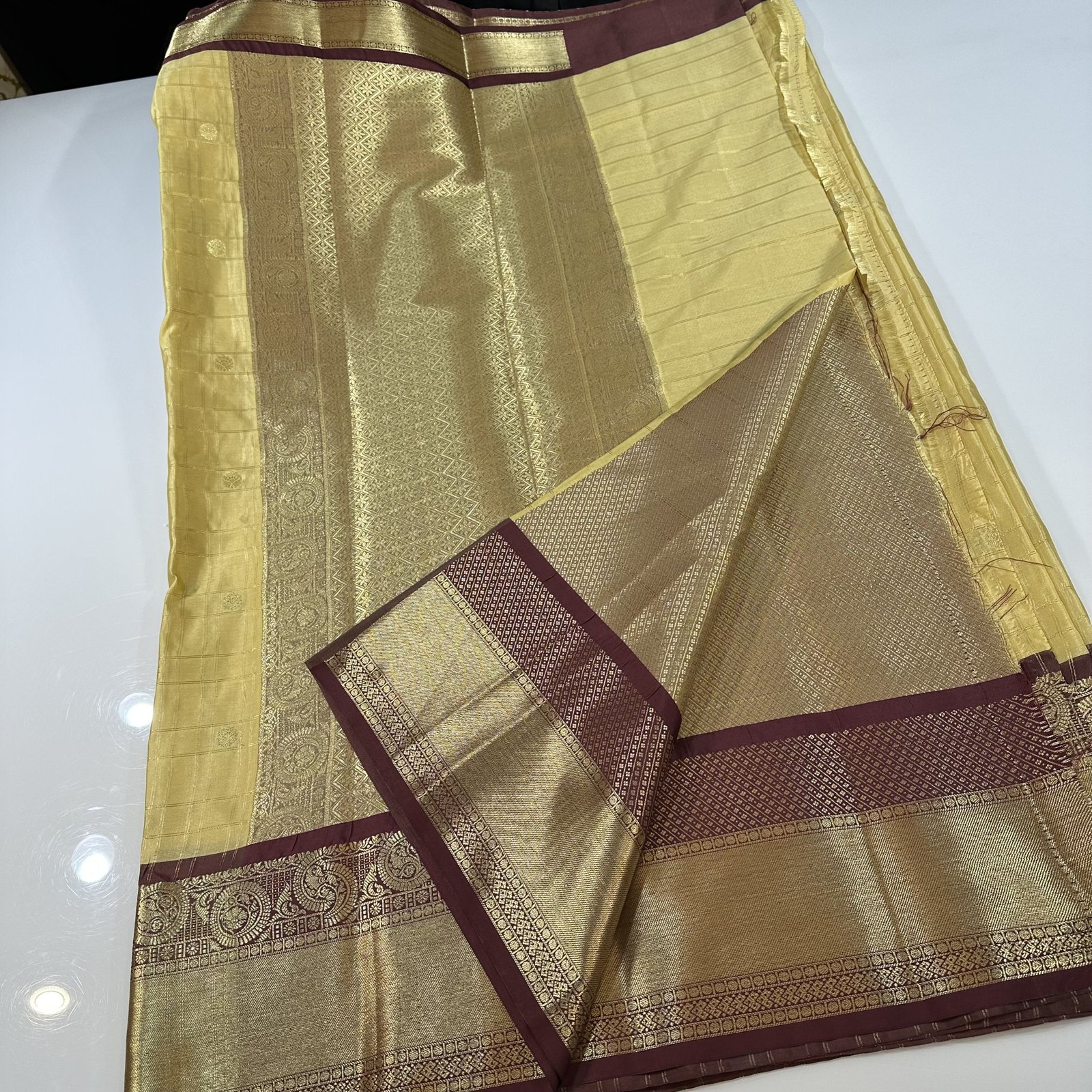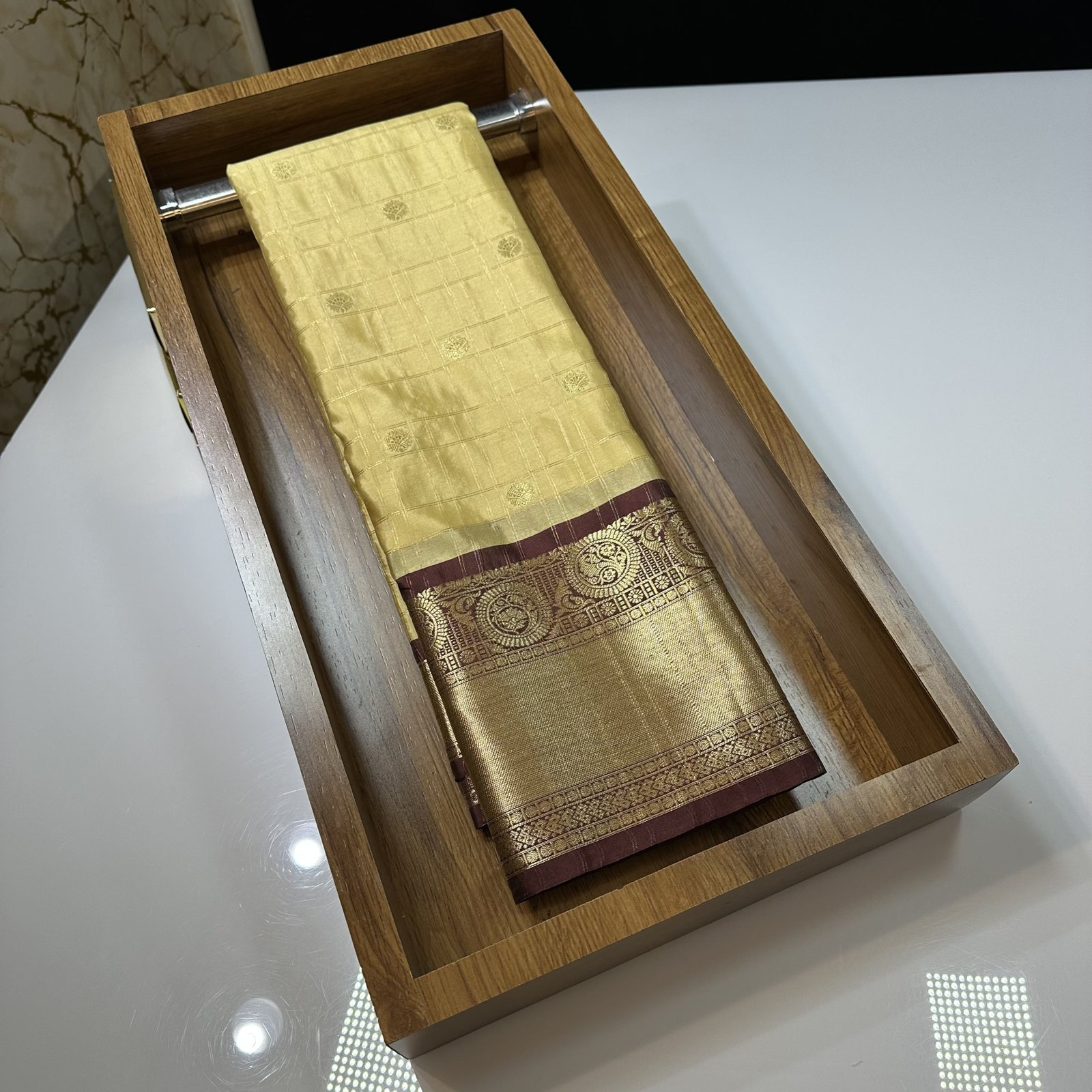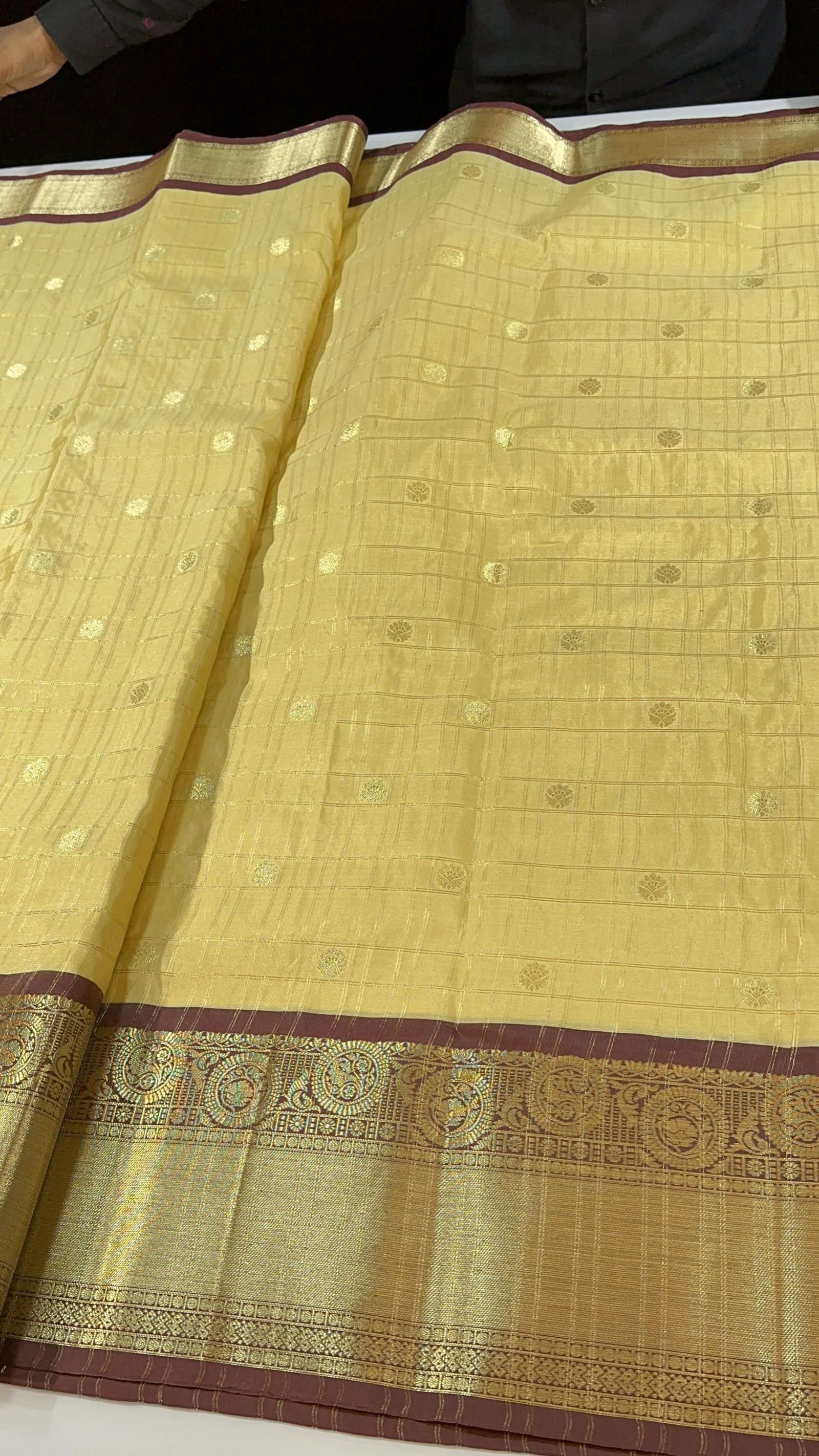A soft Banarasi semi-silk saree featuring a vintage-inspired checks pattern, enriched with delicate zari weaving motifs all over the body. Finished with a contrast zari-woven border, this saree offers a perfect balance of classic charm, subtle richness, and effortless drape—ideal for timeless festive and traditional wear.