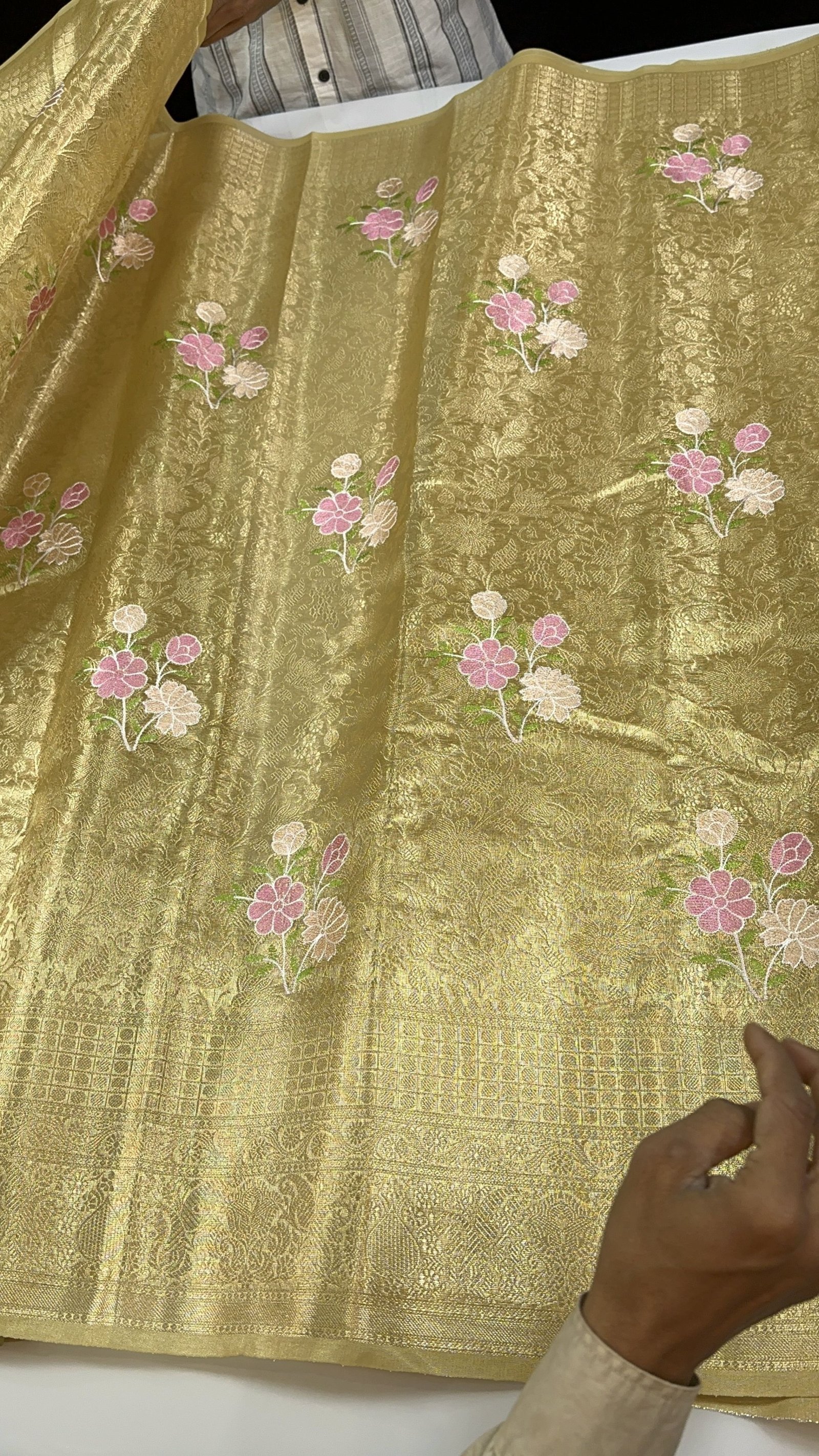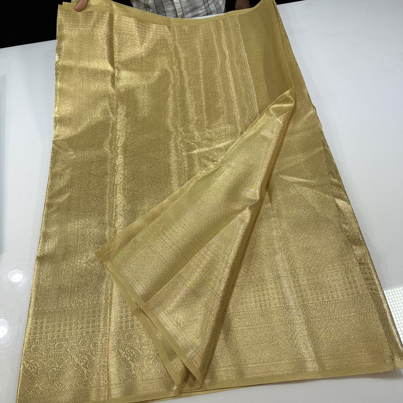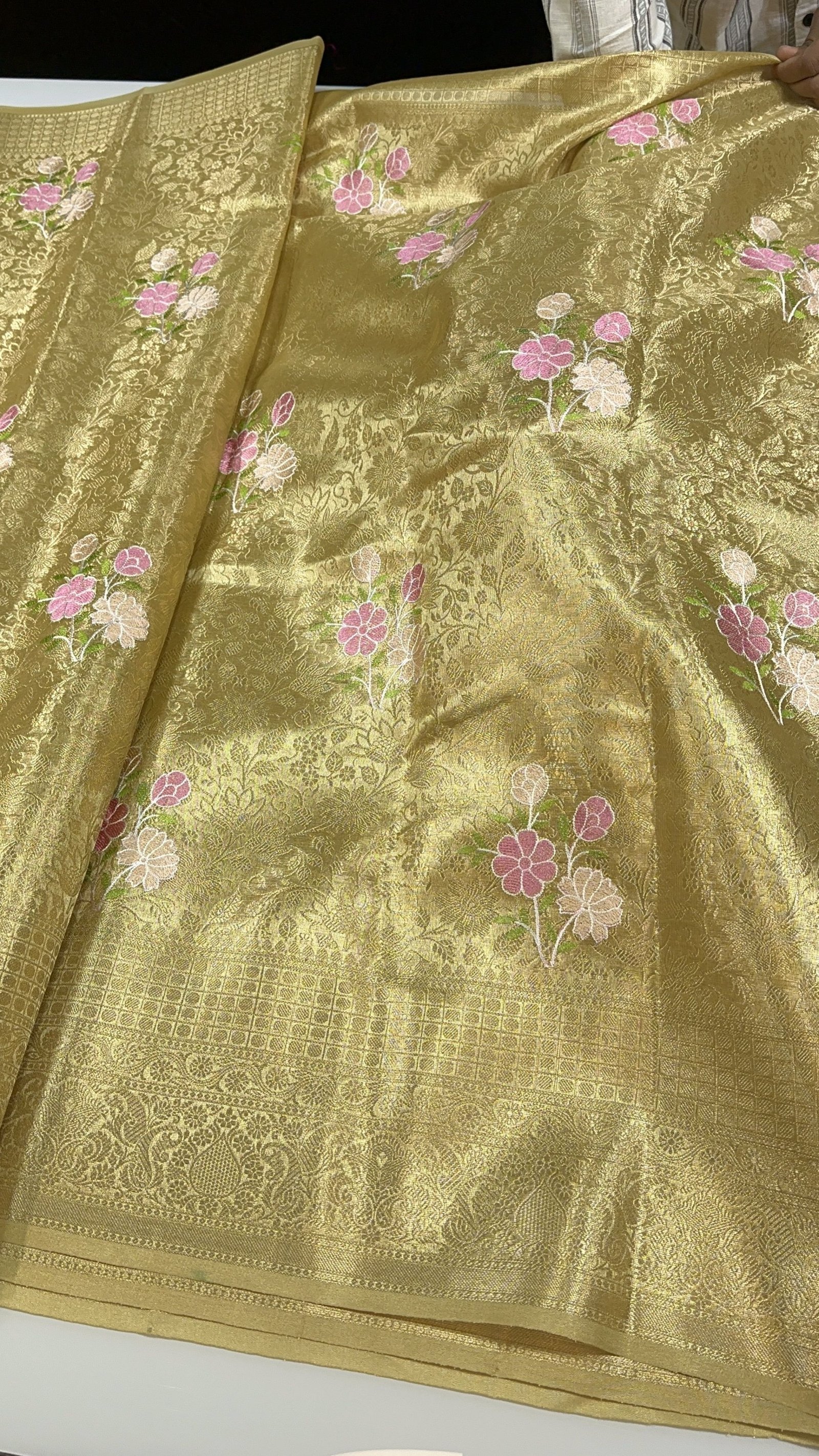 A true embodiment of regal elegance, this soft golden tissue silk brocade saree is designed to make a statement. Crafted in a rich, luminous golden hue, the saree radiates a luxurious sheen that captures the essence of timeless grandeur.