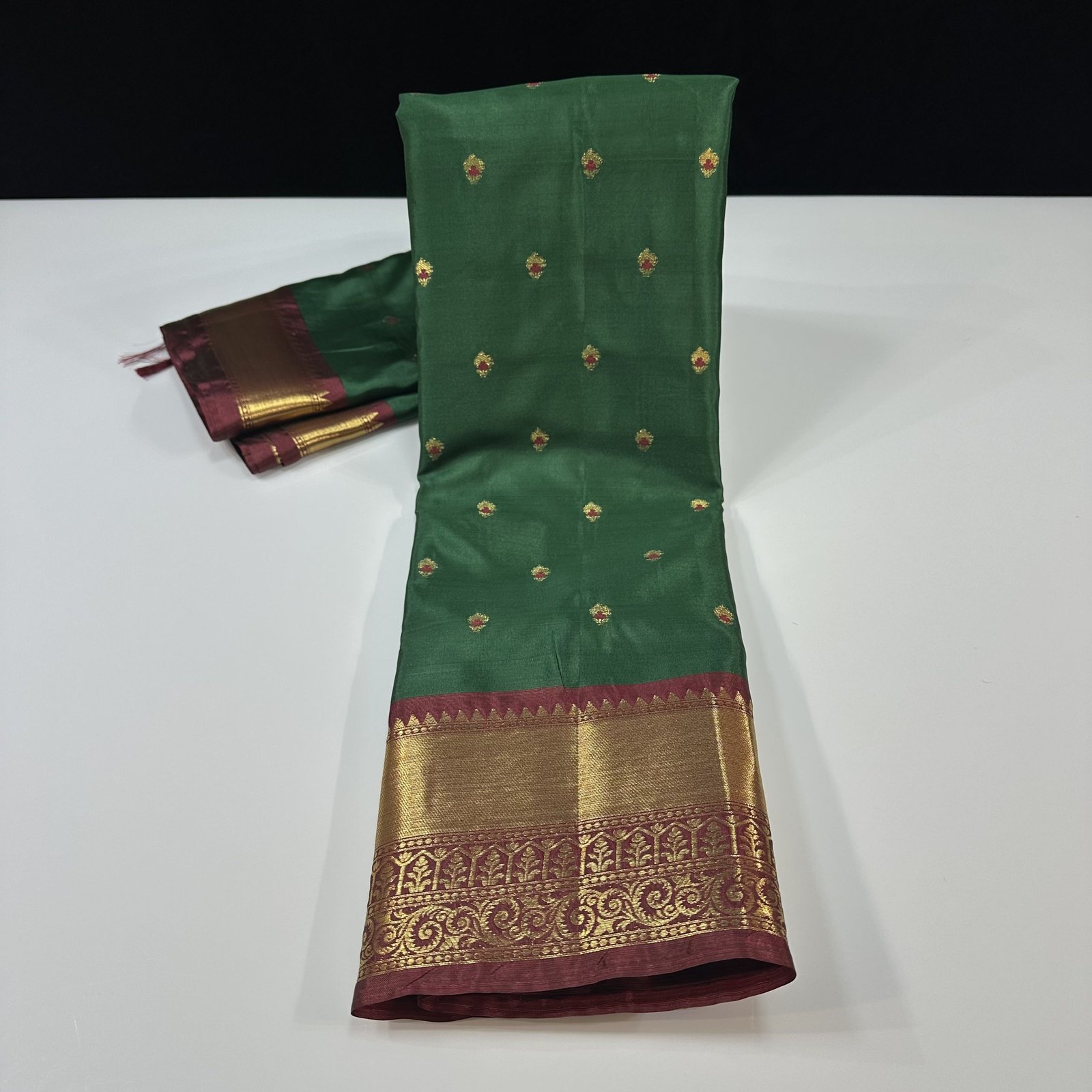 Step into timeless elegance with this Banarasi soft semi-silk saree, beautifully adorned with delicately woven booti motifs across the body. Each booti is enriched with fine Resham Meena work, adding subtle color accents and intricate detailing that highlight classic Banarasi craftsmanship. The soft semi-silk fabric offers a graceful drape with a gentle sheen, making it comfortable yet luxurious. Perfect for weddings, festive occasions, and traditional celebrations, this saree is a harmonious blend of heritage artistry and refined sophistication.