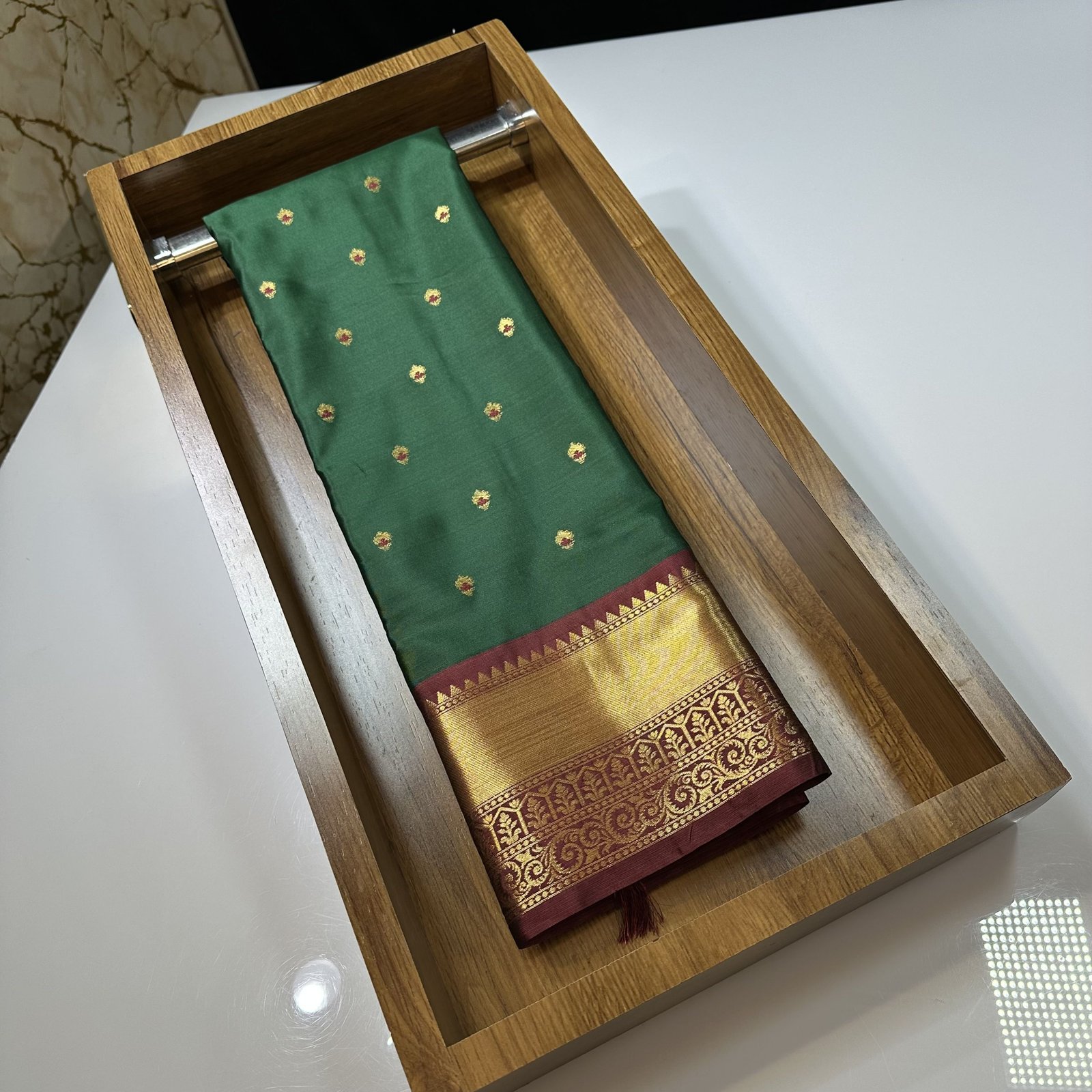 Step into timeless elegance with this Banarasi soft semi-silk saree, beautifully adorned with delicately woven booti motifs across the body. Each booti is enriched with fine Resham Meena work, adding subtle color accents and intricate detailing that highlight classic Banarasi craftsmanship. The soft semi-silk fabric offers a graceful drape with a gentle sheen, making it comfortable yet luxurious. Perfect for weddings, festive occasions, and traditional celebrations, this saree is a harmonious blend of heritage artistry and refined sophistication.