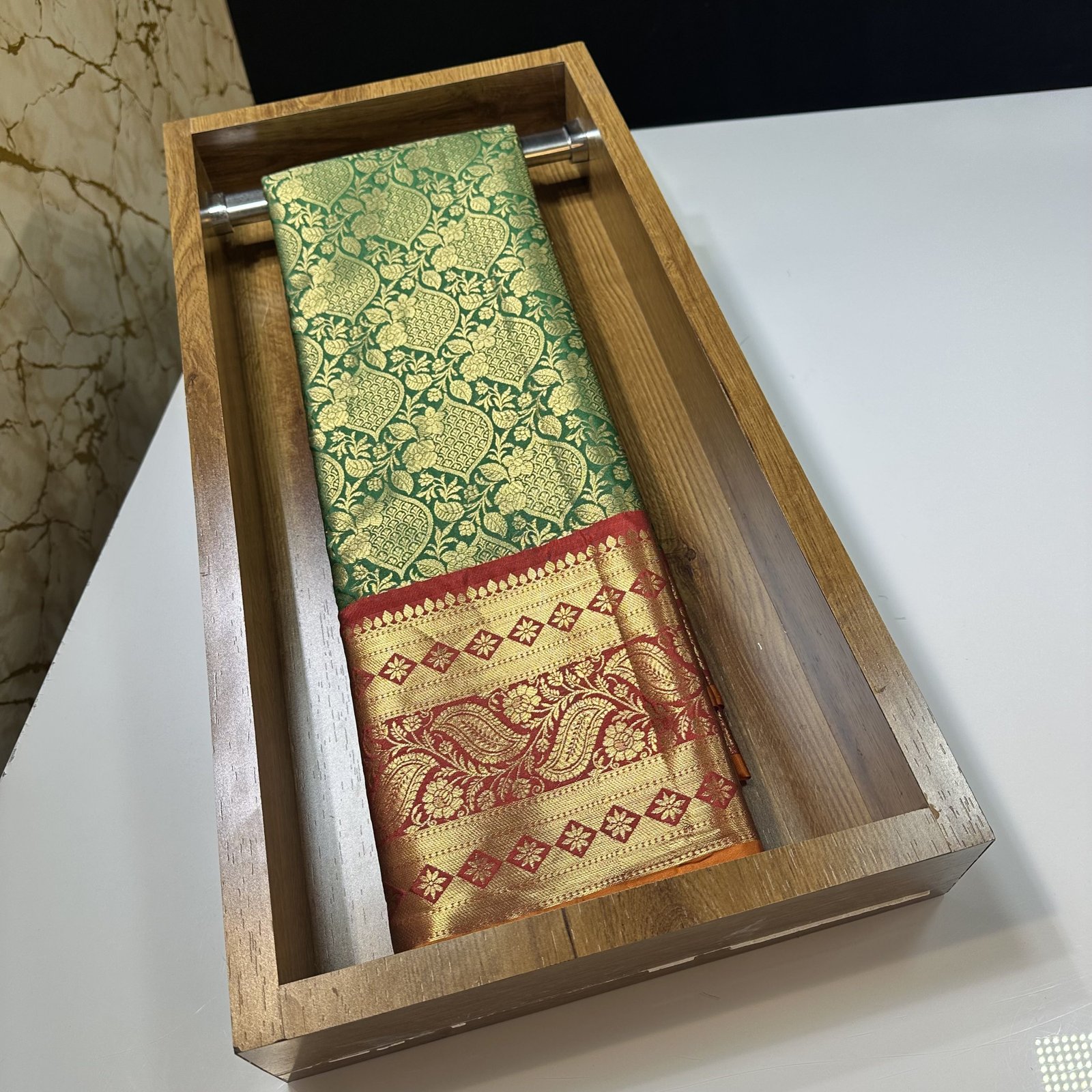 The highlight of this masterpiece is its contrast kanchi weave border, meticulously designed to add depth and definition to the drape. The striking border enhances the saree’s overall appeal, creating a perfect balance between classic Banarasi charm and South Indian kanchi aesthetics.