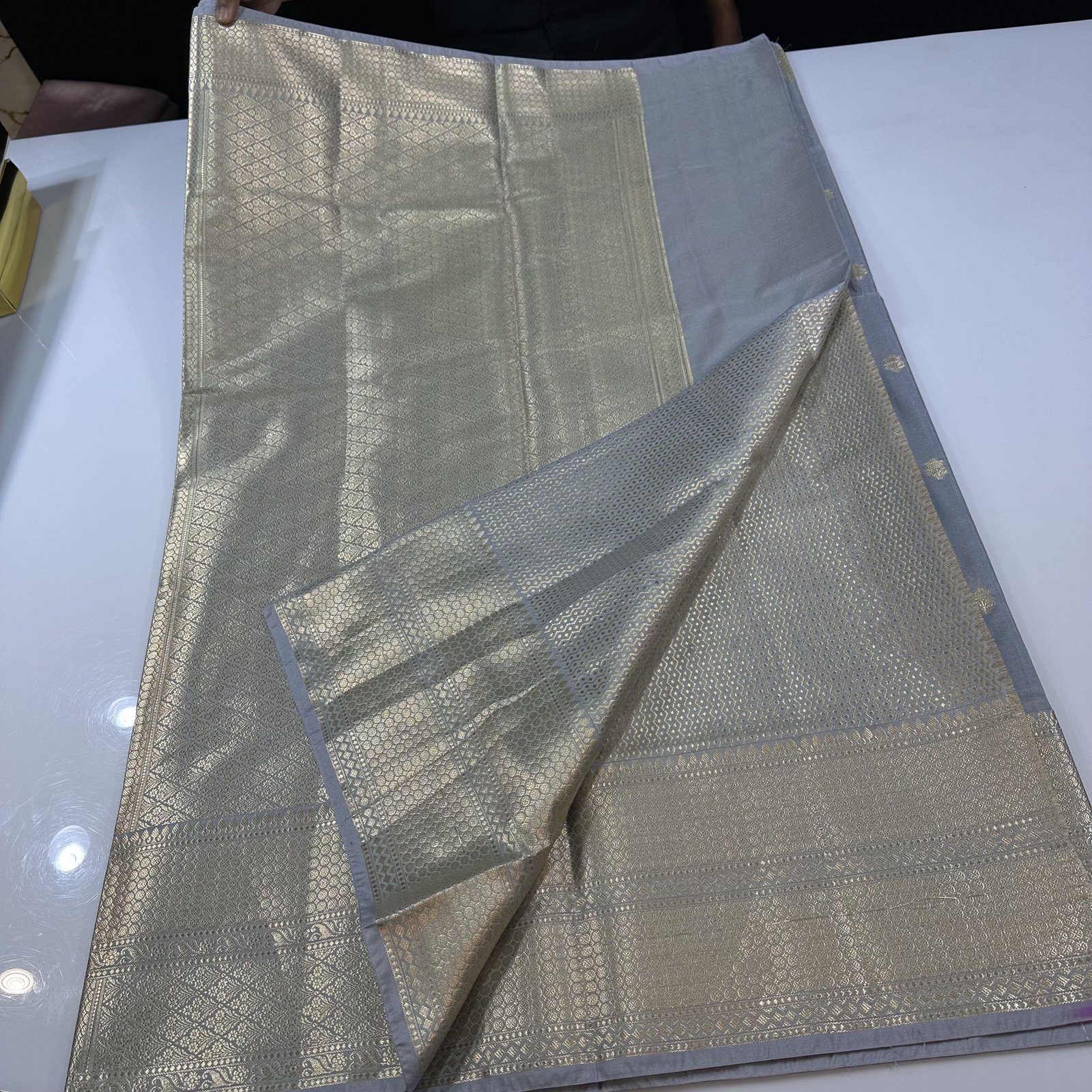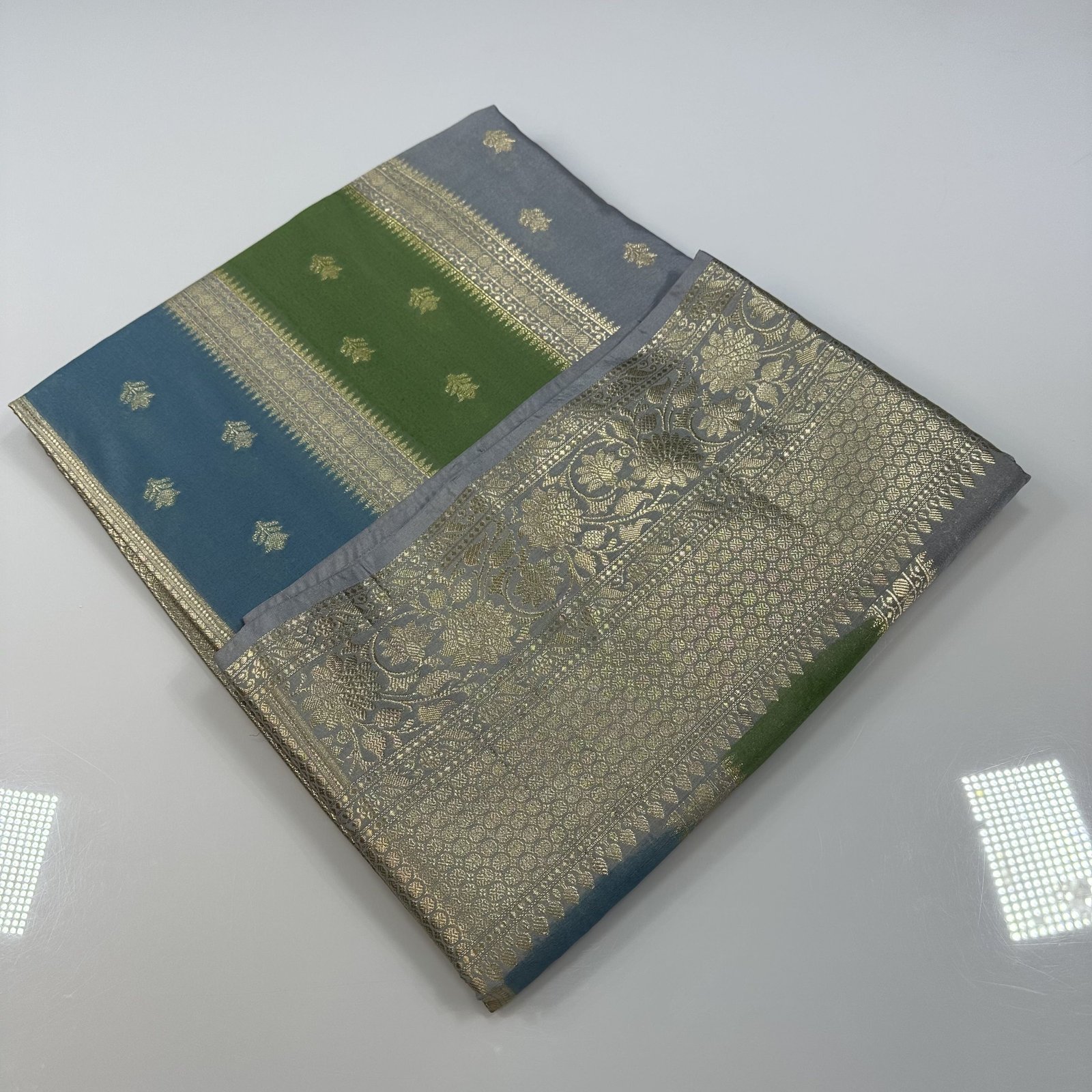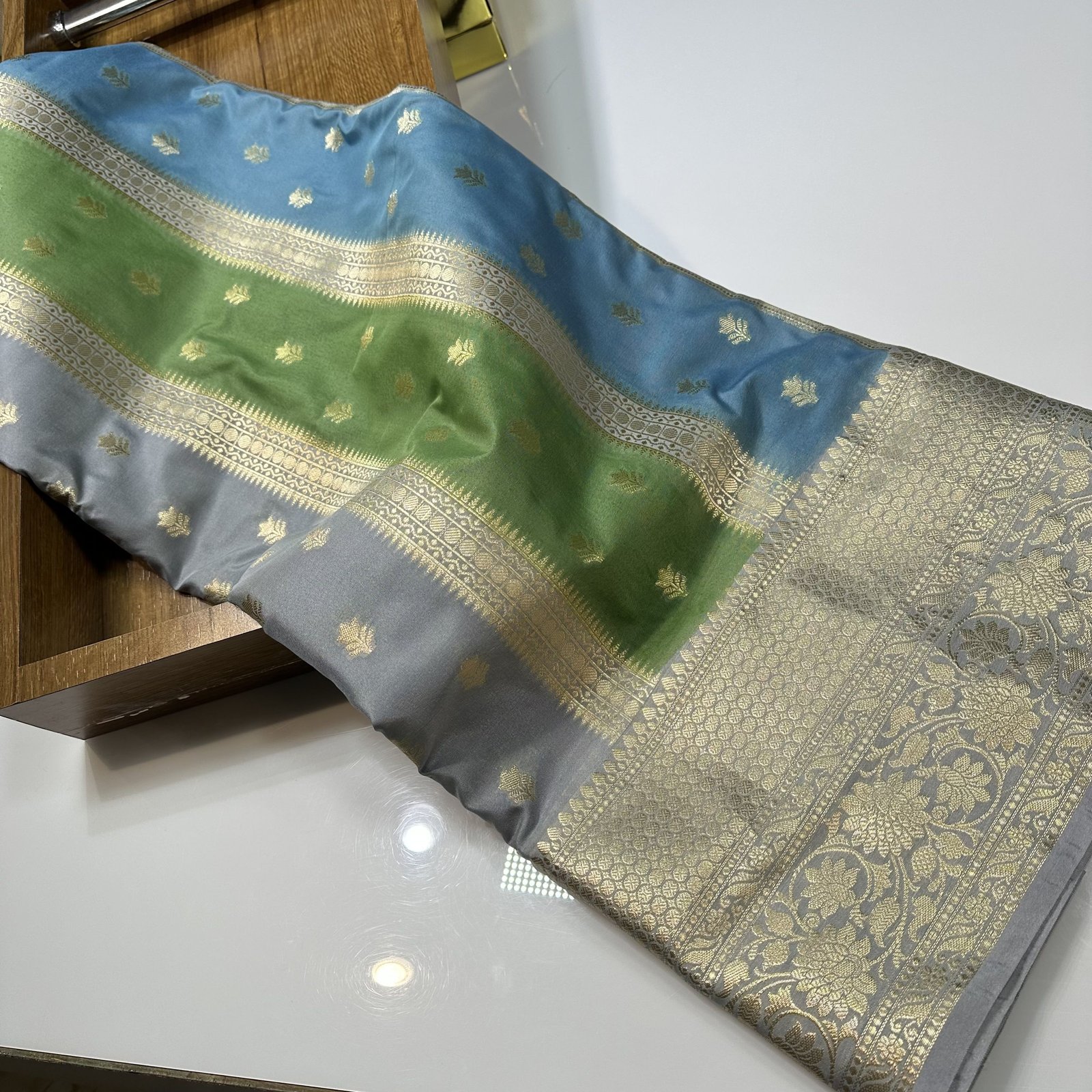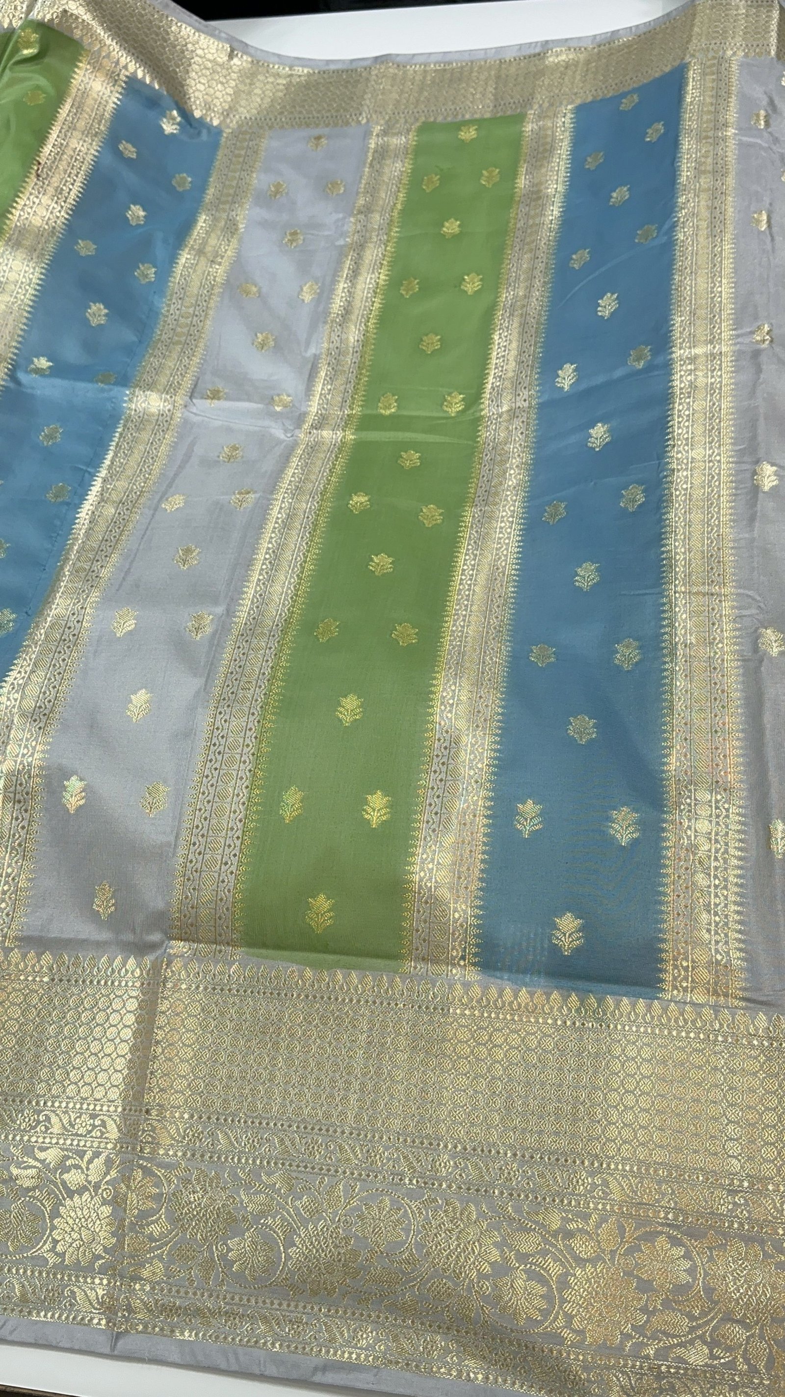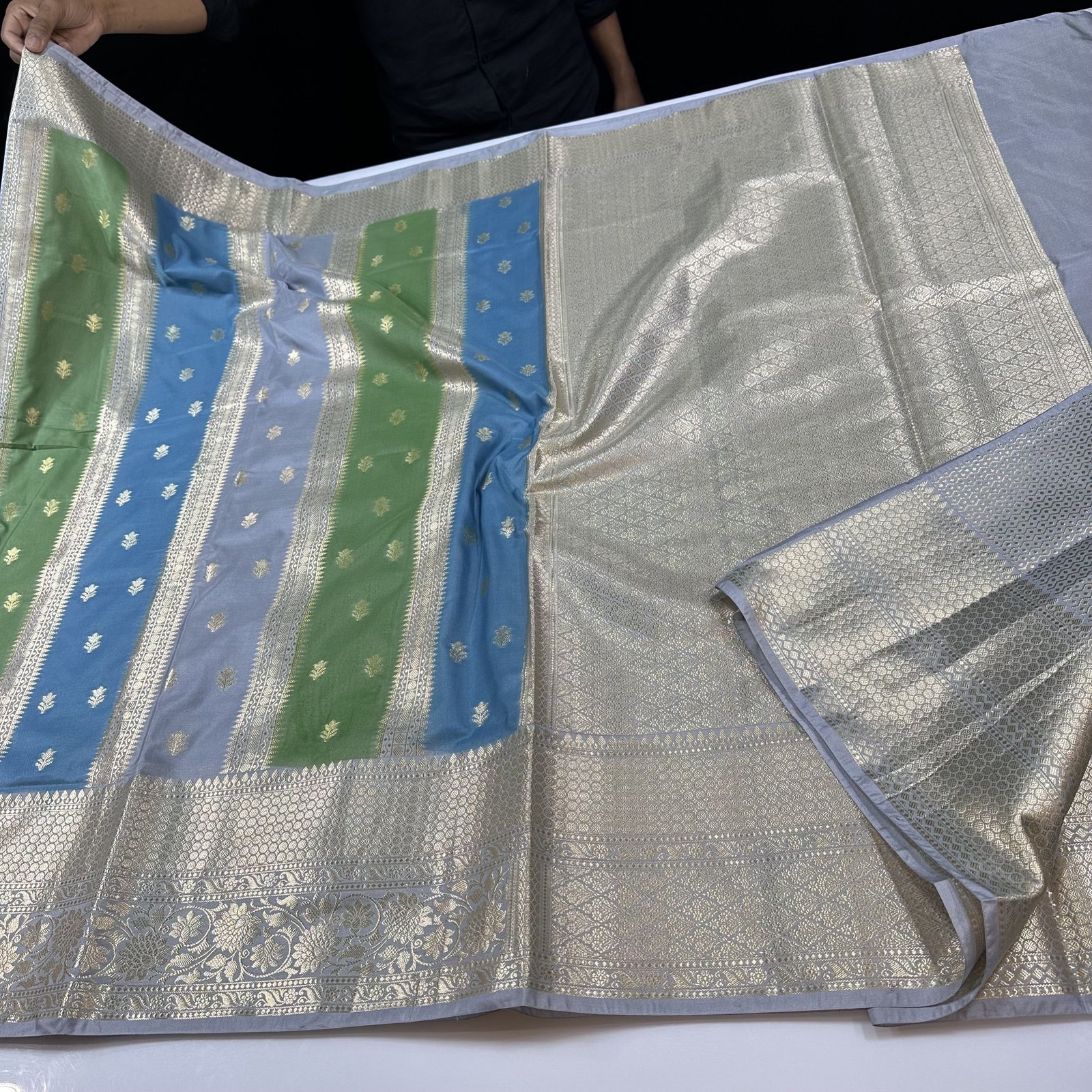 The super soft Banarasi premium semi-katan silk saree with zari weaving stripes and butas allover body with hand panted rangkaat inspired floral shdes allober body of the saree