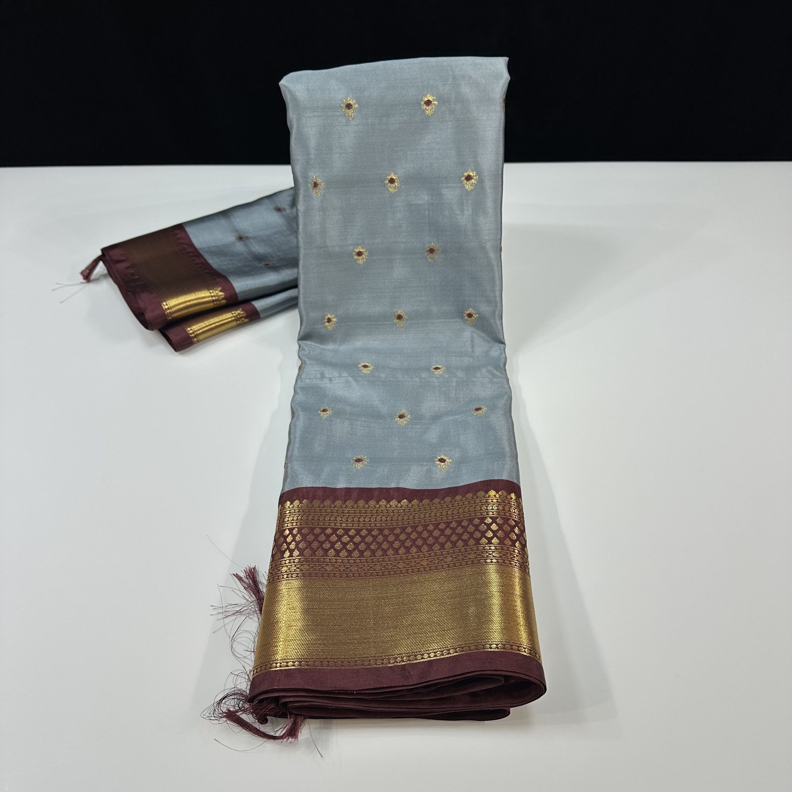 Step into timeless elegance with this Banarasi soft semi-silk saree, beautifully adorned with delicately woven booti motifs across the body. Each booti is enriched with fine Resham Meena work, adding subtle color accents and intricate detailing that highlight classic Banarasi craftsmanship. The soft semi-silk fabric offers a graceful drape with a gentle sheen, making it comfortable yet luxurious. Perfect for weddings, festive occasions, and traditional celebrations, this saree is a harmonious blend of heritage artistry and refined sophistication.