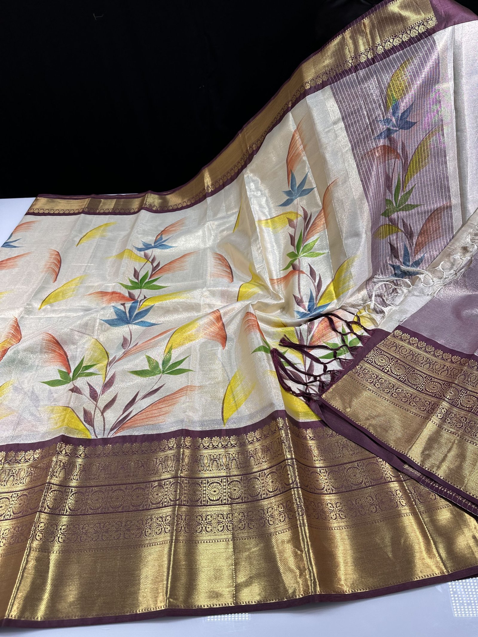 SOFT BANARASI TISSUE SILK SAREE WITH CONTRAST WEAVING KANCHI BORDER HAVING HAND PAINTED FLORAL JAAL ALLOVER SAREE