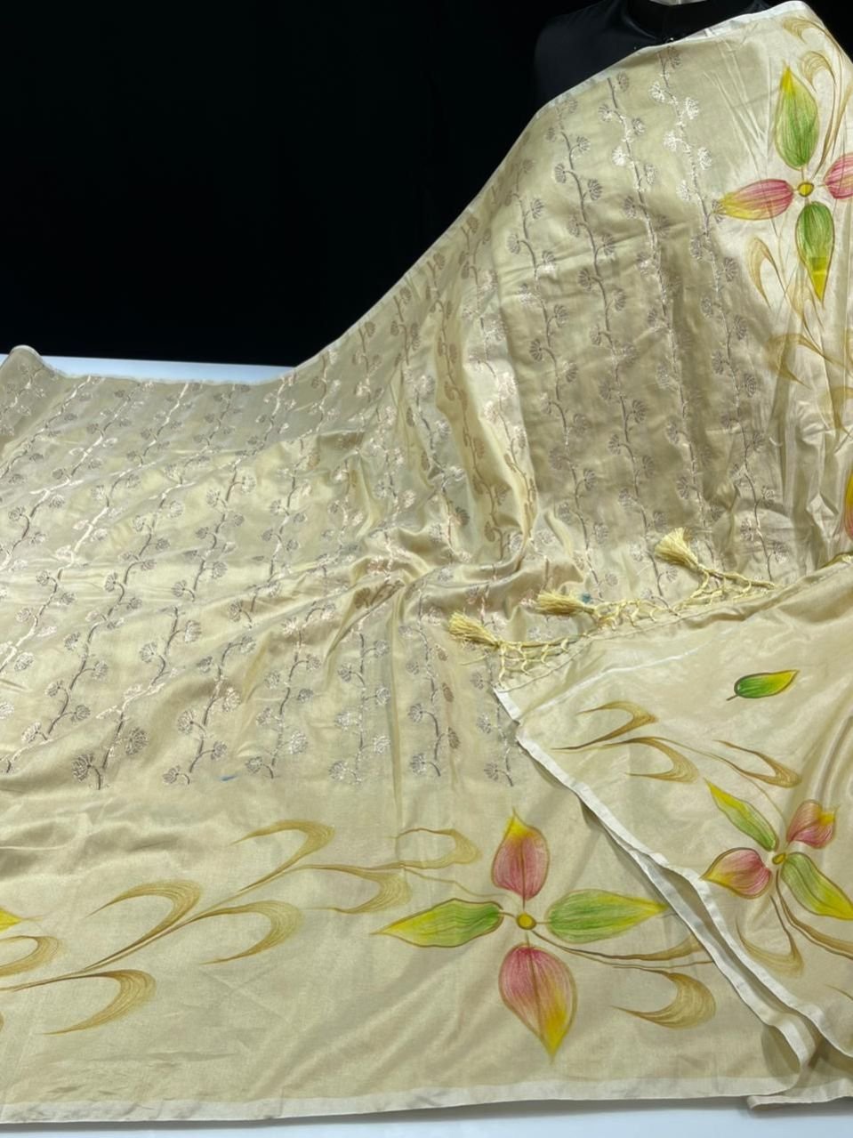 SOFT BANARASI COTTON BASED SILK SAREE WITH ZARI WEAVING JAAL ALONG WITH HAND PAINTED FLORAL BORDER