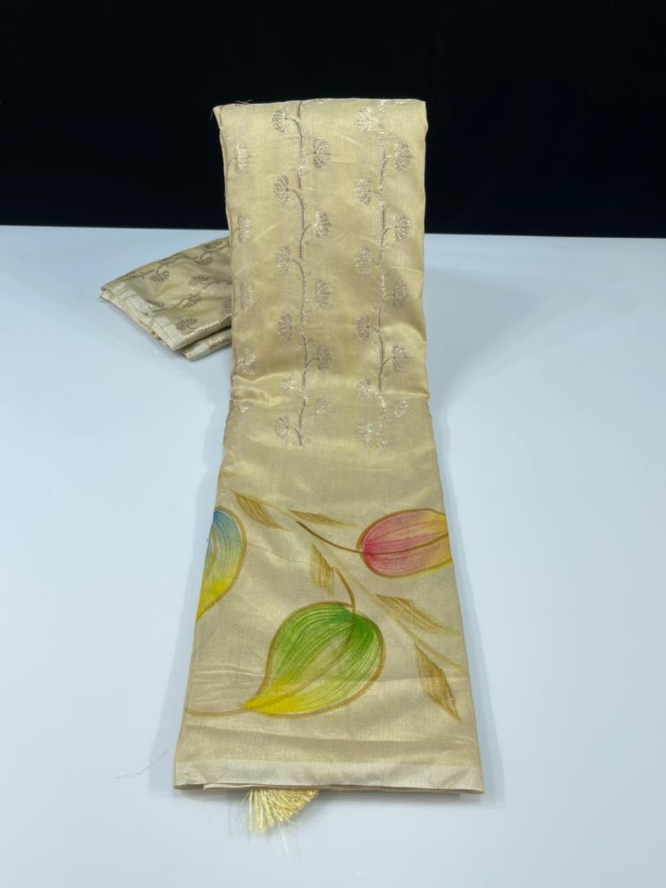 SOFT BANARASI SEMI-COTTON SILK SAREE WITH ZARI WEAVING FLORAL JAAL ALONG WITH HAND PAINTED FLORAL JAAL OVER BORDER