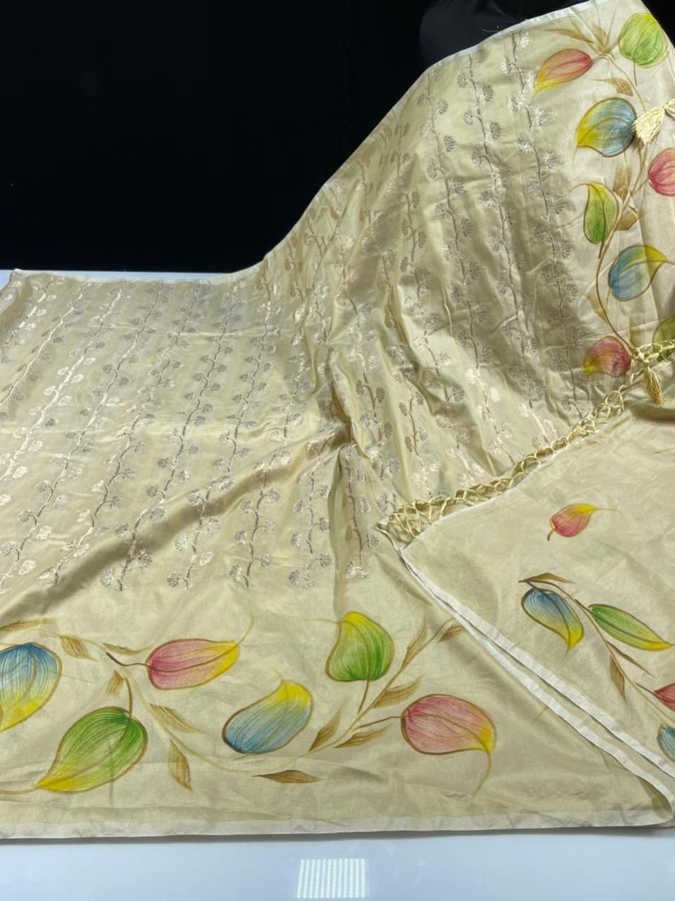 SOFT BANARASI COTTON BASED SILK SAREE WITH ZARI WEAVING JAAL ALONG WITH HAND PAINTED FLORAL BORDER