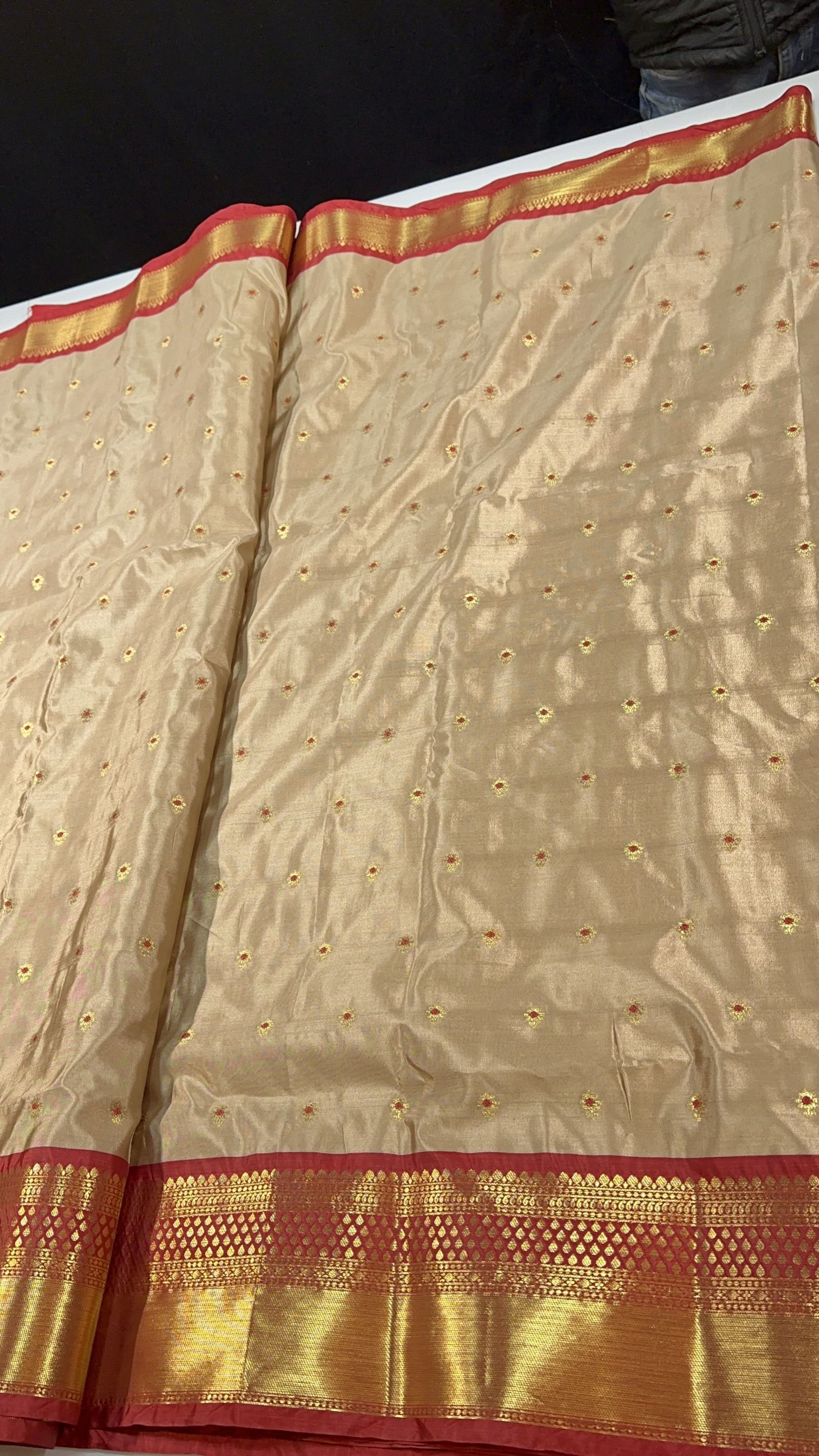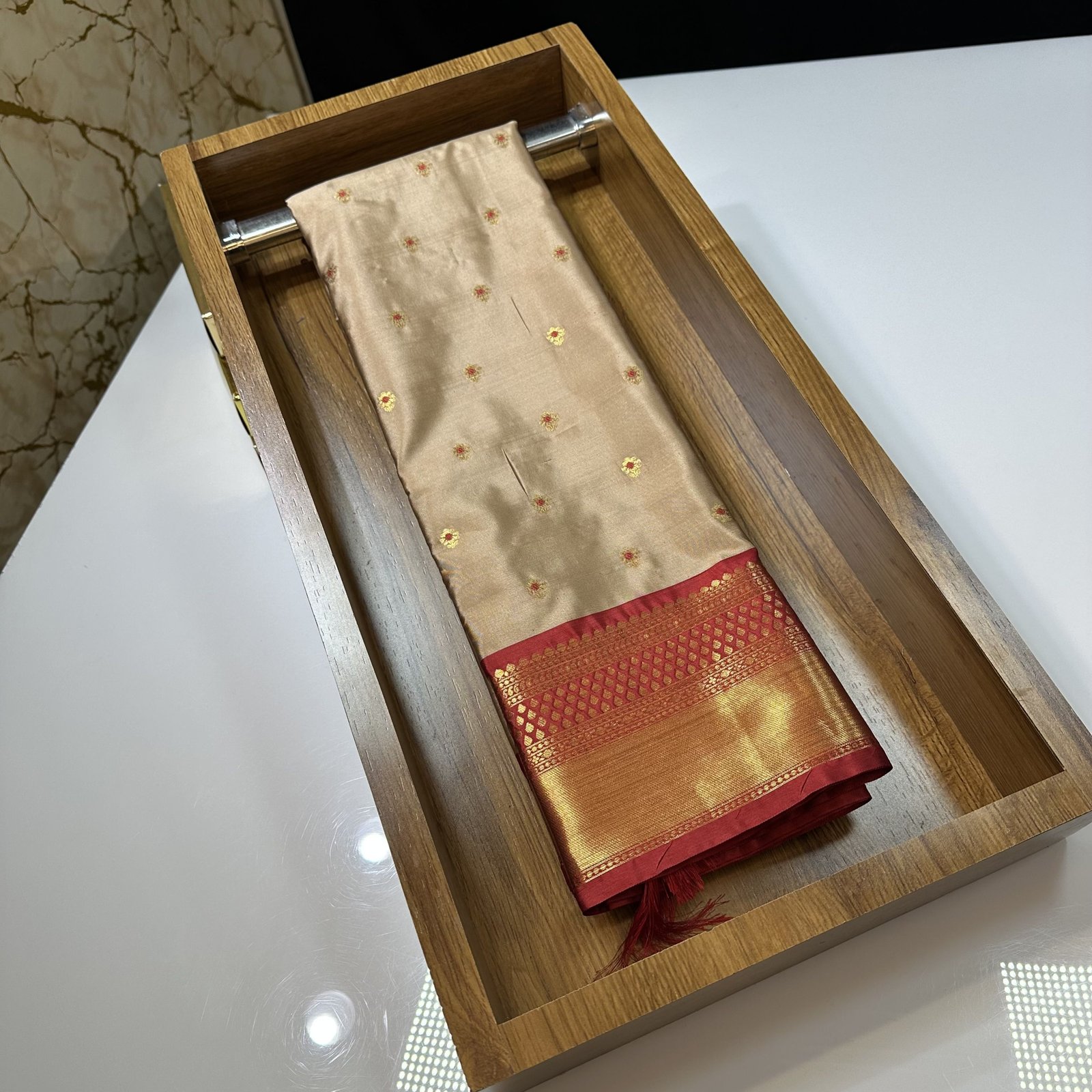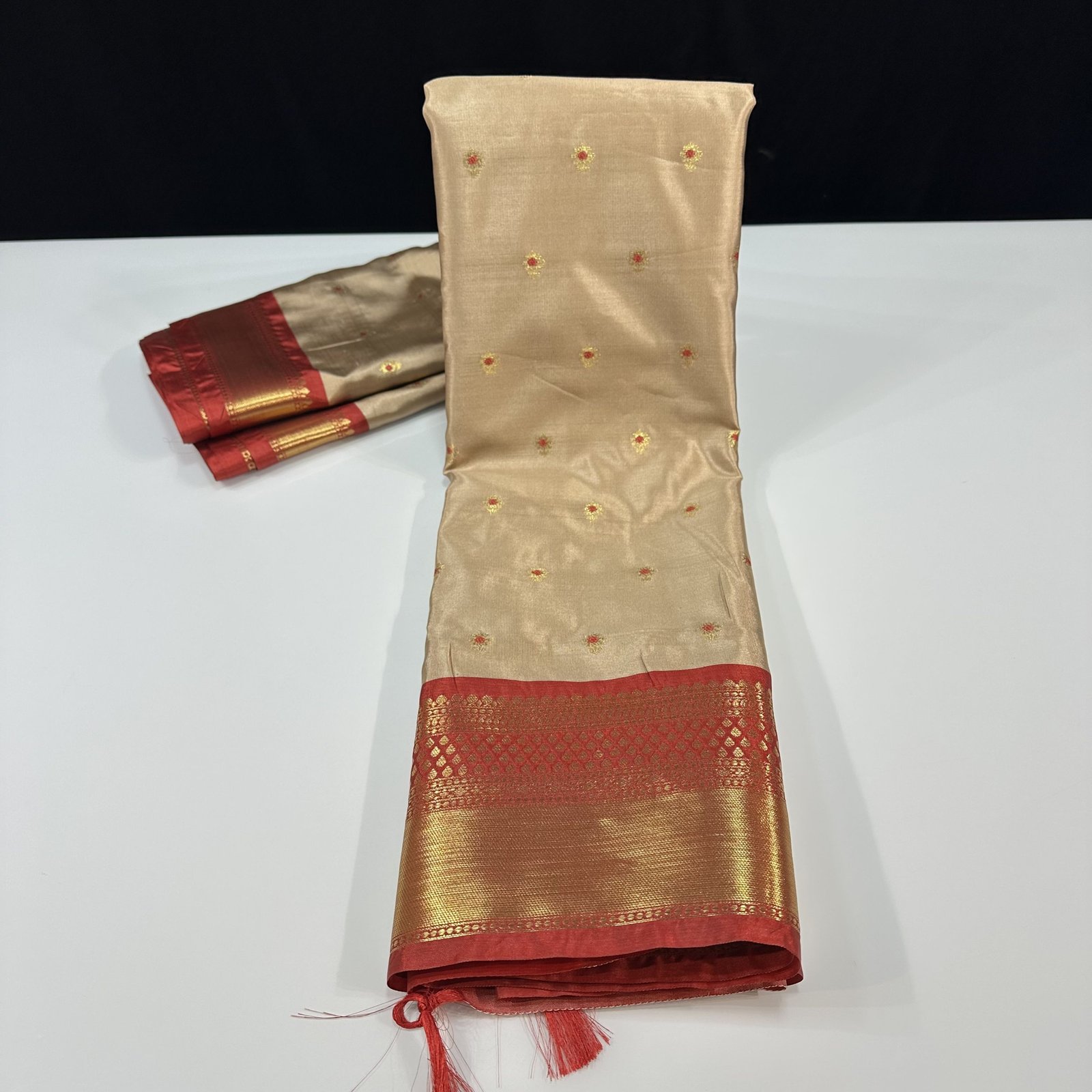This soft Banarasi semi-silk saree is a beautiful blend of comfort and tradition, crafted with an exceptionally smooth and lightweight texture that drapes effortlessly. The body of the saree is adorned with delicate traditional zari-woven booties, each booti enriched with fine Meena work done in resham, adding subtle color highlights that bring the design to life. The interplay of shimmering zari and soft resham Meena creates a graceful, timeless charm across the saree.