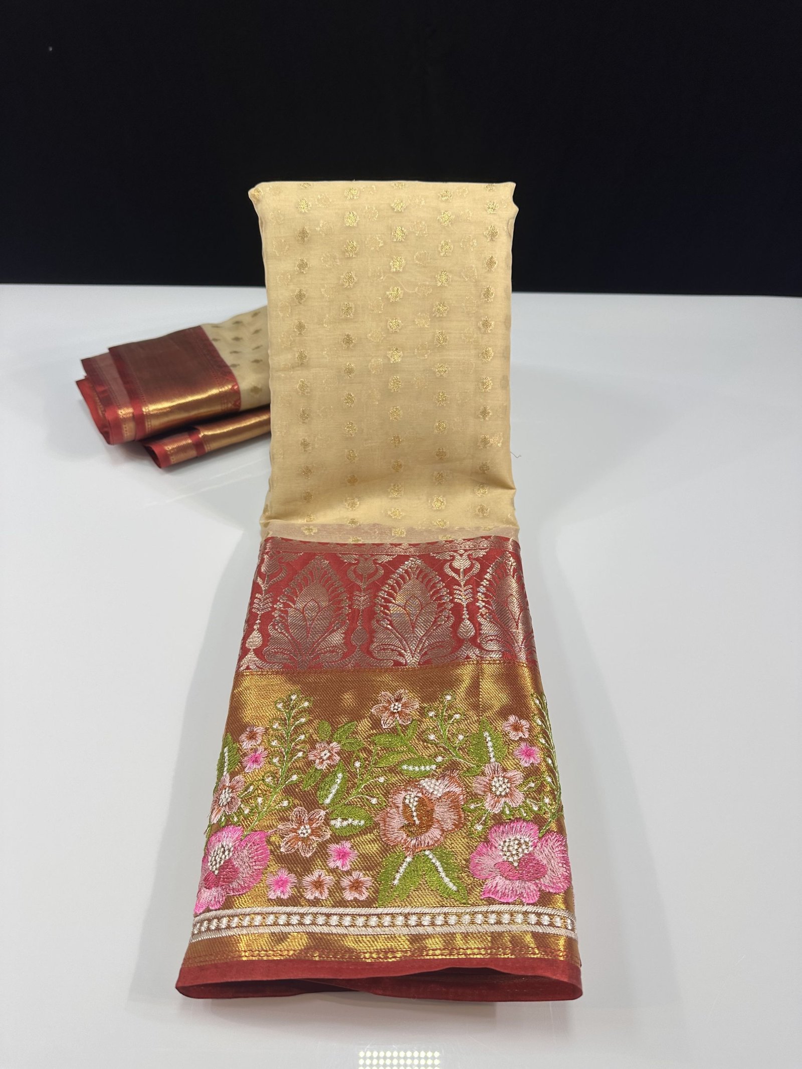 SOFT SEMI-KANCHI ORGANZA SAREE WITH EMBROIDERY WORK MEENAKARI JAAL WORK OVER WEAVING KANCHI BORDER