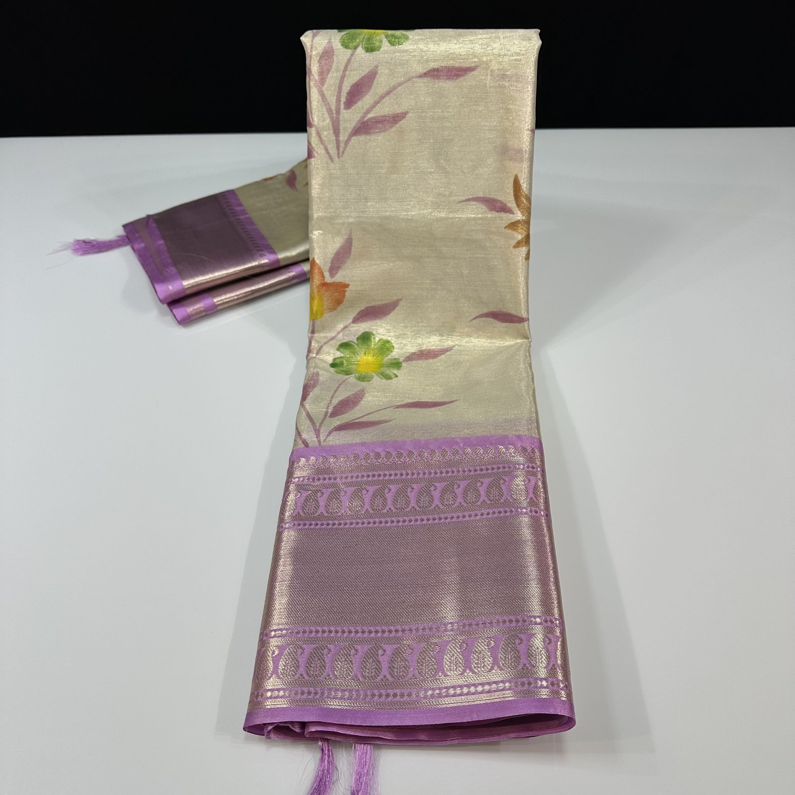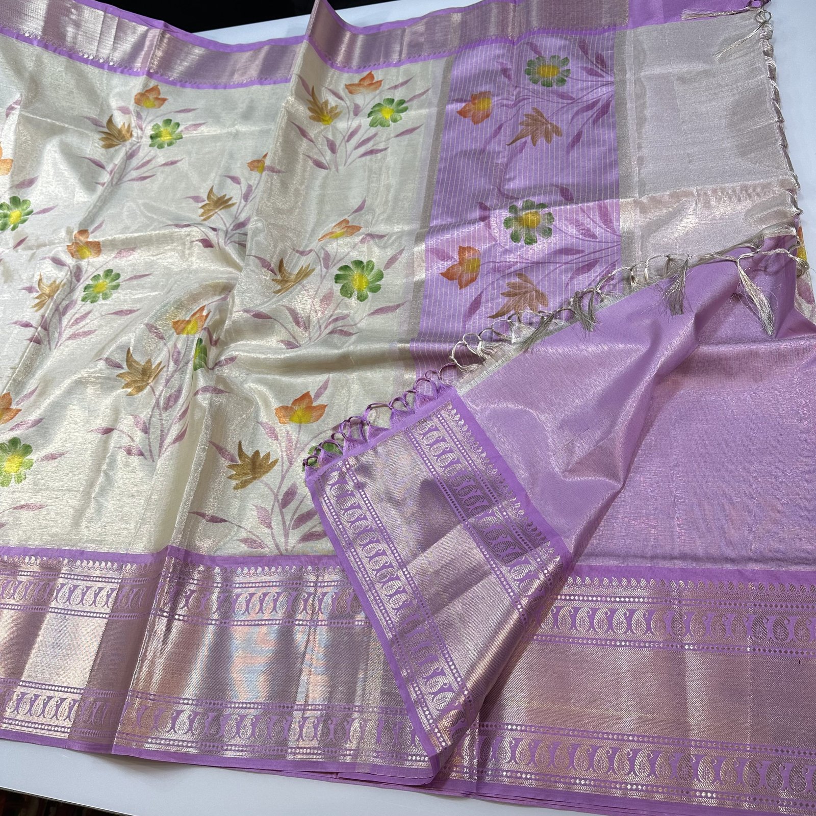 SOFT BANARASI TISSUE SILK SAREE WITH HAND PAINTED FLORAL BUTA OVER BODY OF THE SAREE HAVING CONTRAST WEAVING KANCHI INSPIRED BORDER