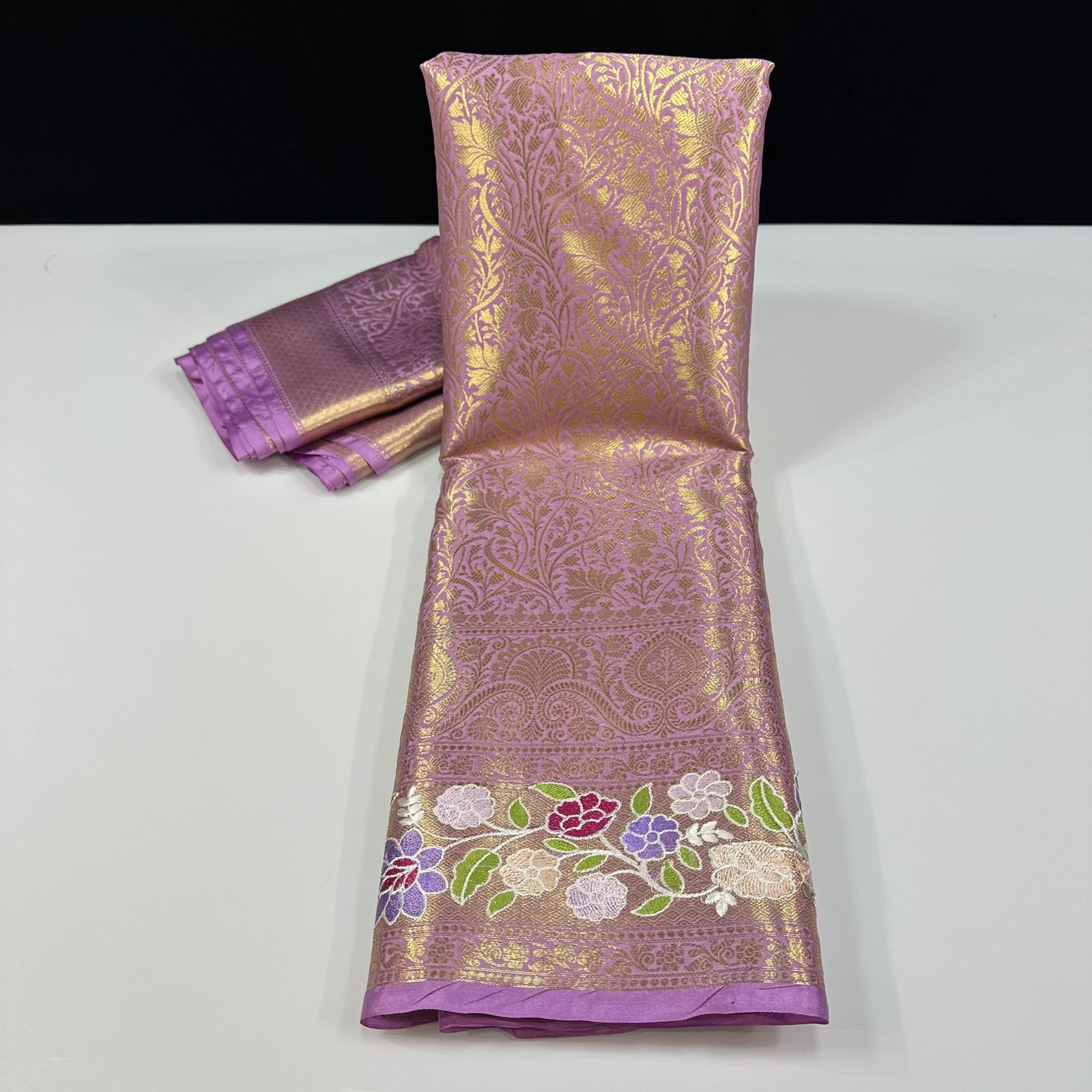 A perfect blend of softness and sophistication, this Banarasi semi-silk brocade saree in a soothing lavender shade exudes understated elegance. The fabric is smooth, lightweight, and gracefully flowing, offering a luxurious drape that feels as beautiful as it looks.
