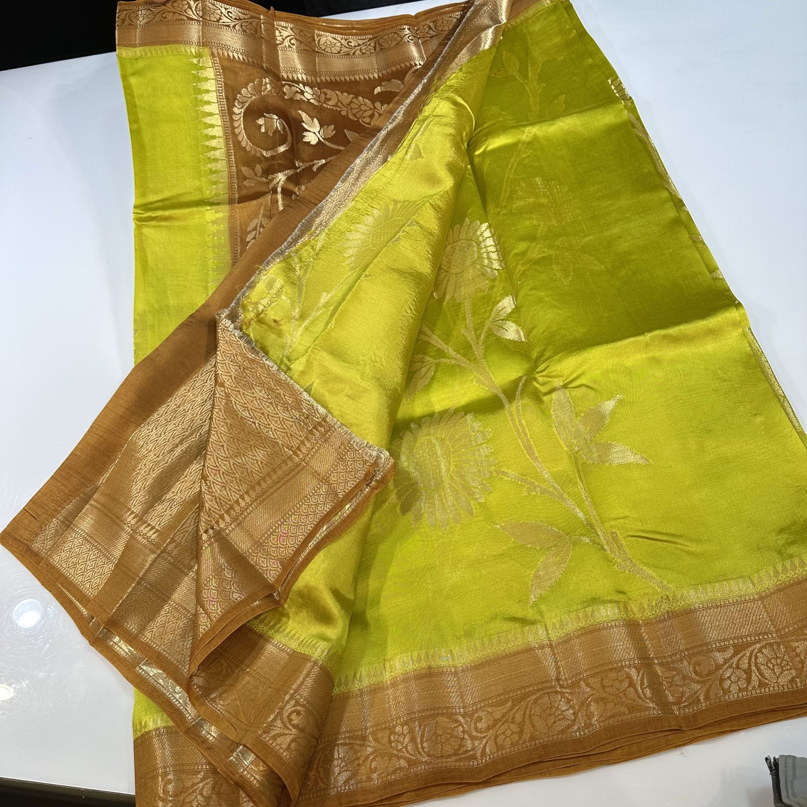 Presenting our exquisite Banarasi Green Mango Silk Saree, a perfect blend of tradition and vibrant elegance. Crafted in luxurious Green Mango silk, this saree is known for its smooth texture, graceful fall, and rich sheen that instantly elevates your look.