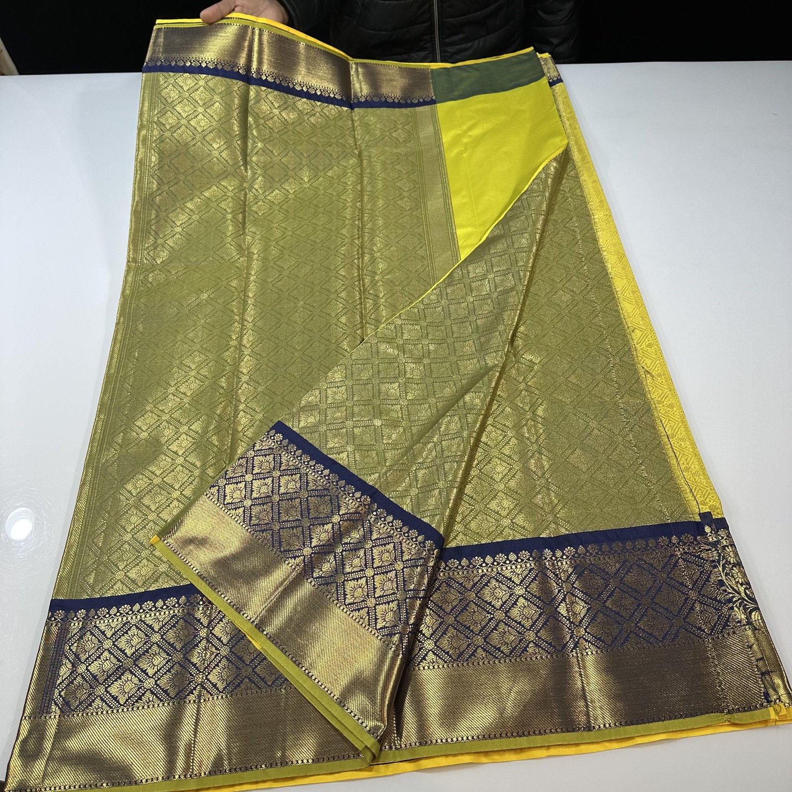 The highlight of this masterpiece is its contrast kanchi weave border, meticulously designed to add depth and definition to the drape. The striking border enhances the saree’s overall appeal, creating a perfect balance between classic Banarasi charm and South Indian kanchi aesthetics.