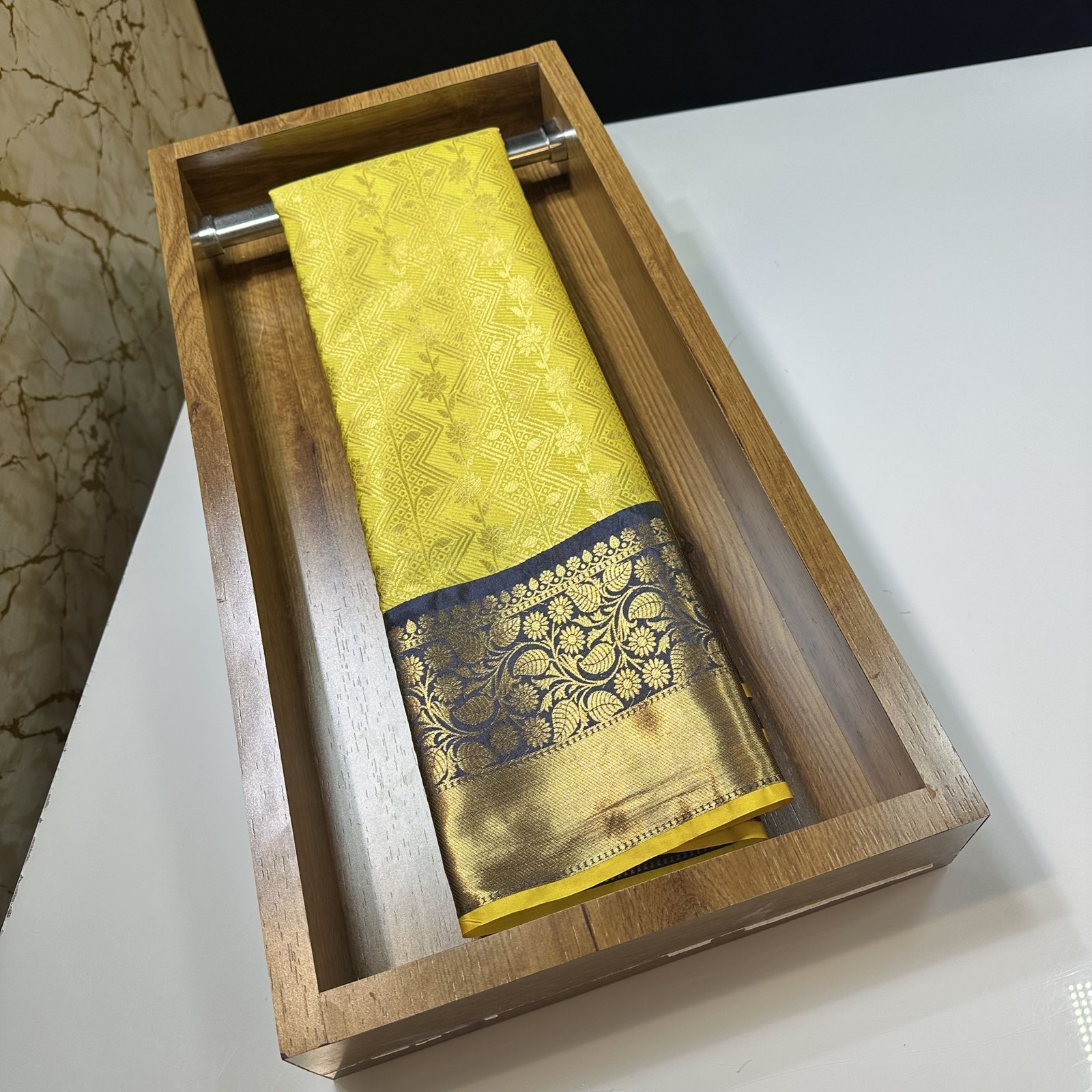 The highlight of this masterpiece is its contrast kanchi weave border, meticulously designed to add depth and definition to the drape. The striking border enhances the saree’s overall appeal, creating a perfect balance between classic Banarasi charm and South Indian kanchi aesthetics.