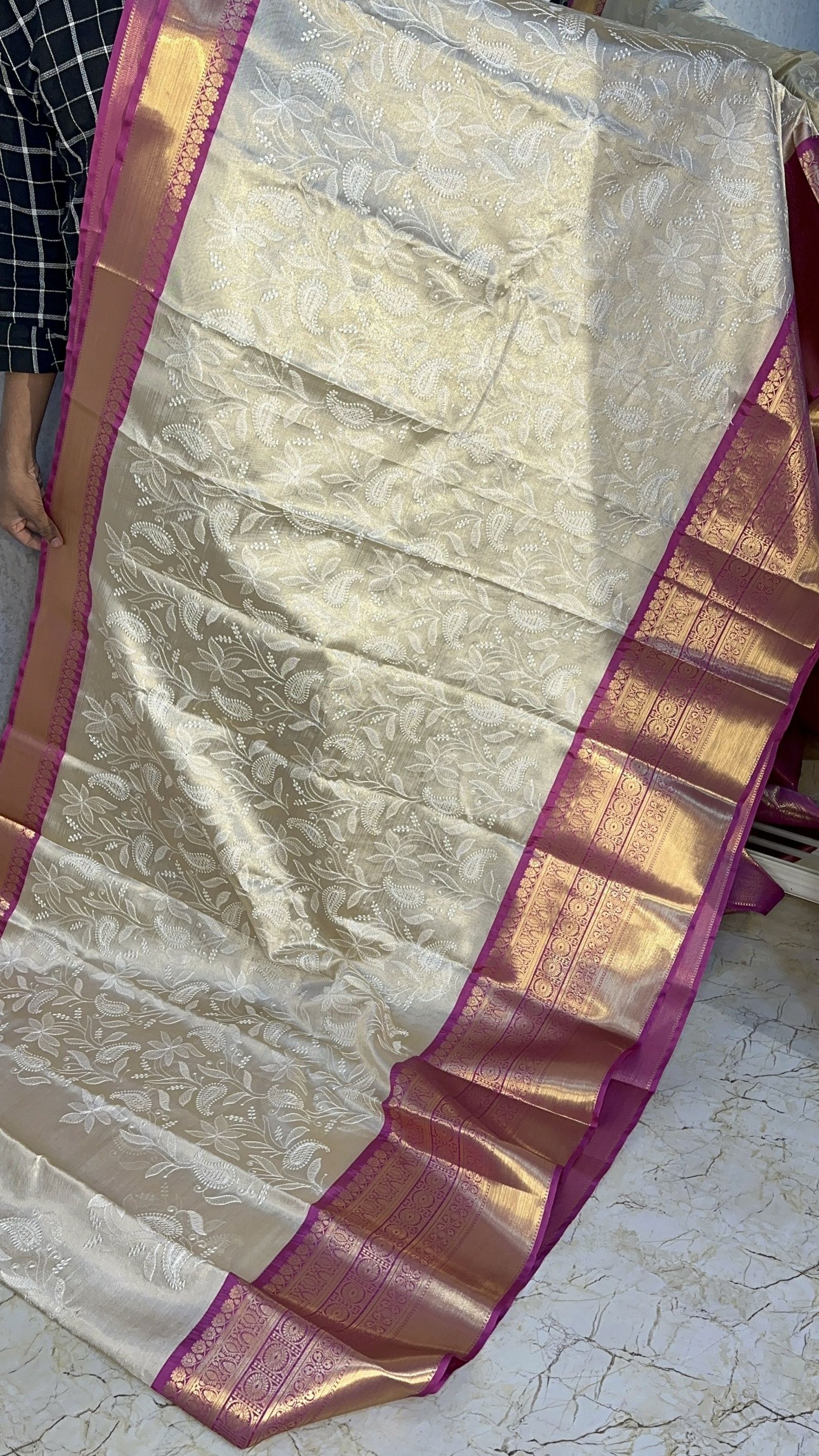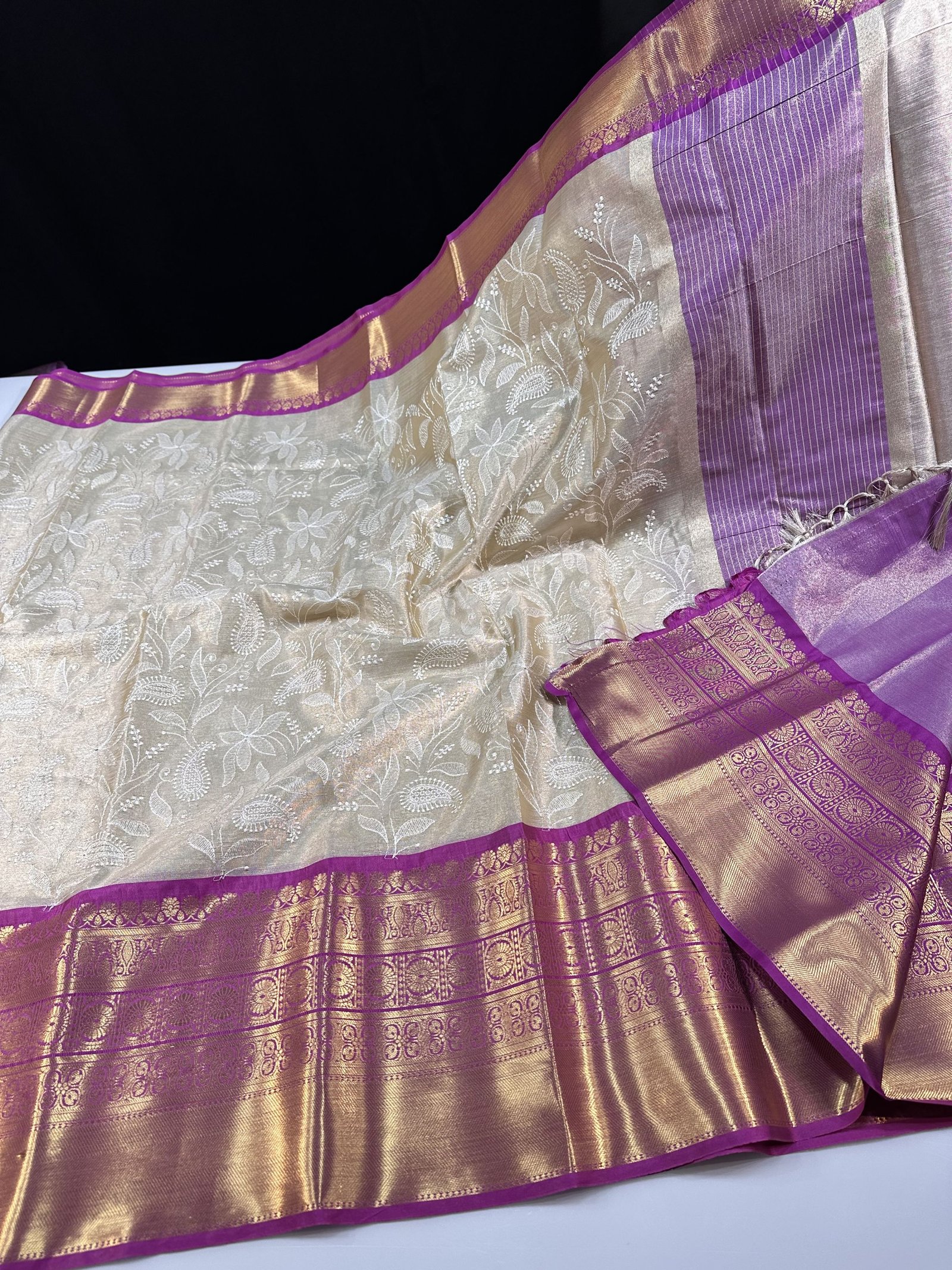 SOFT BANARASI TISSUE SILK SAREE WITH CHIKANKARI EMBROIDERED WORK JAAL OVER SAREE WITH OFF WHITE THREAD