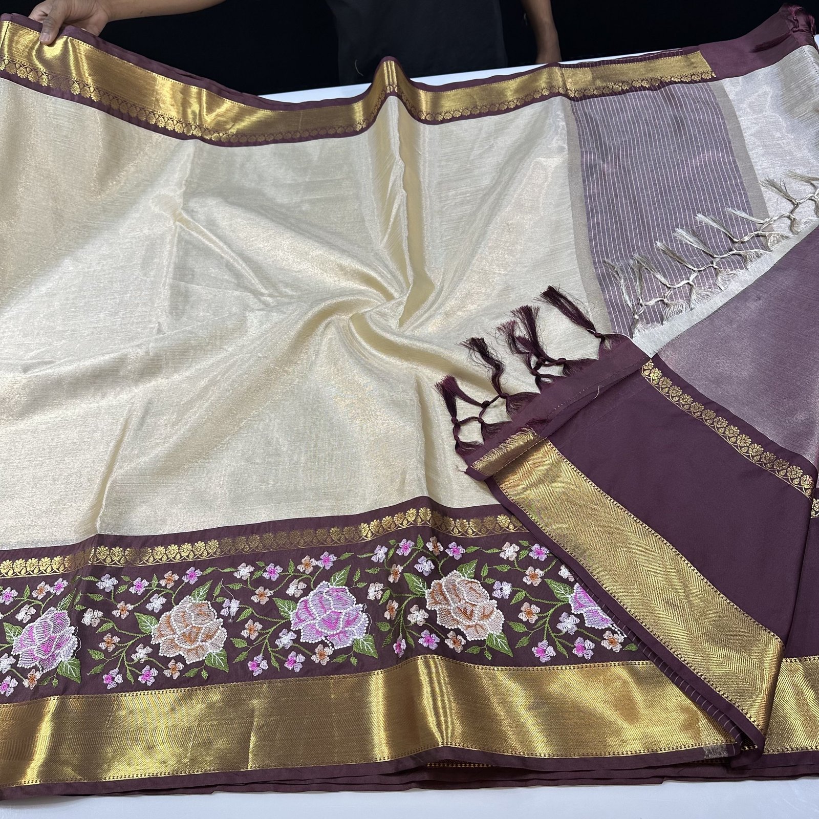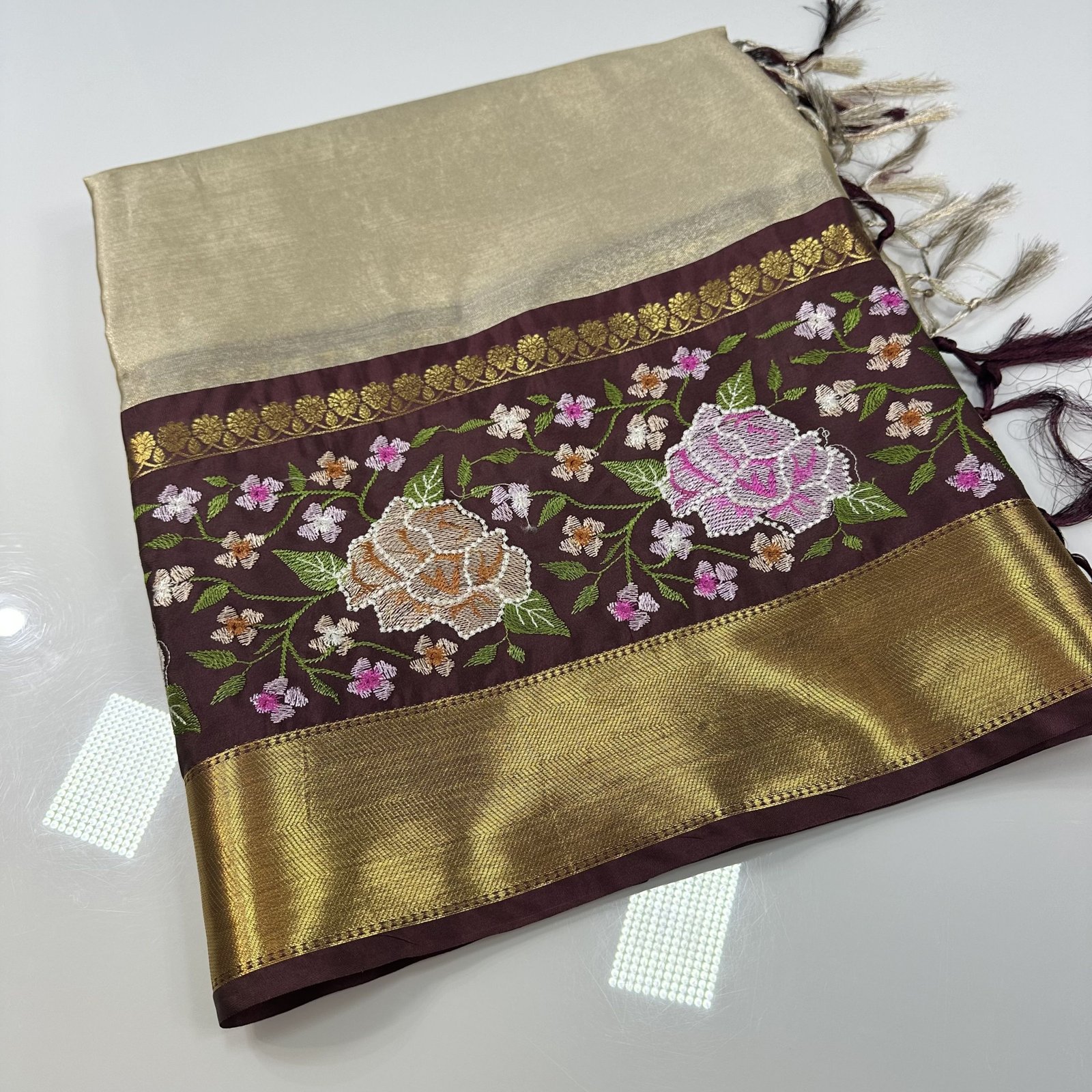 A vision of subtle luxury, this soft Banarasi tissue saree in a graceful ivory shade captures timeless elegance with a modern touch. The lightweight, sheer texture of tissue fabric gives it a delicate shimmer and an effortlessly fluid drape. The border is beautifully adorned with intricate embroidery weaving in a classic meenakari jaal pattern, adding richness and fine detailing to the overall look. The contrast between the soft, luminous body and the ornate border enhances its refined appeal.