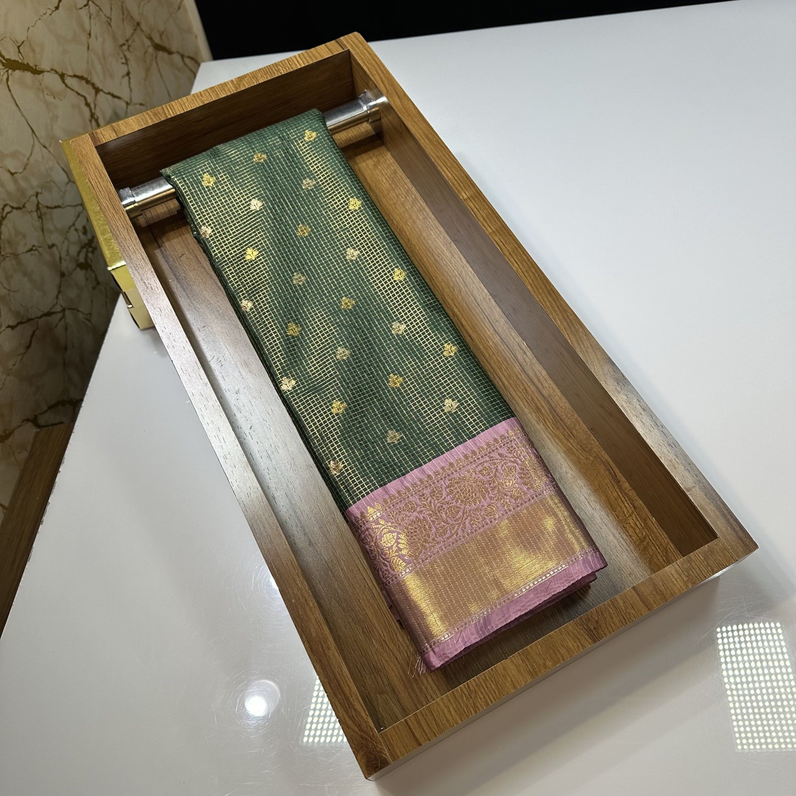 Presenting a soft Banarasi saree in a charming vintage-inspired checks pattern, beautifully reflecting the timeless elegance of traditional Banarasi craftsmanship. The body of the saree features delicate zari weaving small motifs in a classic Sonarupa pattern, where golden and silver zari come together harmoniously, adding a subtle yet luxurious sparkle to the fabric. The vintage checks layout gives the saree a graceful old-world appeal, while the finely woven Sonarupa motifs enhance its richness and texture. Crafted in a soft and comfortable drape, this saree perfectly balances heritage artistry with understated elegance.