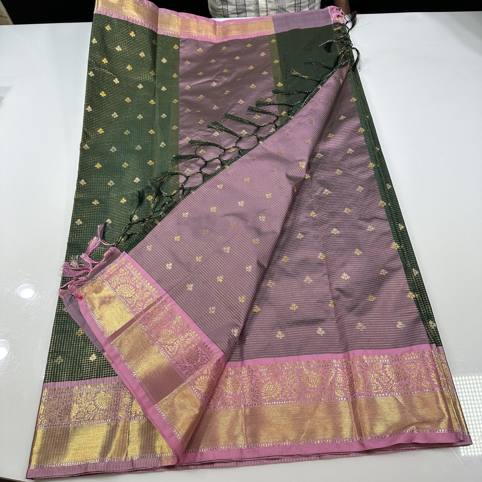 Presenting a soft Banarasi saree in a charming vintage-inspired checks pattern, beautifully reflecting the timeless elegance of traditional Banarasi craftsmanship. The body of the saree features delicate zari weaving small motifs in a classic Sonarupa pattern, where golden and silver zari come together harmoniously, adding a subtle yet luxurious sparkle to the fabric.