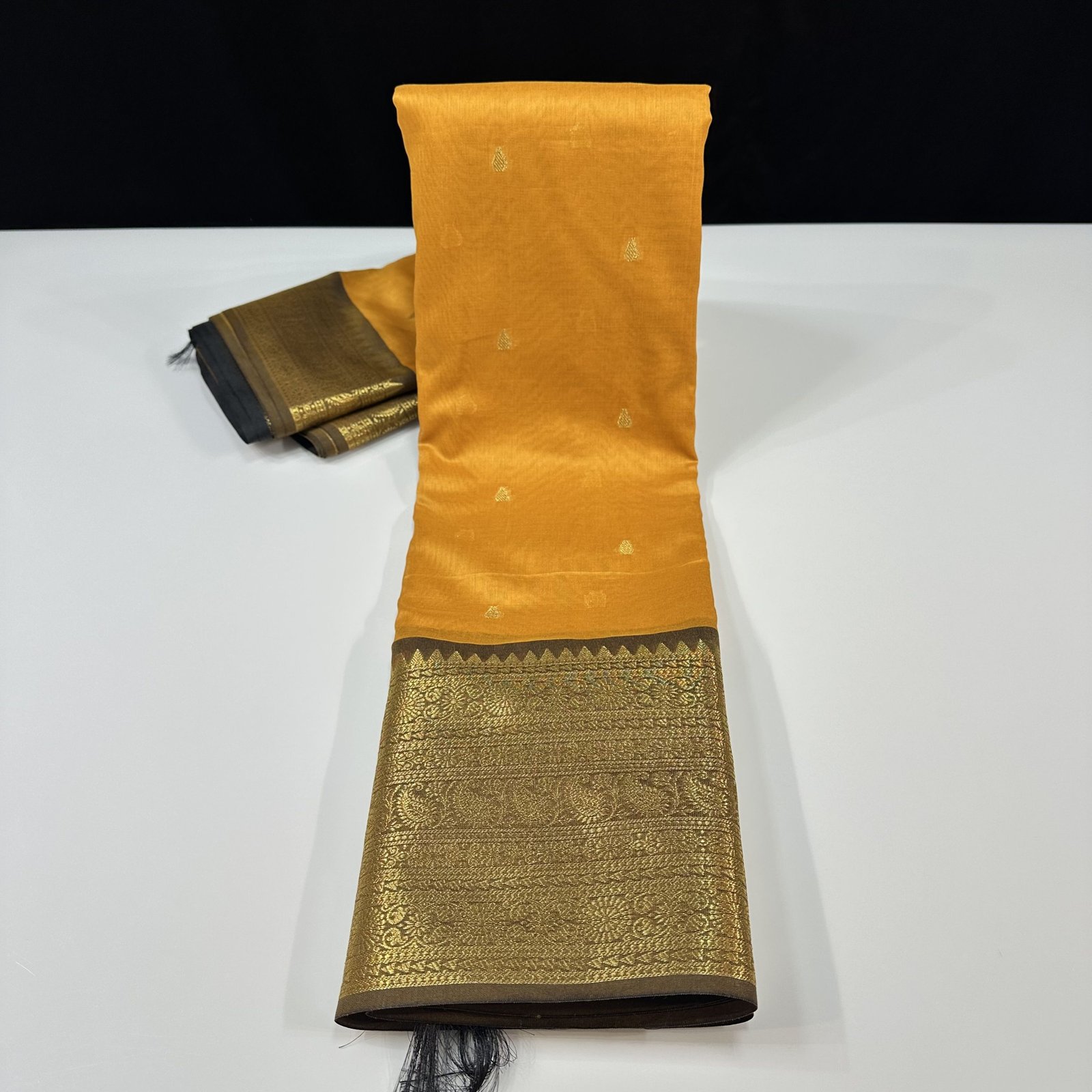 This elegant Banarasi Raw Cotton Silk Saree is a perfect blend of comfort and timeless tradition. Crafted from a premium cotton–silk blend, the saree is exceptionally soft, lightweight, and beautifully finished, making it ideal for all-day wear. The body of the saree is adorned with delicate woven booties, adding a subtle richness and graceful texture throughout. Enhancing its charm is a striking contrast Kanchi-inspired woven border, which brings a touch of classic South Indian artistry to the Banarasi weave. Refined yet effortless, this saree is a wonderful choice for festive gatherings, office wear, or graceful everyday elegance.