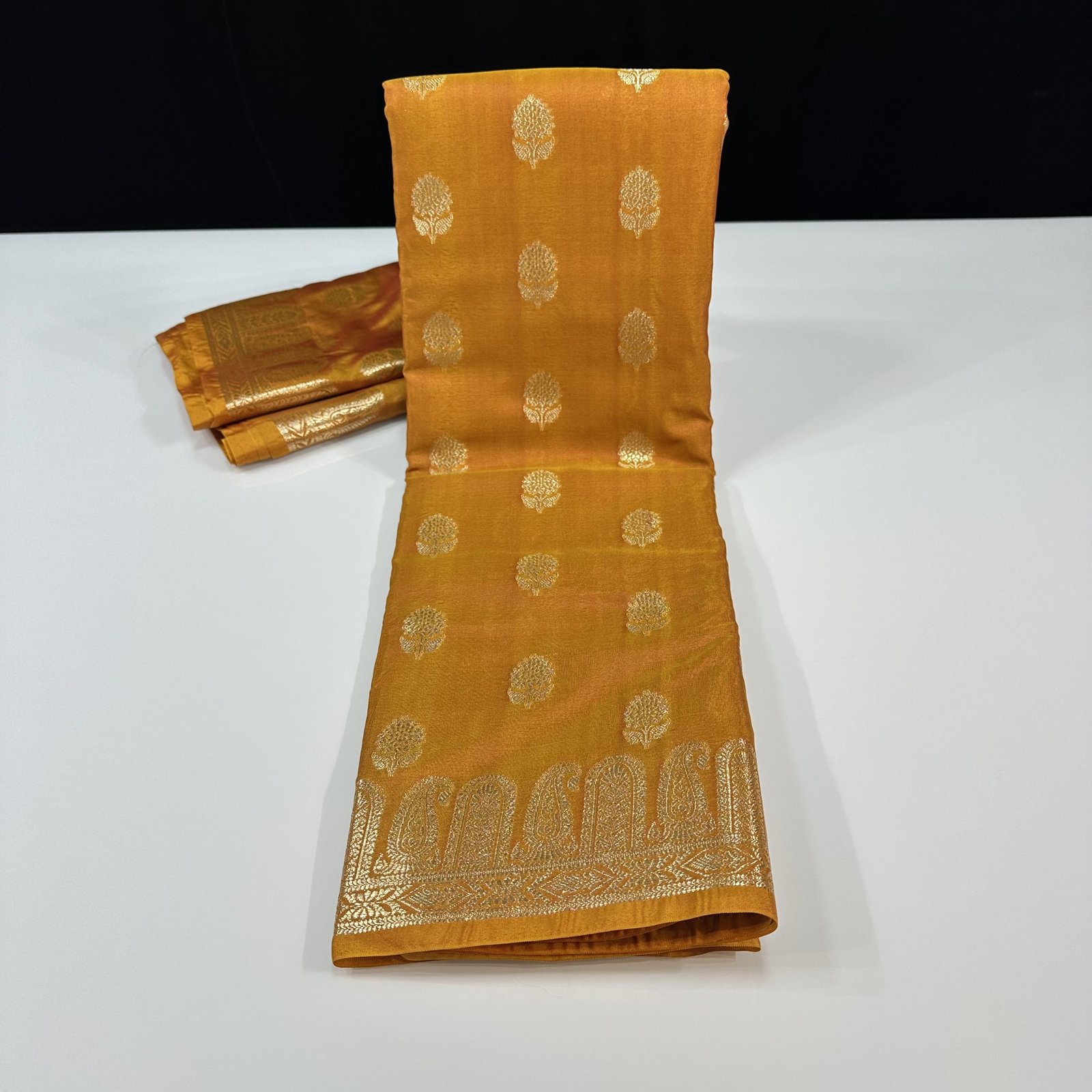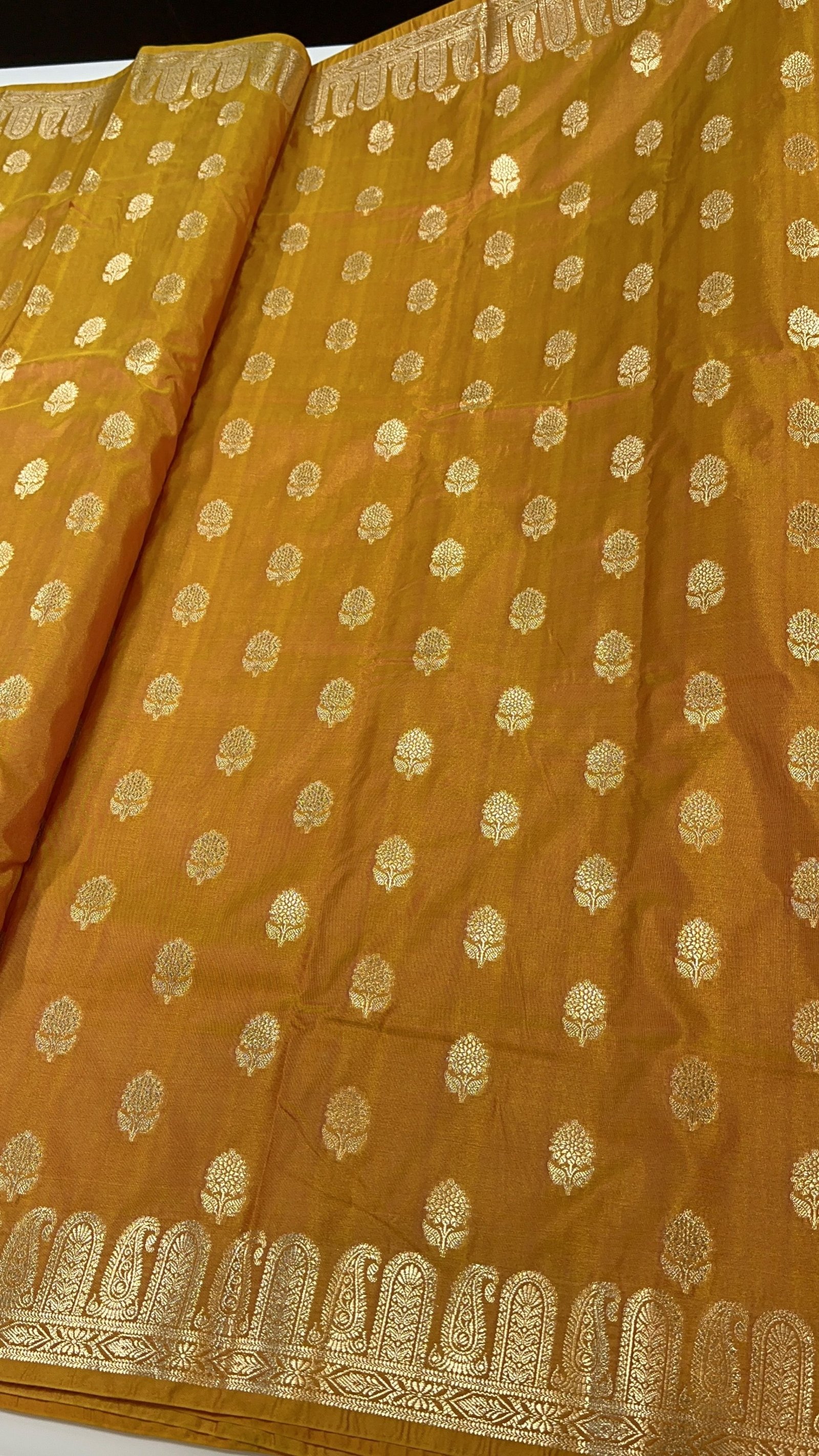 Drape yourself in timeless elegance with this soft Banarasi semi-Katan silk saree, crafted to reflect the richness of traditional Banarasi artistry ✨ The body of the saree is beautifully adorned with intricate zari weaving motifs spread gracefully all over, adding a subtle shimmer and royal charm with every movement. The fine semi-katan silk texture makes it incredibly soft, lightweight, and comfortable to carry — perfect for long celebrations without compromising on style.