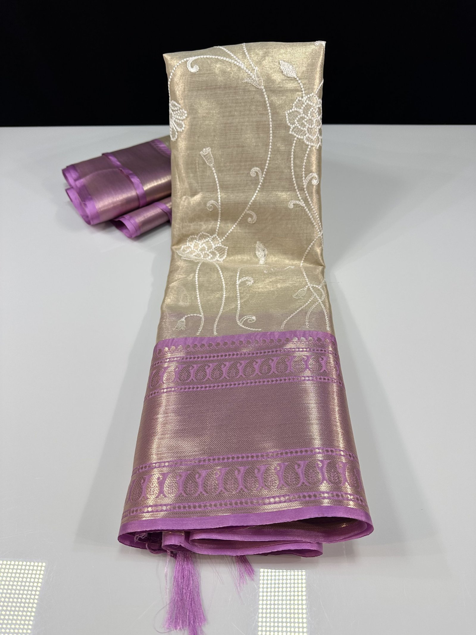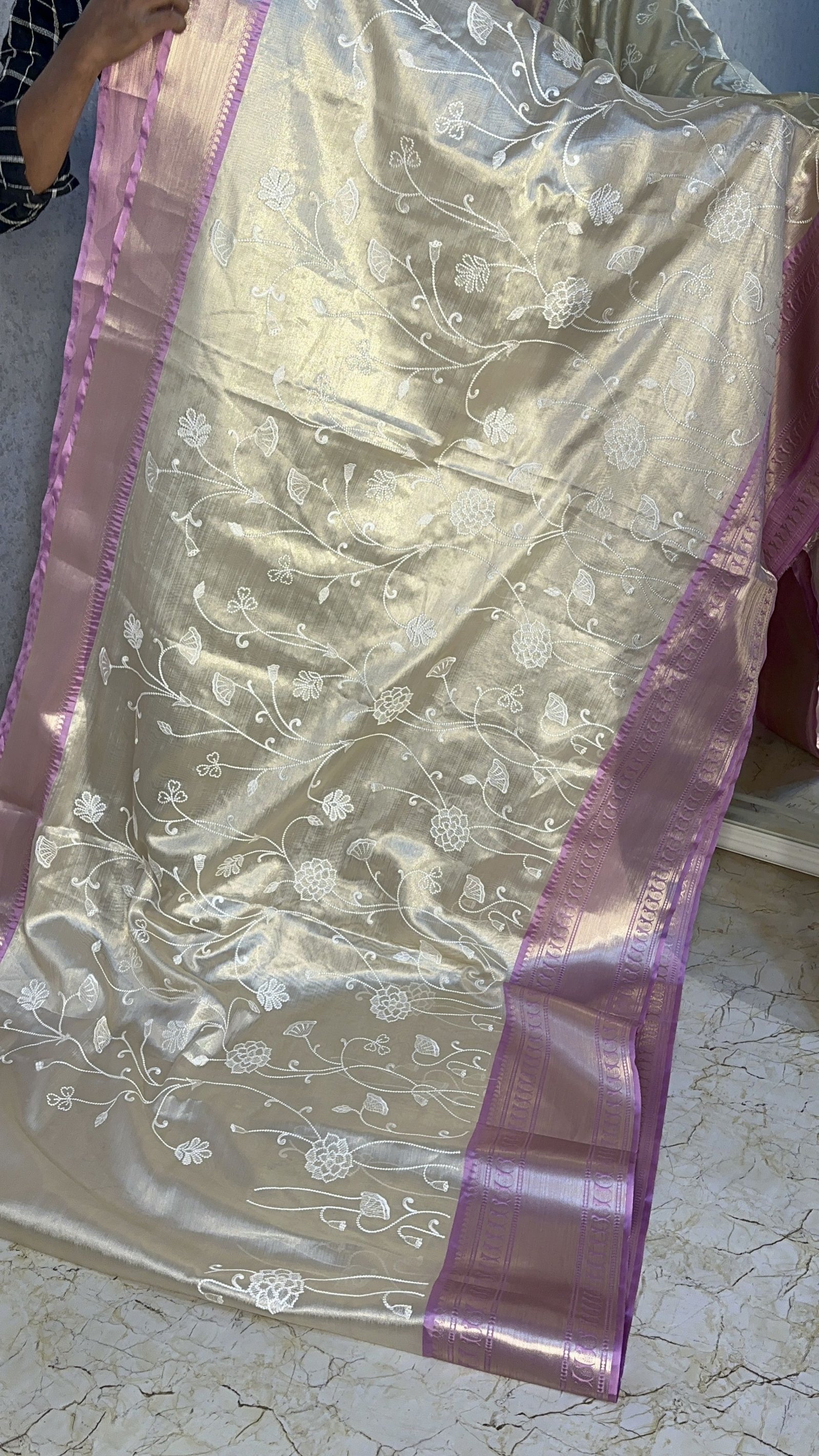 SOFT BANARASI TISSUE SILK SAREE WITH EMBROIDERY JAAL WORK ALLOVER SAREE WITH CONTRAST WEAVING KANCHI BORDER