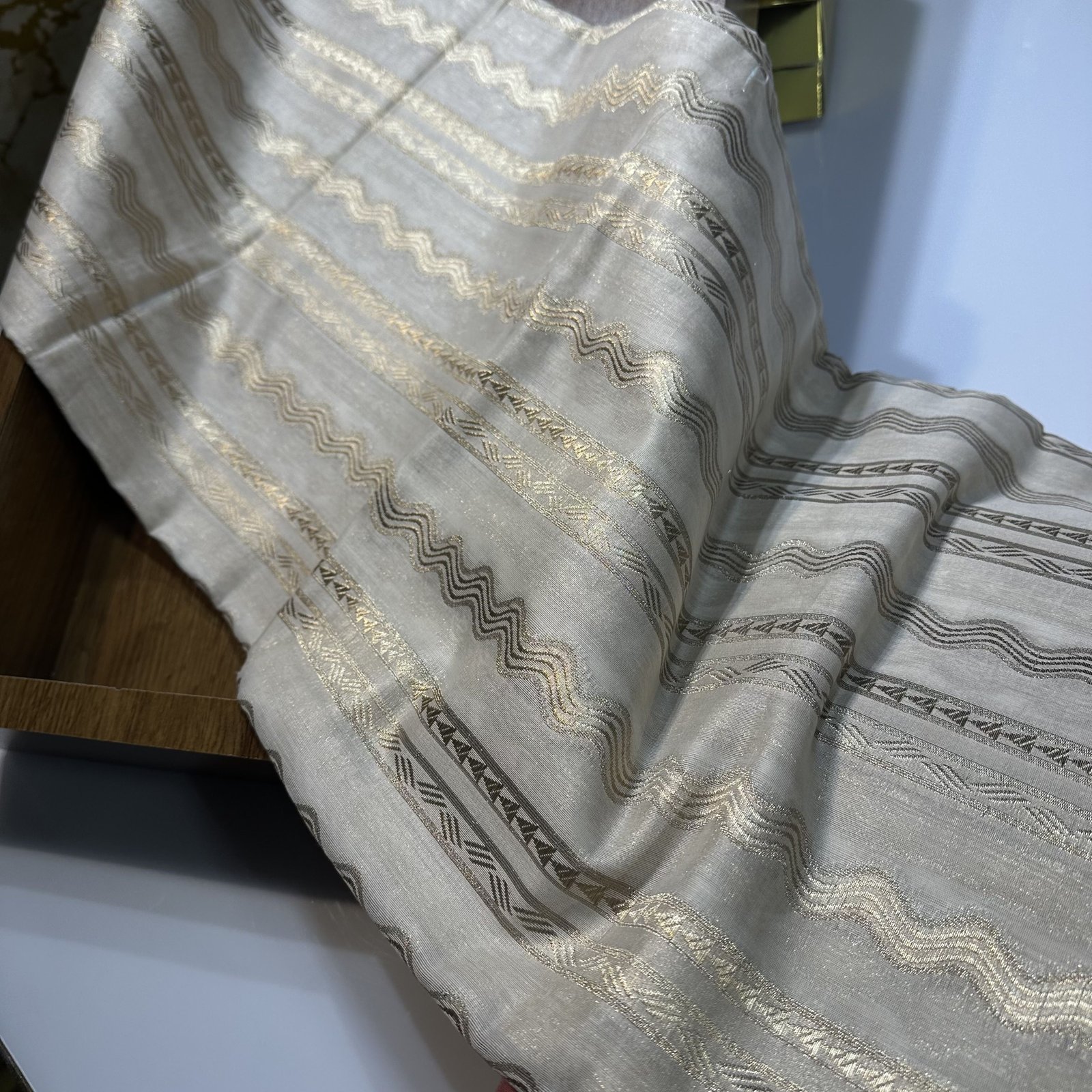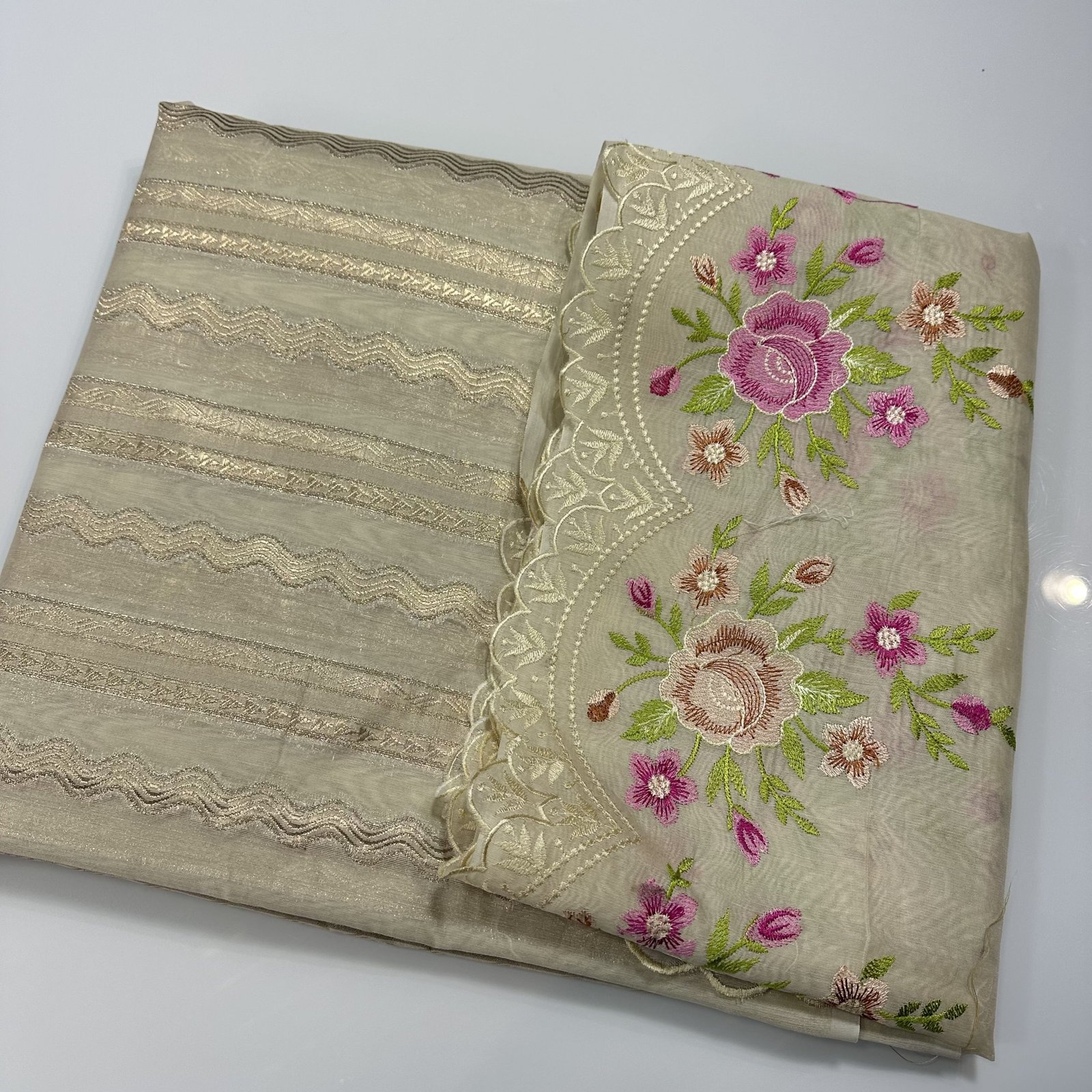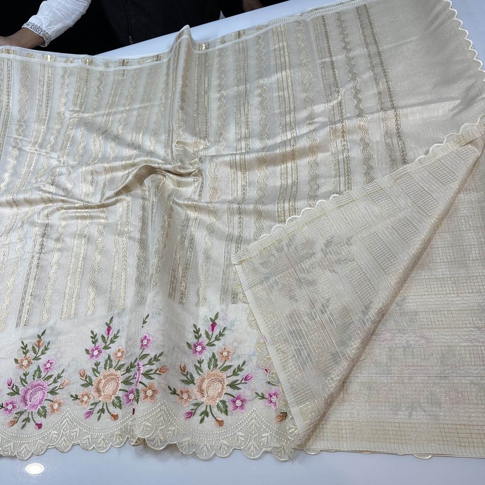Experience timeless elegance with this soft Banarasi cotton saree, beautifully blending comfort with craftsmanship. The body of the saree features delicate zari-woven stripes that add a subtle shimmer and graceful texture to the drape. Highlighting its charm is the intricate meenakari BUTA embroidery adorning both the border and scattered across the saree, bringing vibrant detailing and artisanal finesse. The finely finished scallop border enhances its feminine appeal, giving it a refined and designer touch. Lightweight, breathable, and effortlessly stylish, this saree is perfect for festive gatherings, daytime celebrations, and elegant occasions.