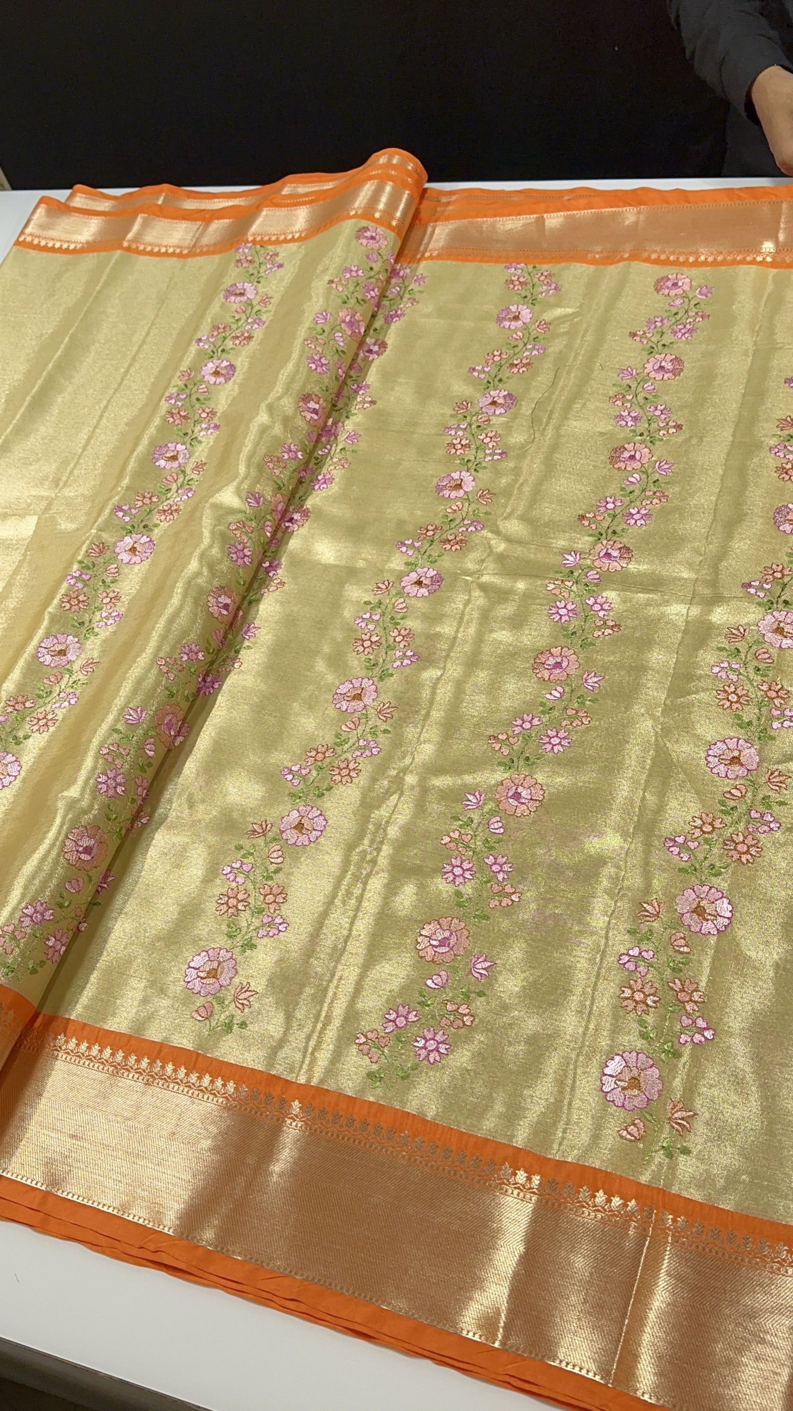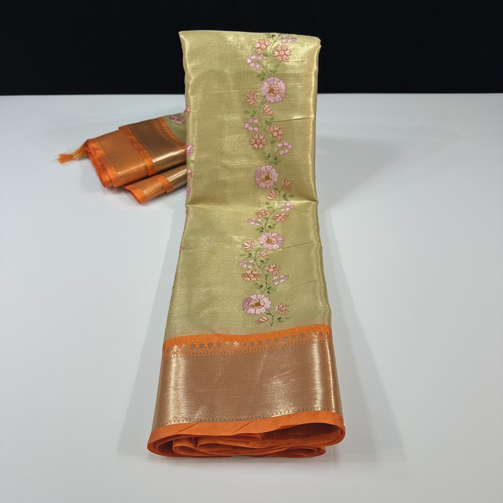 SOFT BANARASI TISSUE SILK SAREE WITH CONTRAST WEAVING SMALL ZARI BORDER WITH EMBROIDERY WORK JAAL OVER BODY