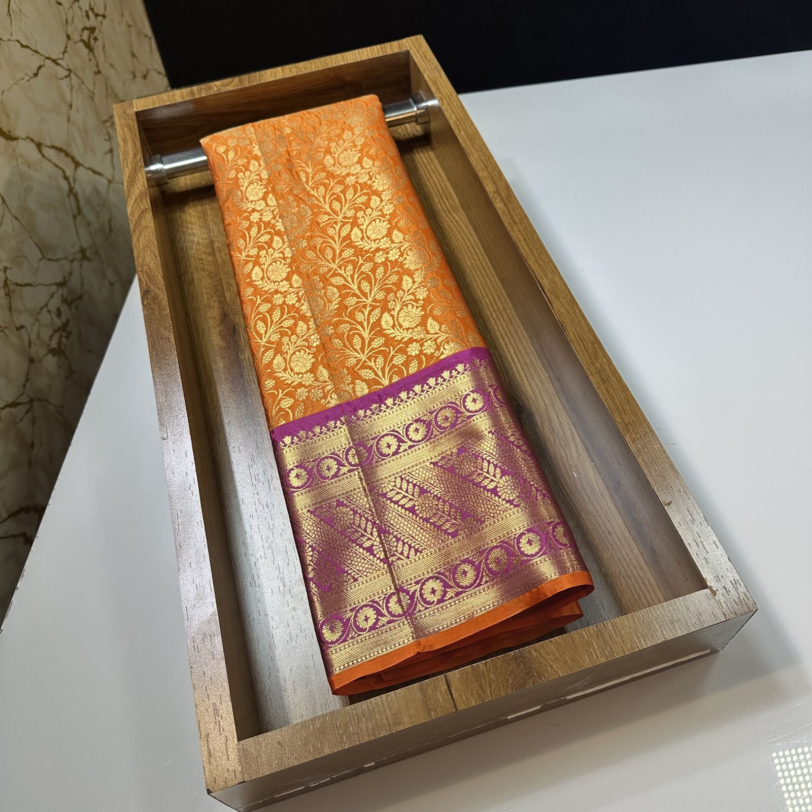 Gracefully blending tradition with thoughtful design innovation, this soft Banarasi semi-silk brocade saree is crafted for refined festive and ceremonial wear. The fabric carries a gentle sheen with a smooth, comfortable drape, making it ideal for long celebrations while maintaining the richness of Banarasi brocade artistry.
