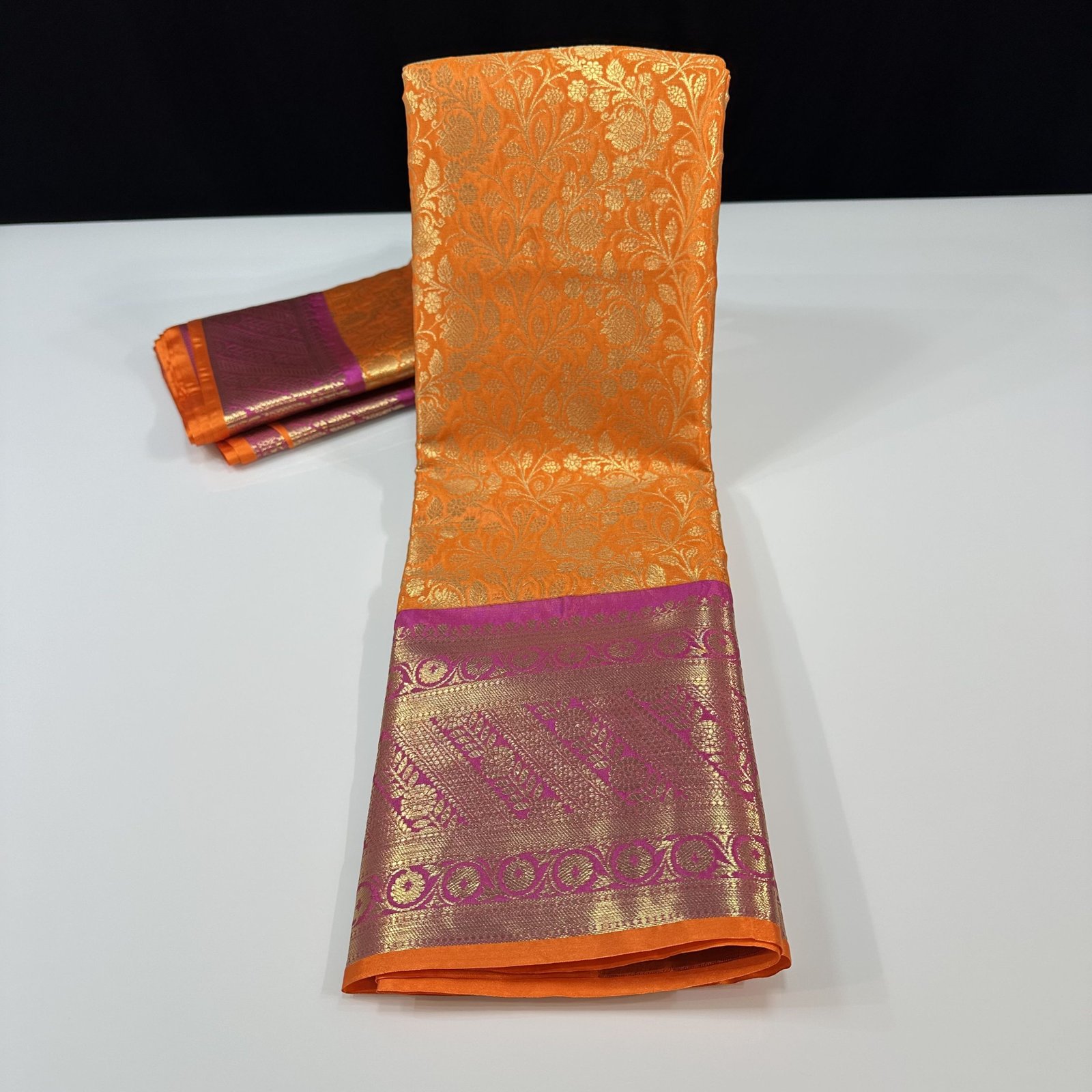 Gracefully blending tradition with thoughtful design innovation, this soft Banarasi semi-silk brocade saree is crafted for refined festive and ceremonial wear. The fabric carries a gentle sheen with a smooth, comfortable drape, making it ideal for long celebrations while maintaining the richness of Banarasi brocade artistry.