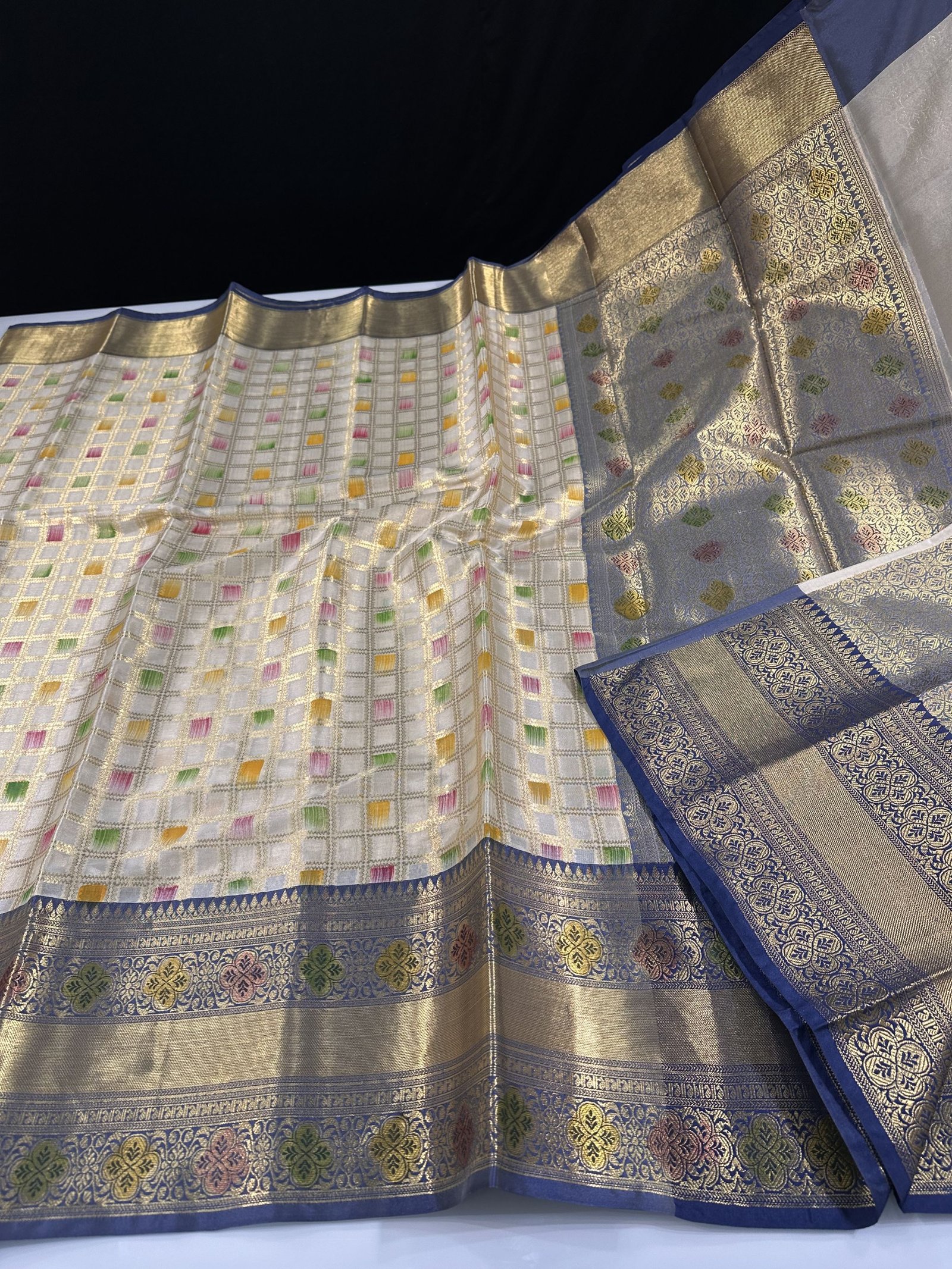 HAND PAINTED FLORAL BRUSHINGS IN BETWEEN ALLOVER CHECKS SAREE