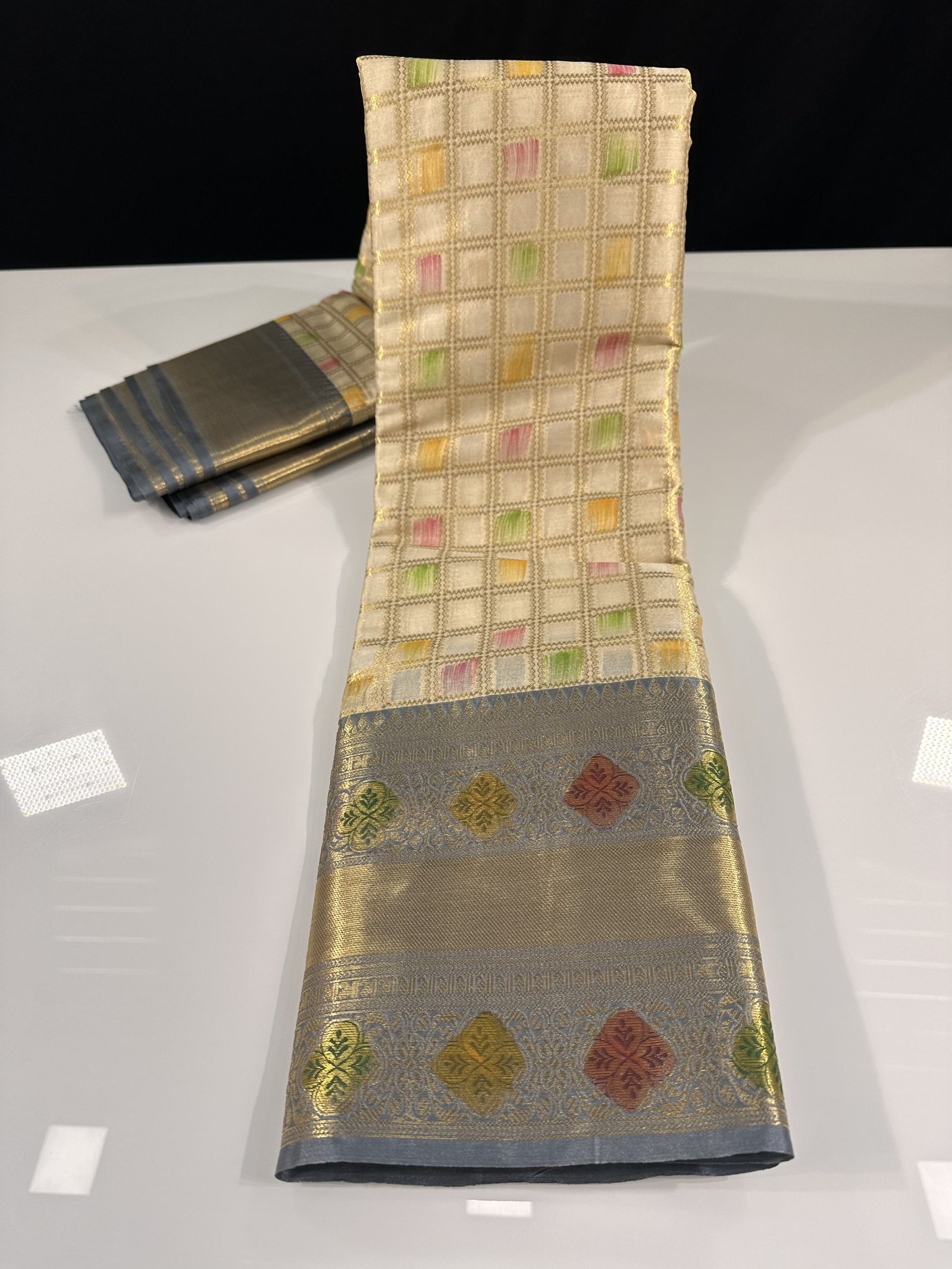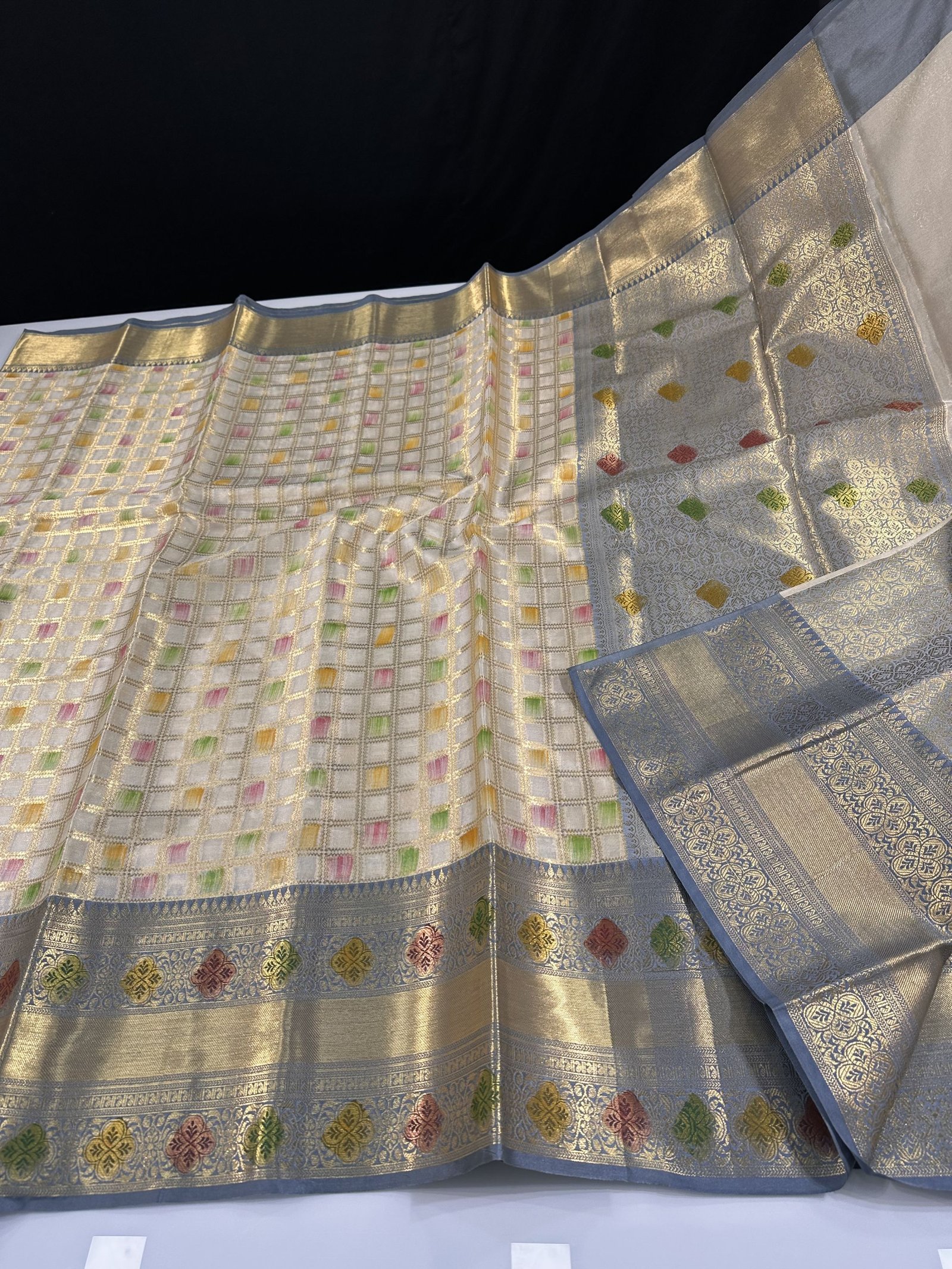 HAND PAINTED FLORAL BRUSHINGS IN BETWEEN ALLOVER CHECKS SAREE