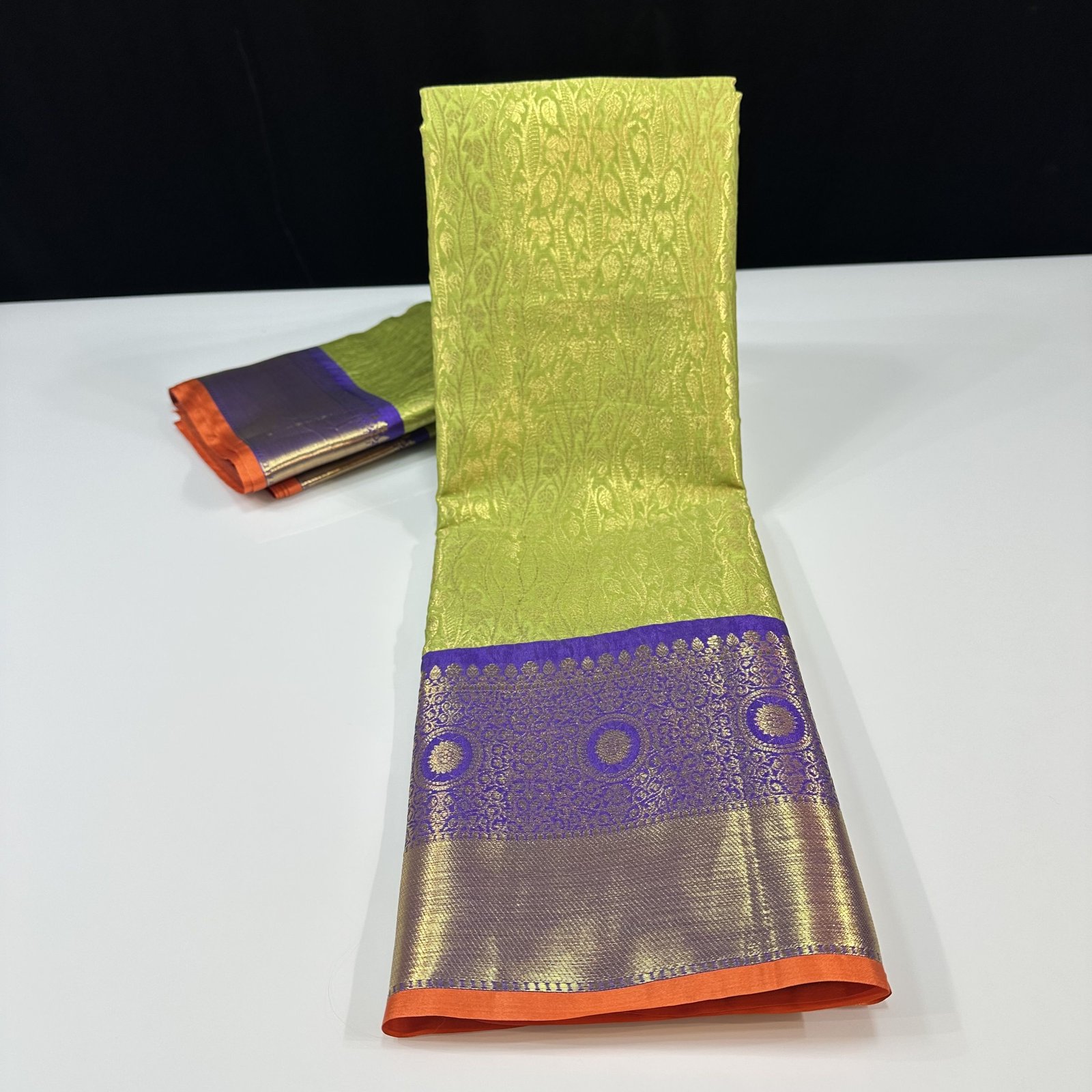 Gracefully blending tradition with thoughtful design innovation, this soft Banarasi semi-silk brocade saree is crafted for refined festive and ceremonial wear. The fabric carries a gentle sheen with a smooth, comfortable drape, making it ideal for long celebrations while maintaining the richness of Banarasi brocade artistry.
