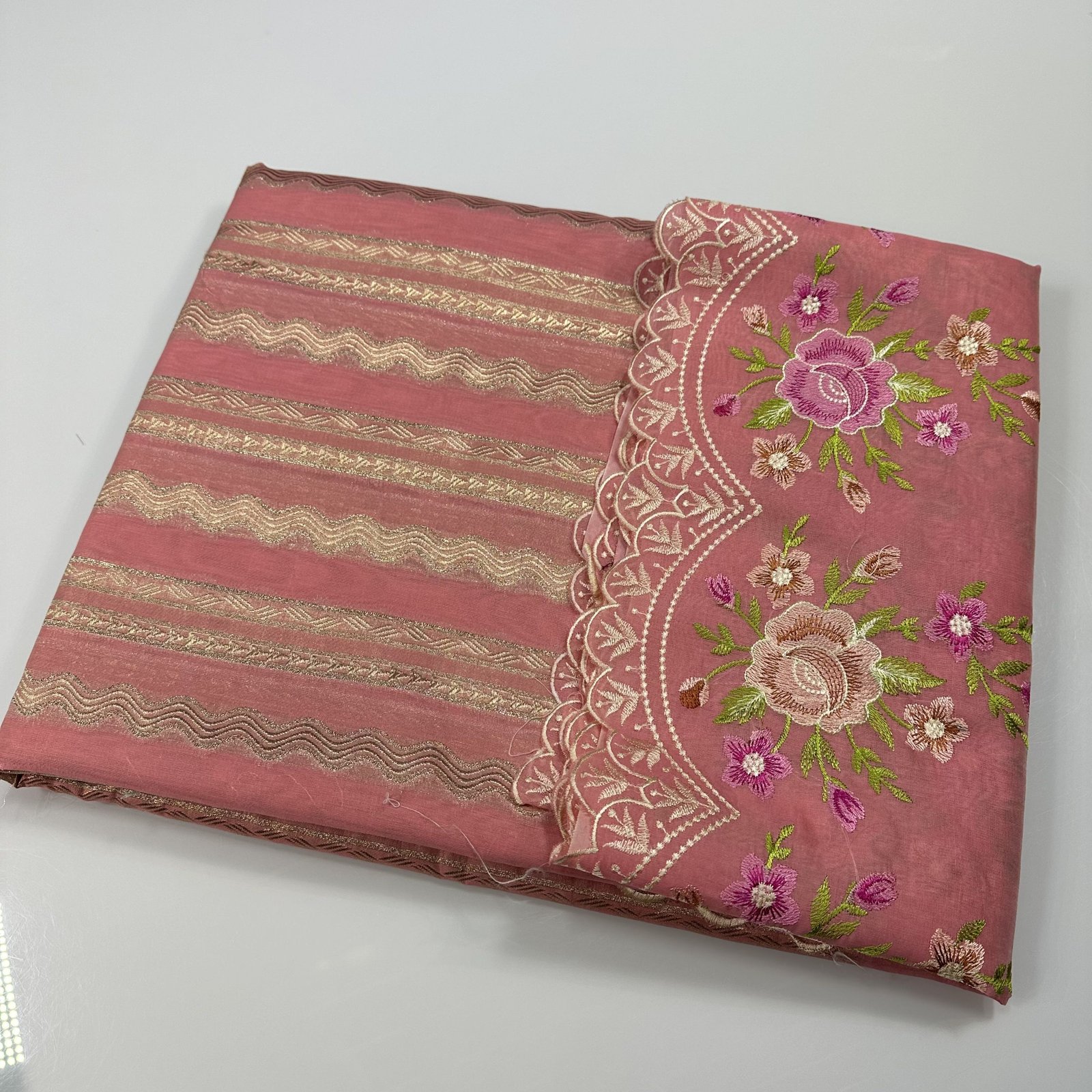 Experience timeless elegance with this soft Banarasi cotton saree, beautifully blending comfort with craftsmanship. The body of the saree features delicate zari-woven stripes that add a subtle shimmer and graceful texture to the drape. Highlighting its charm is the intricate meenakari BUTA embroidery adorning both the border and scattered across the saree, bringing vibrant detailing and artisanal finesse. The finely finished scallop border enhances its feminine appeal, giving it a refined and designer touch. Lightweight, breathable, and effortlessly stylish, this saree is perfect for festive gatherings, daytime celebrations, and elegant occasions.