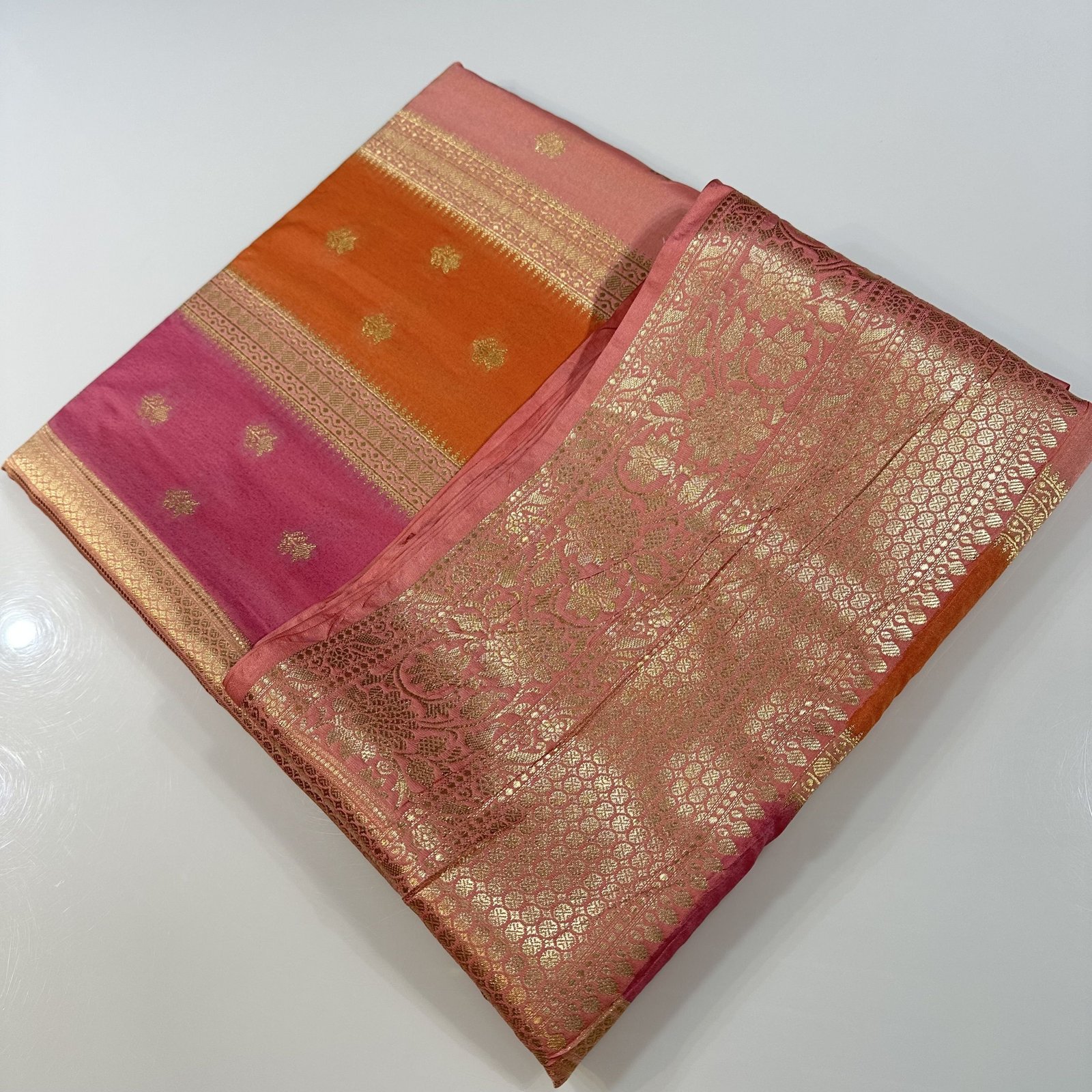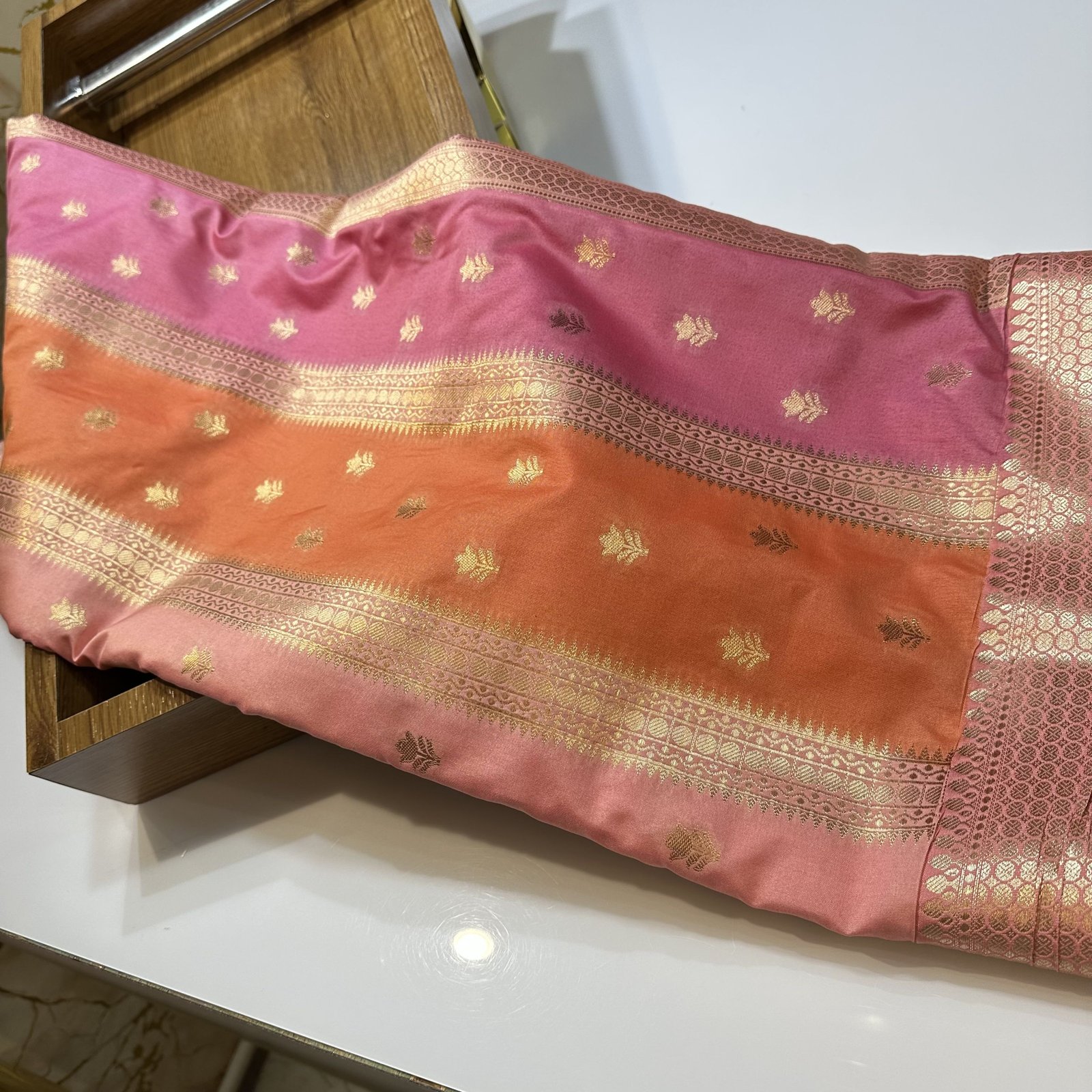 a soft Banarasi semi-katan silk saree that beautifully blends traditional weaving with artistic expression.
