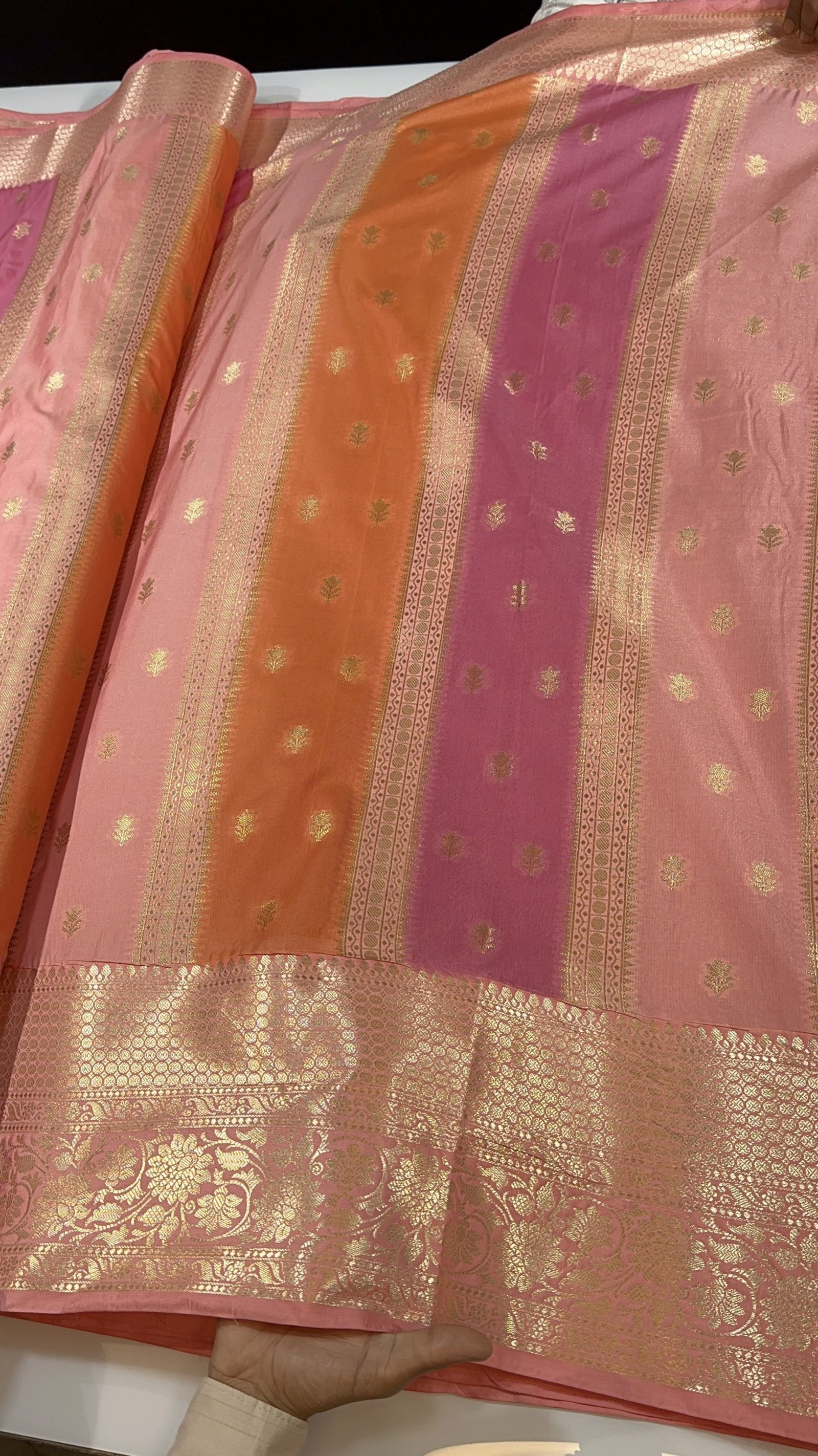 A soft Banarasi semi-katan silk saree that beautifully blends traditional weaving with artistic expression. The body of the saree features elegant zari weaving stripes running gracefully throughout, highlighted with intricately crafted zari buta motifs that add richness and depth. The semi-katan silk fabric is soft, smooth, and luxurious, offering a refined drape with a graceful fall.