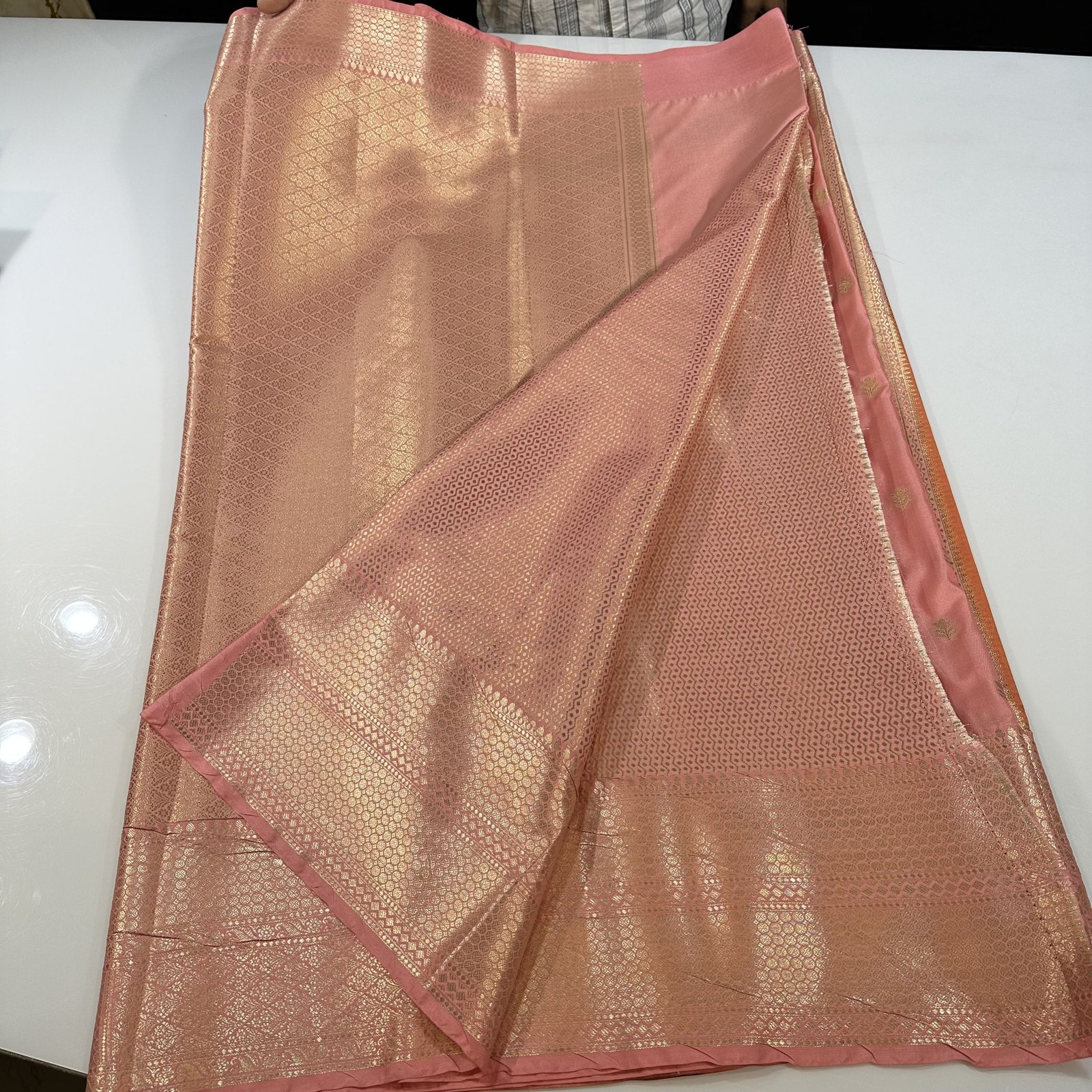 The body of the saree features elegant zari weaving stripes running gracefully throughout, highlighted with intricately crafted zari buta motifs that add richness and depth. The semi-katan silk fabric is soft, smooth, and luxurious, offering a refined drape with a graceful fall.