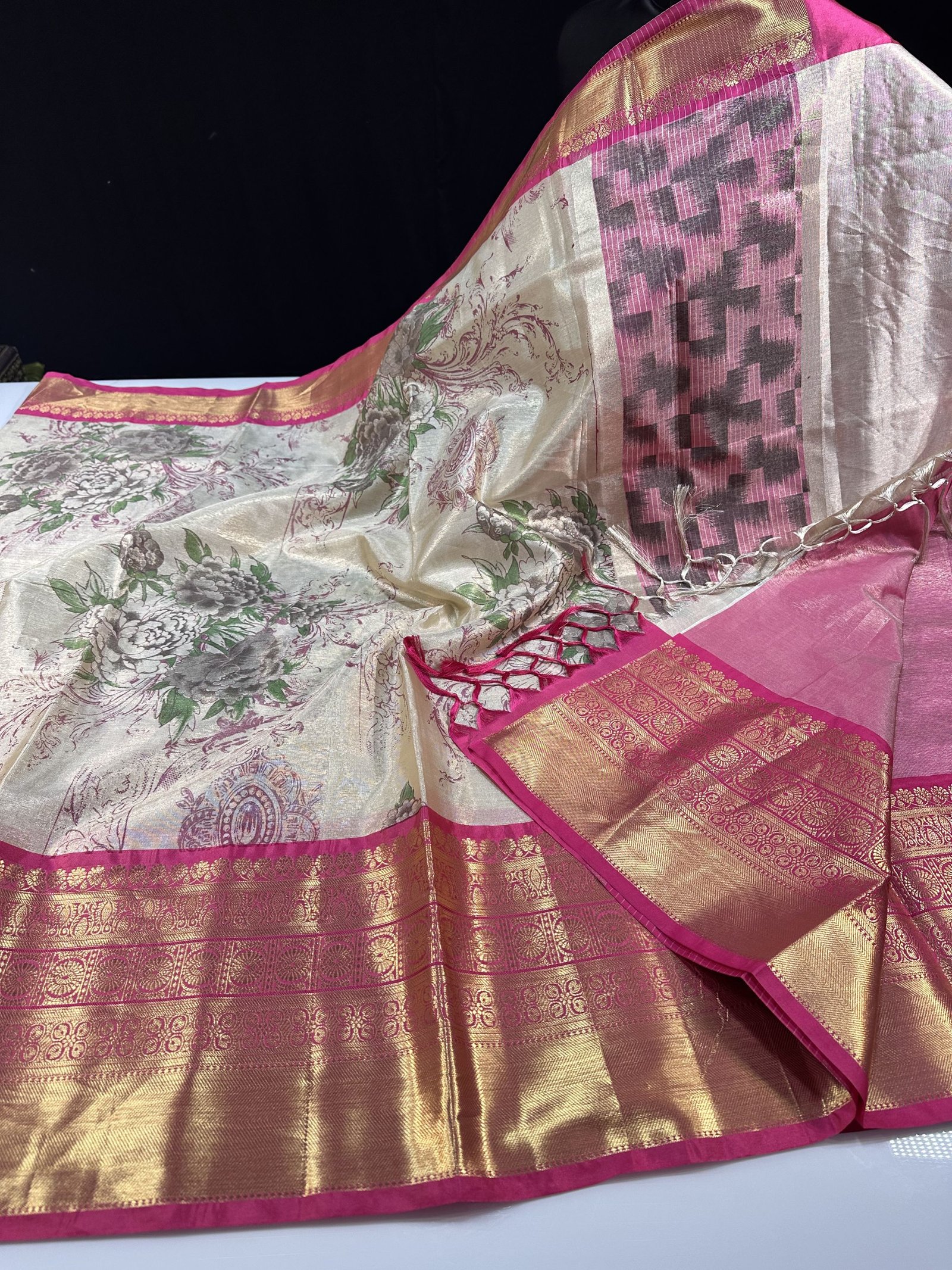 SOFT BANARASI TISSUE SILK SAREE WITH DIGITAL PRINTED JAAL ALLOVER SAREE