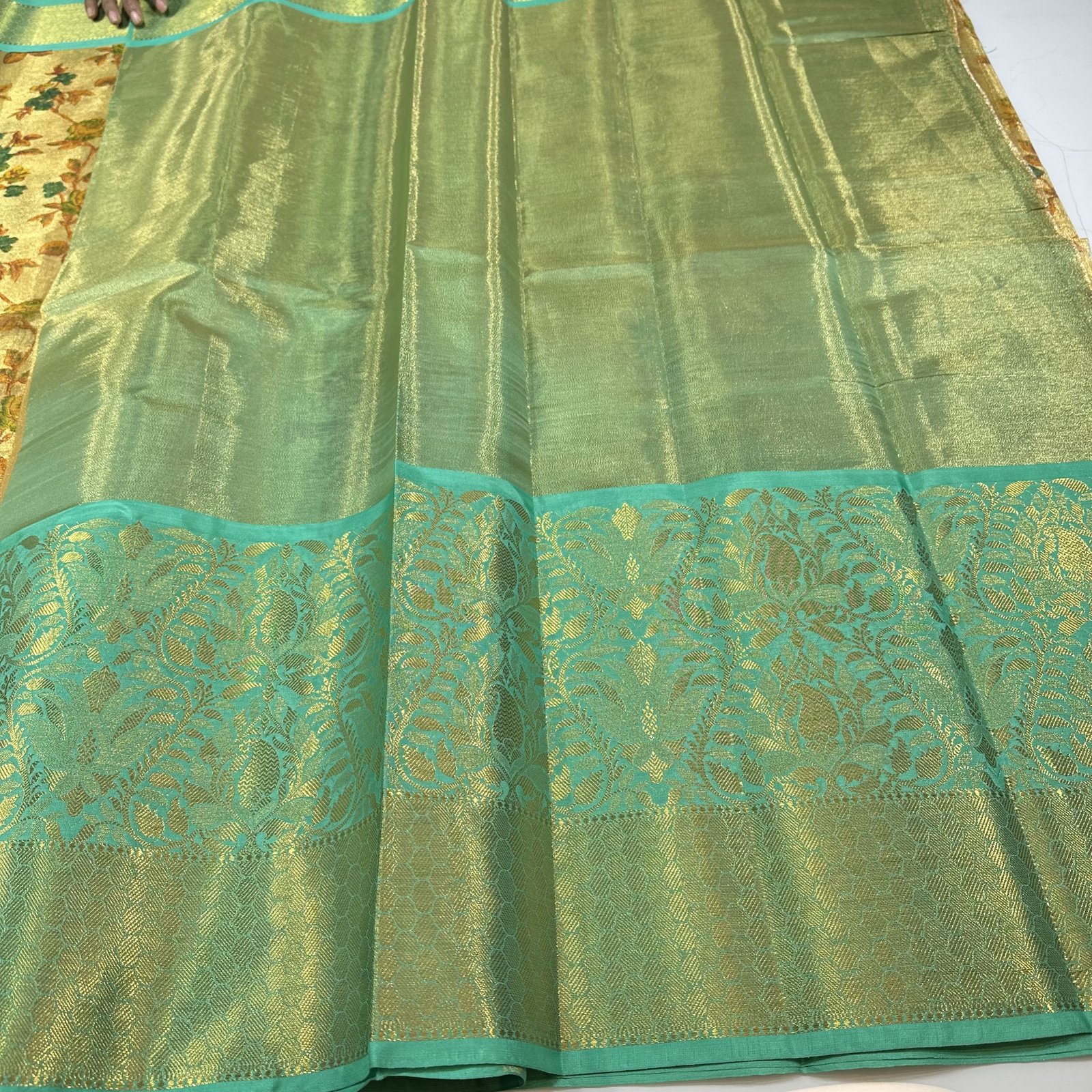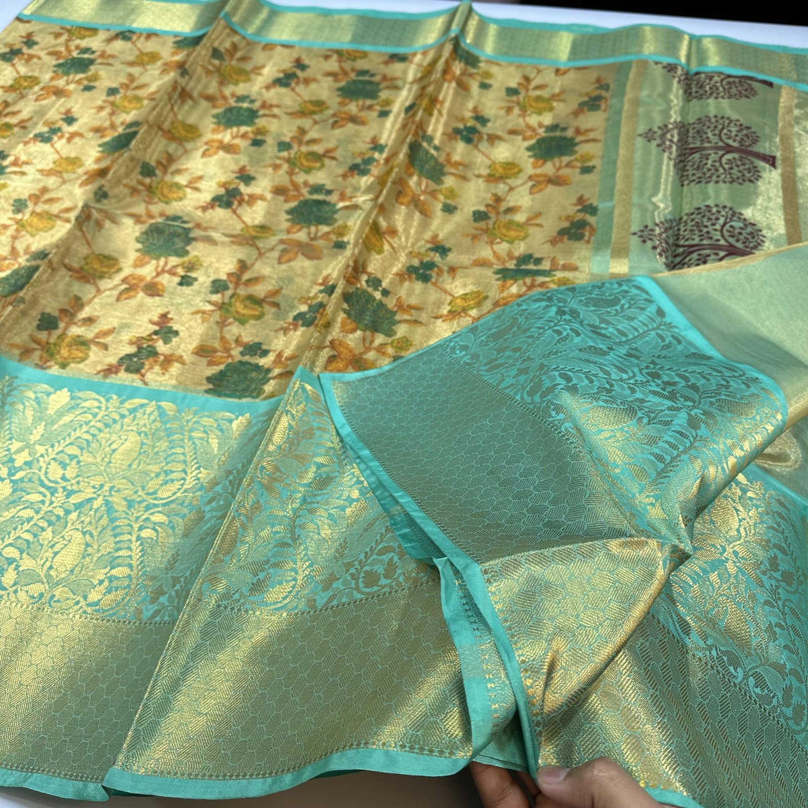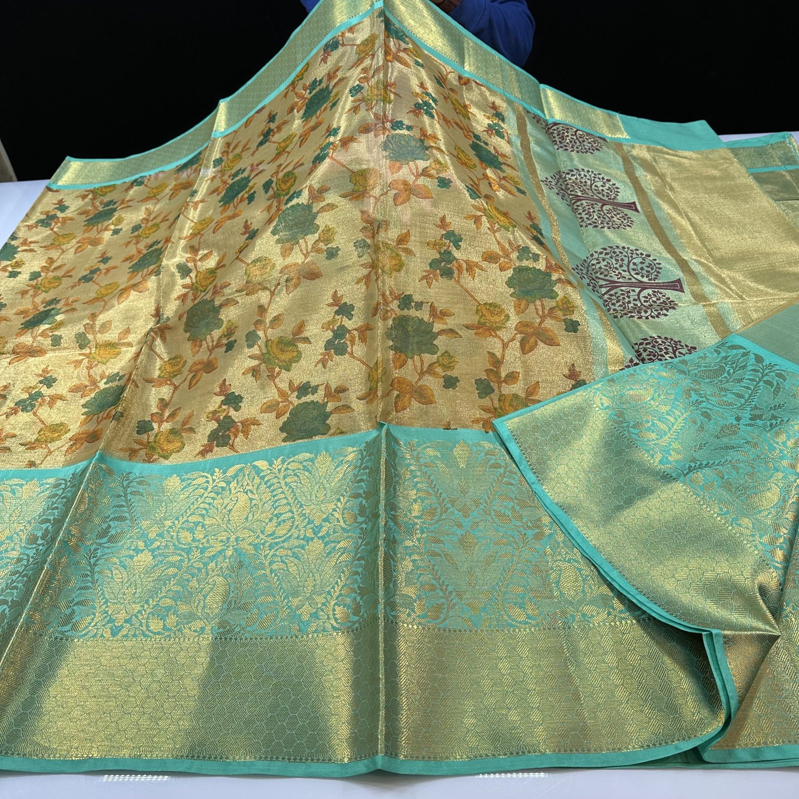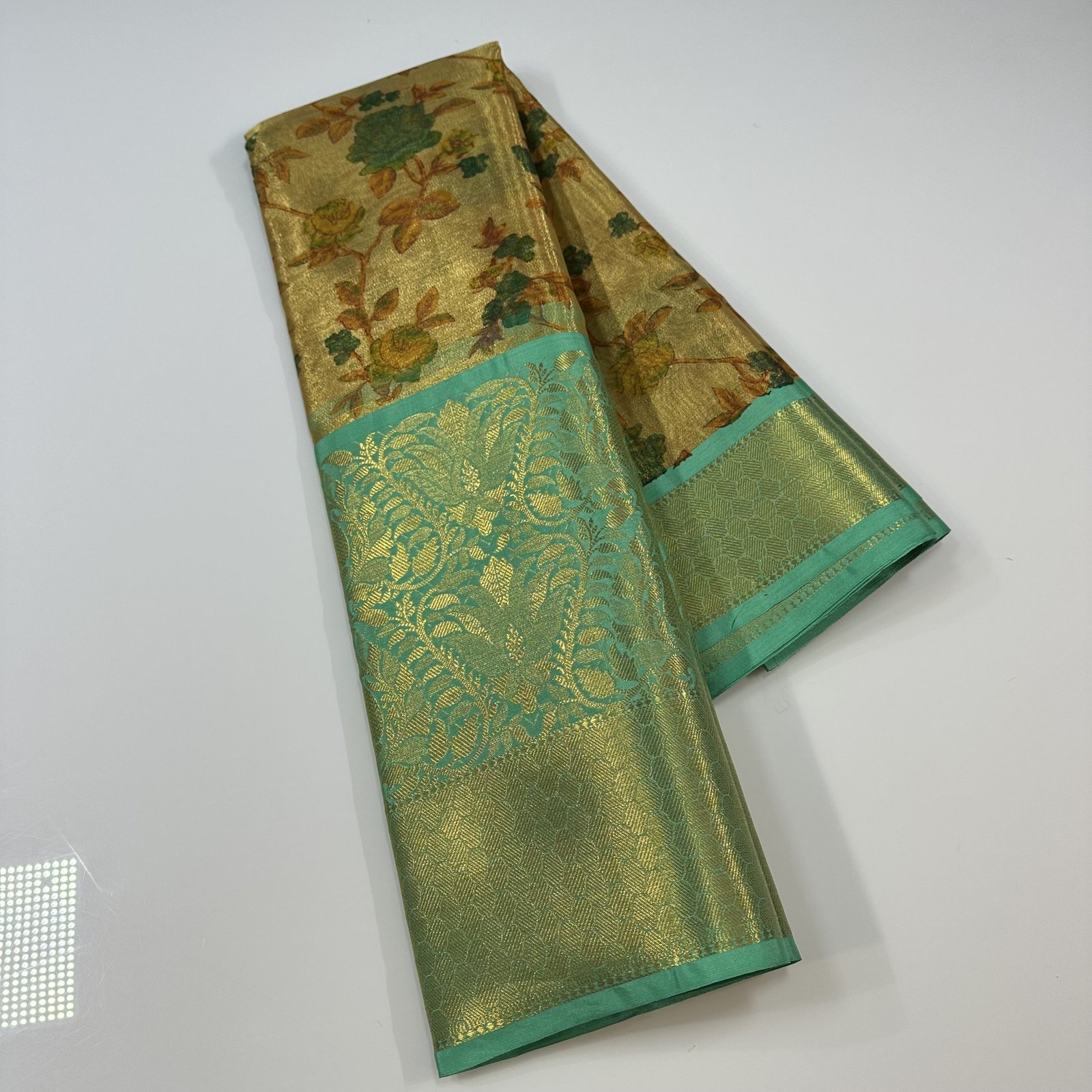 This exquisite Banarasi Tissue Silk Saree in a luminous golden shade embodies understated luxury and timeless charm. The delicate tissue silk fabric offers a graceful sheen and a lightweight drape, making it perfect for refined festive and special occasions.