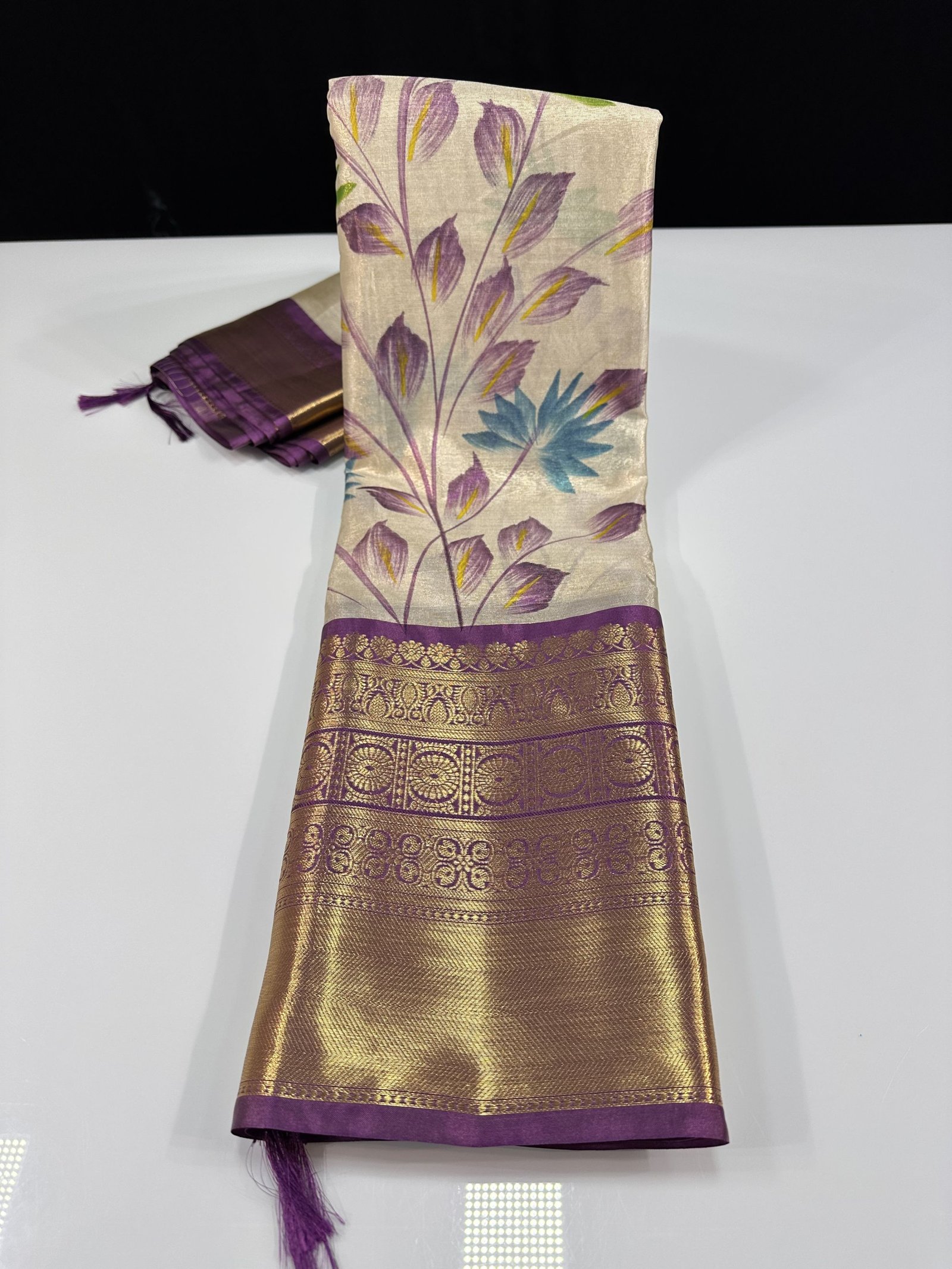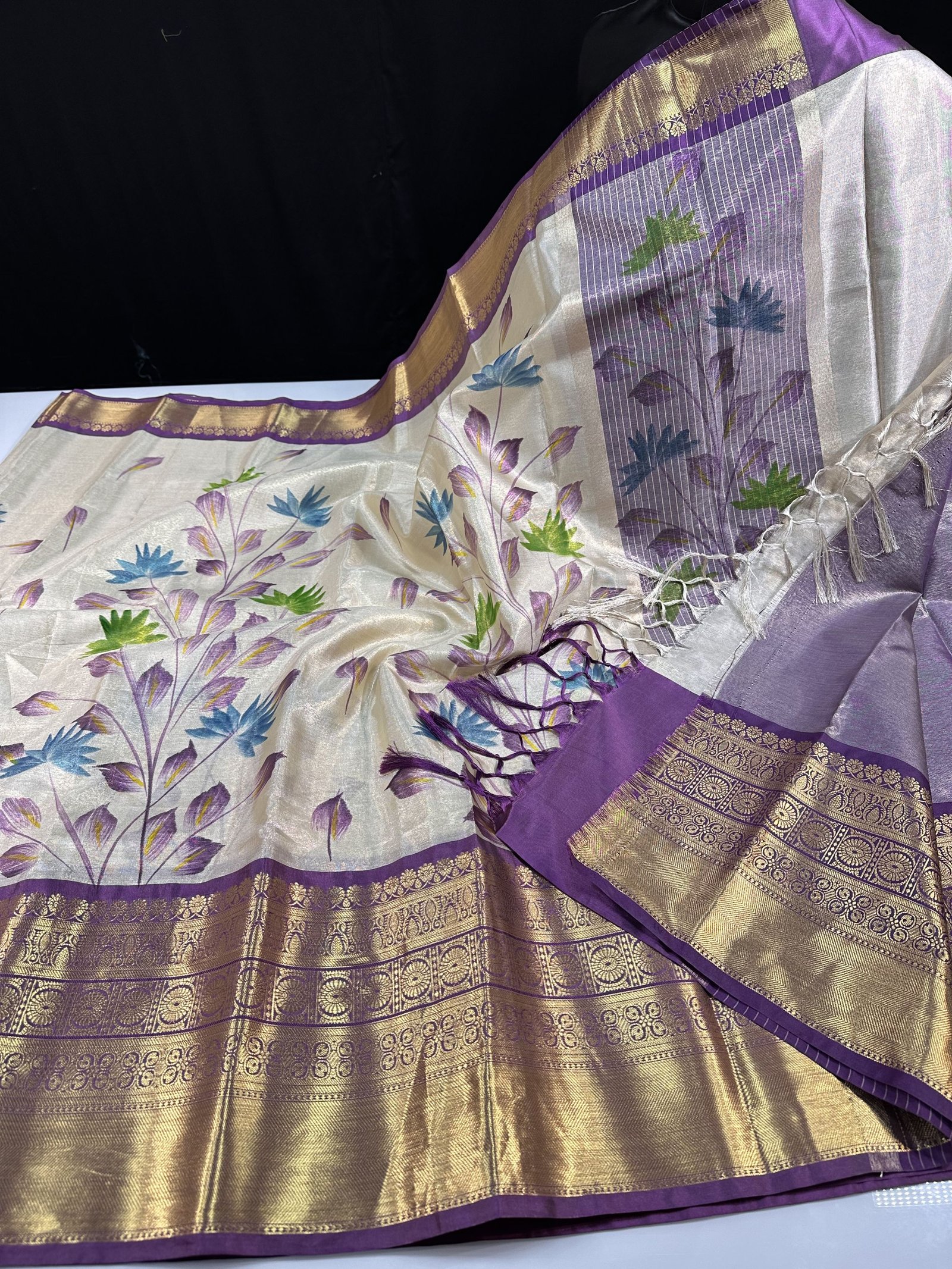 A soft and lightweight Banarasi tissue silk saree featuring an elegant hand-painted jaal pattern flowing across the body. The delicate artwork is beautifully complemented by a contrast border inspired by classic Kanchi designs, adding a refined traditional touch. Easy to drape and graceful in appeal, this saree is perfect for effortless elegance with artistic charm.