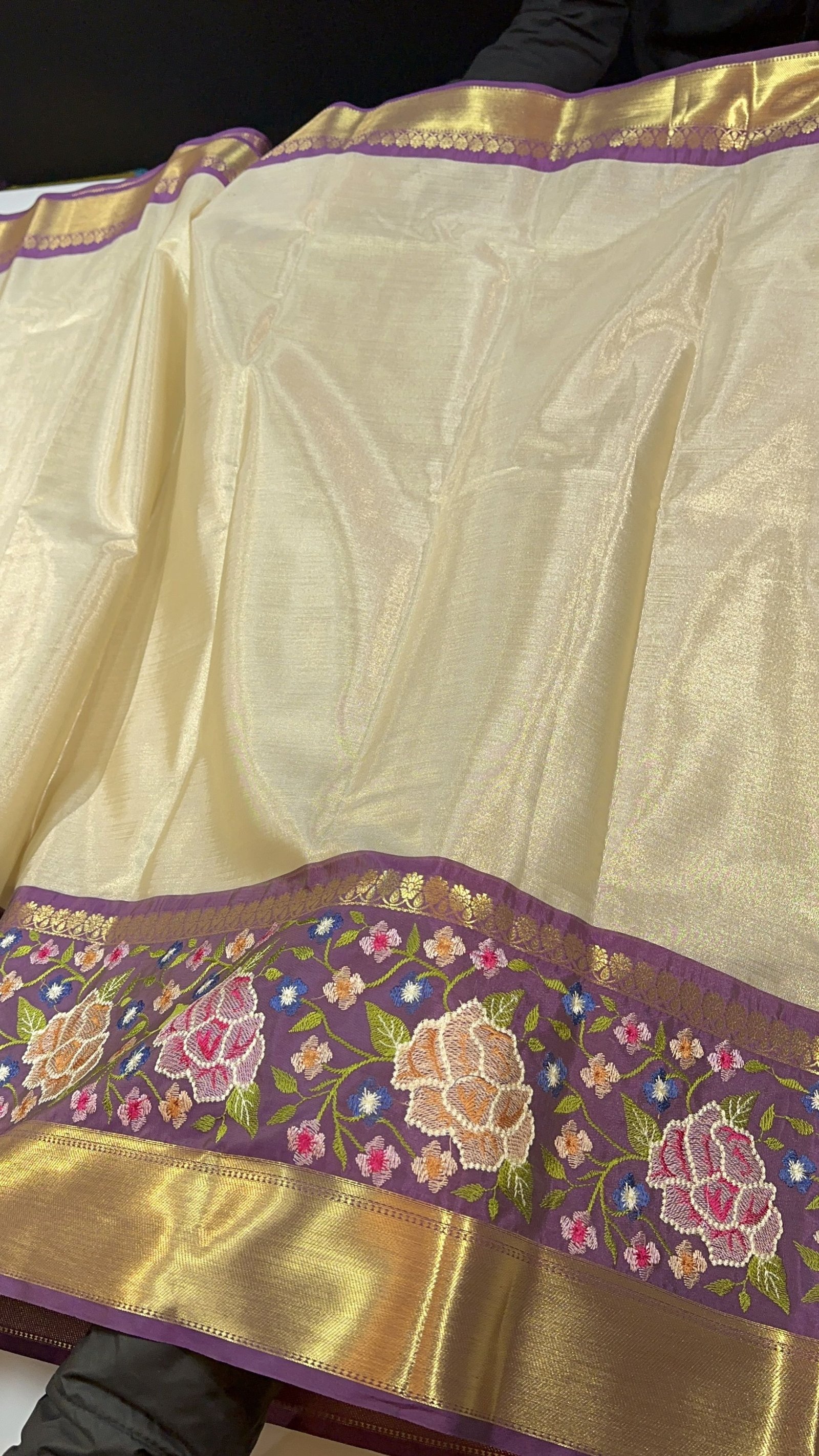 This exquisite Banarasi Tissue Silk Saree radiates elegance with its luminous texture and refined craftsmanship. Woven in rich tissue silk, the saree carries a subtle sheen and a lightweight, graceful drape that feels effortlessly luxurious. The saree is beautifully framed with a contrast Kanchi-inspired border, adding depth and traditional grandeur to the overall look. Enhancing its uniqueness, intricate embroidery work delicately placed in between the border lends an artistic touch, creating a perfect harmony between weaving and hand embellishment. Sophisticated yet timeless, this saree is an ideal choice for festive occasions, celebrations, and elegant evening wear.