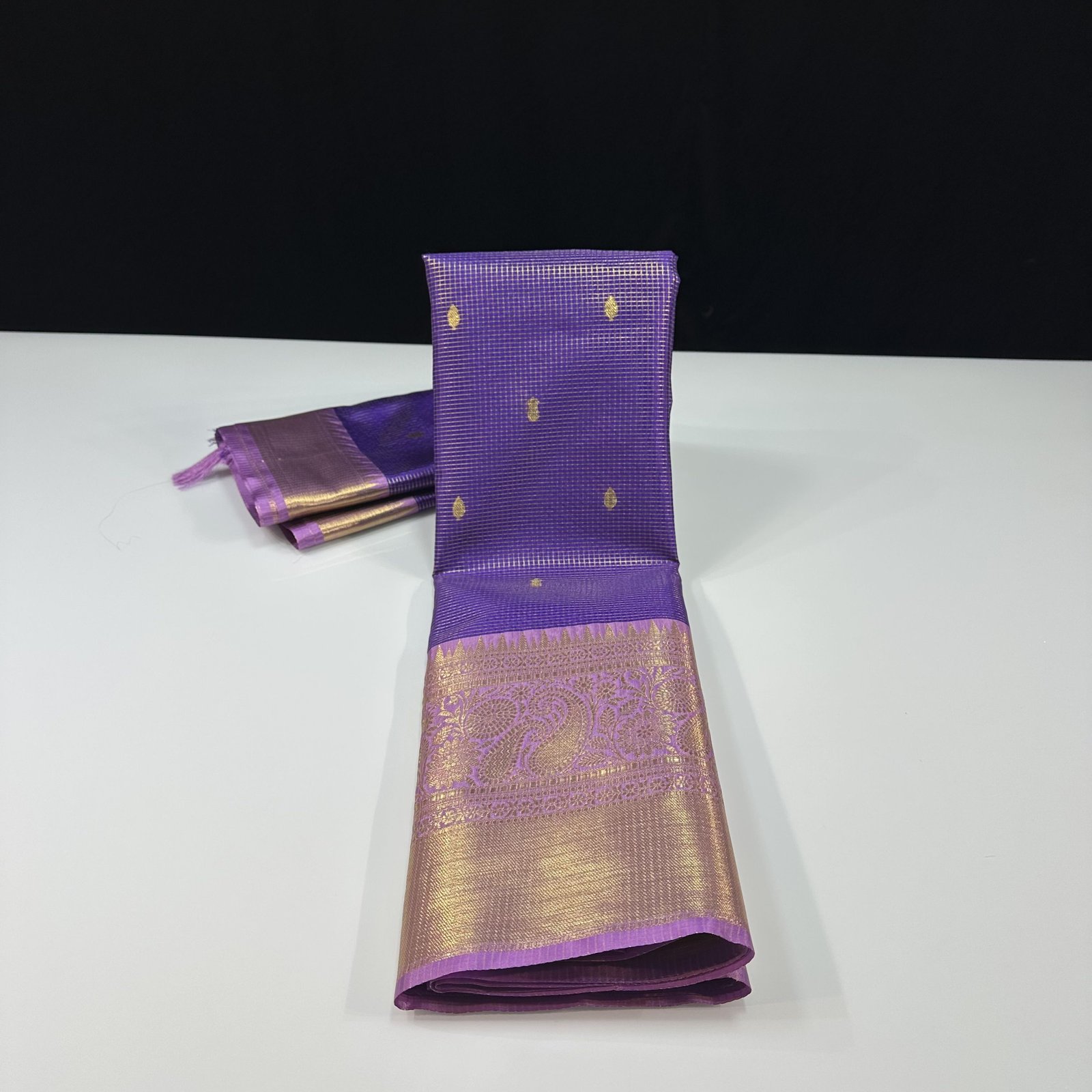A graceful blend of nostalgia and craftsmanship, this vintage-inspired mini checks saree brings timeless charm to contemporary dressing. The finely woven mini check pattern lends a subtle texture and classic appeal across the body, evoking old-world elegance with a refined finish. Accentuating the saree is a beautifully contrast-woven Kanchi border, crafted with traditional precision, adding depth, richness, and a striking frame to the drape. Perfect for those who appreciate heritage aesthetics with understated sophistication, this saree is ideal for festive occasions, cultural gatherings, and elegant day wear.