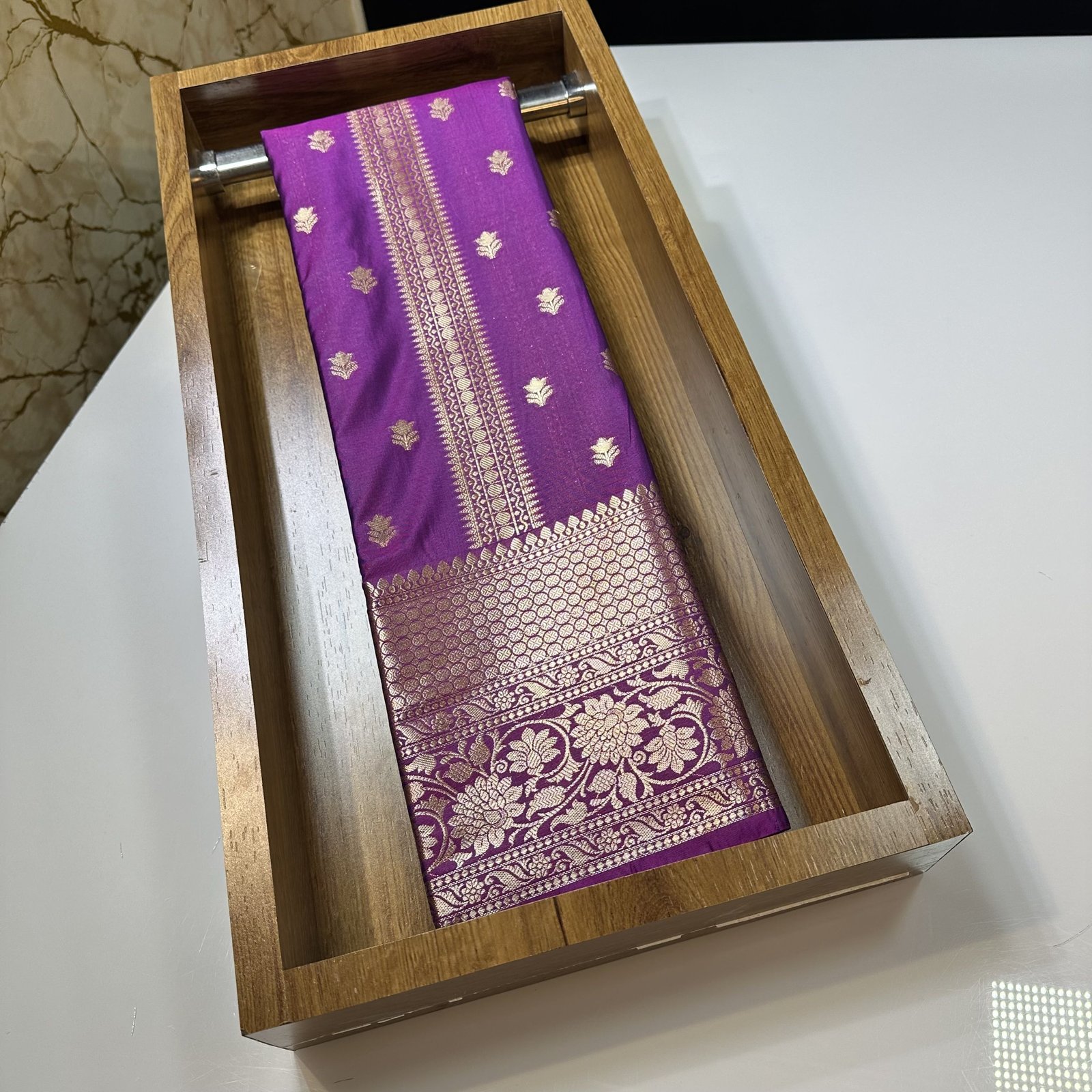 The highlight of the saree is its grand and richly woven pallu, designed to make a statement with traditional Banarasi finesse. It adds depth, richness, and festive grandeur, making the saree perfect for both special occasions and graceful everyday elegance.